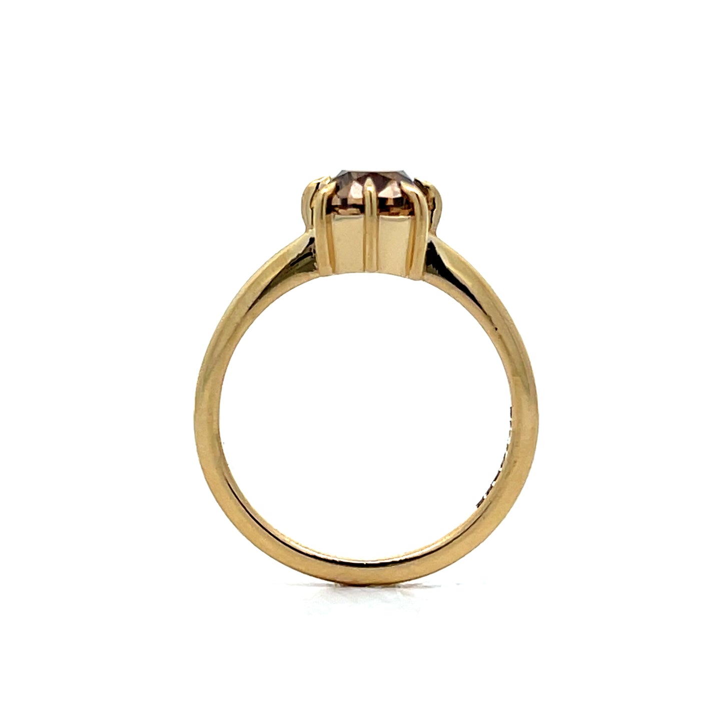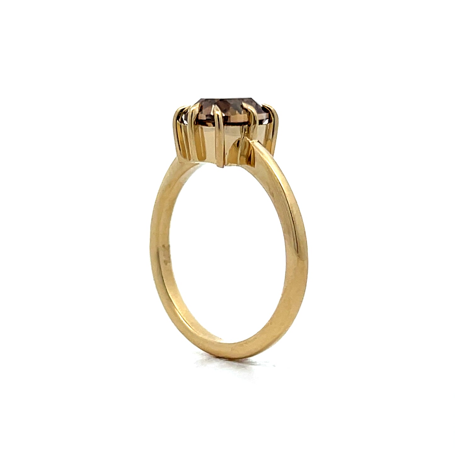 This solitaire engagement ring features a 1.93 carat cushion cut diamond with a rare fancy brown color and VS2 clarity. The diamond sits in an eight-prong basket setting that highlights its elongated cushion shape while keeping it secure. Made by Filigree, the setting shows off the diamond's fire and brightness as it catches the light from different angles. The 14 Karat Yellow Gold band measures 2.0 mm wide, providing a comfortable fit and creating a nice contrast with the brown diamond. The smooth, polished band complements the diamond without taking attention away from the main stone. This ring combines a big, eye-catching center stone with a simple band design that lets the rare fancy brown diamond stand out.
