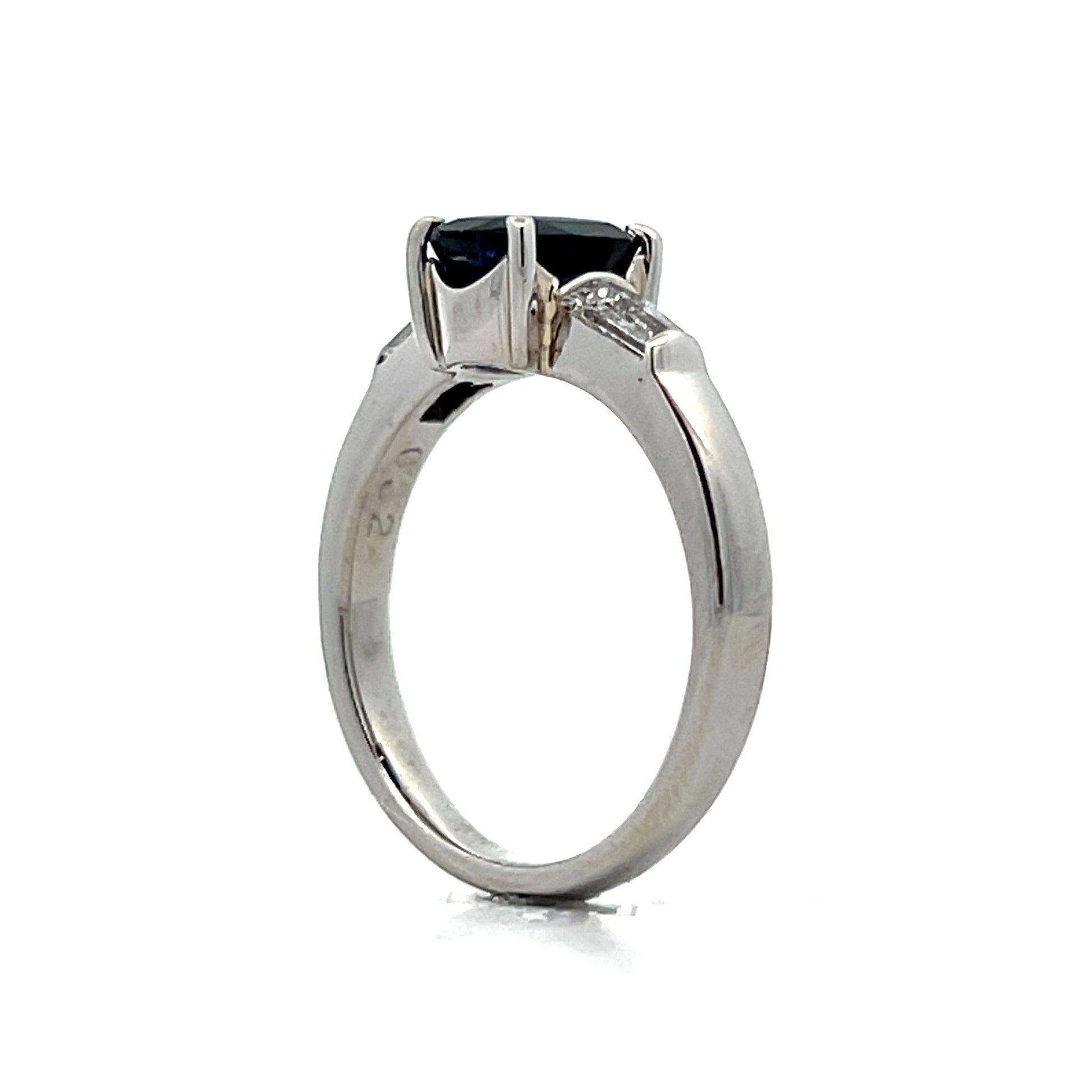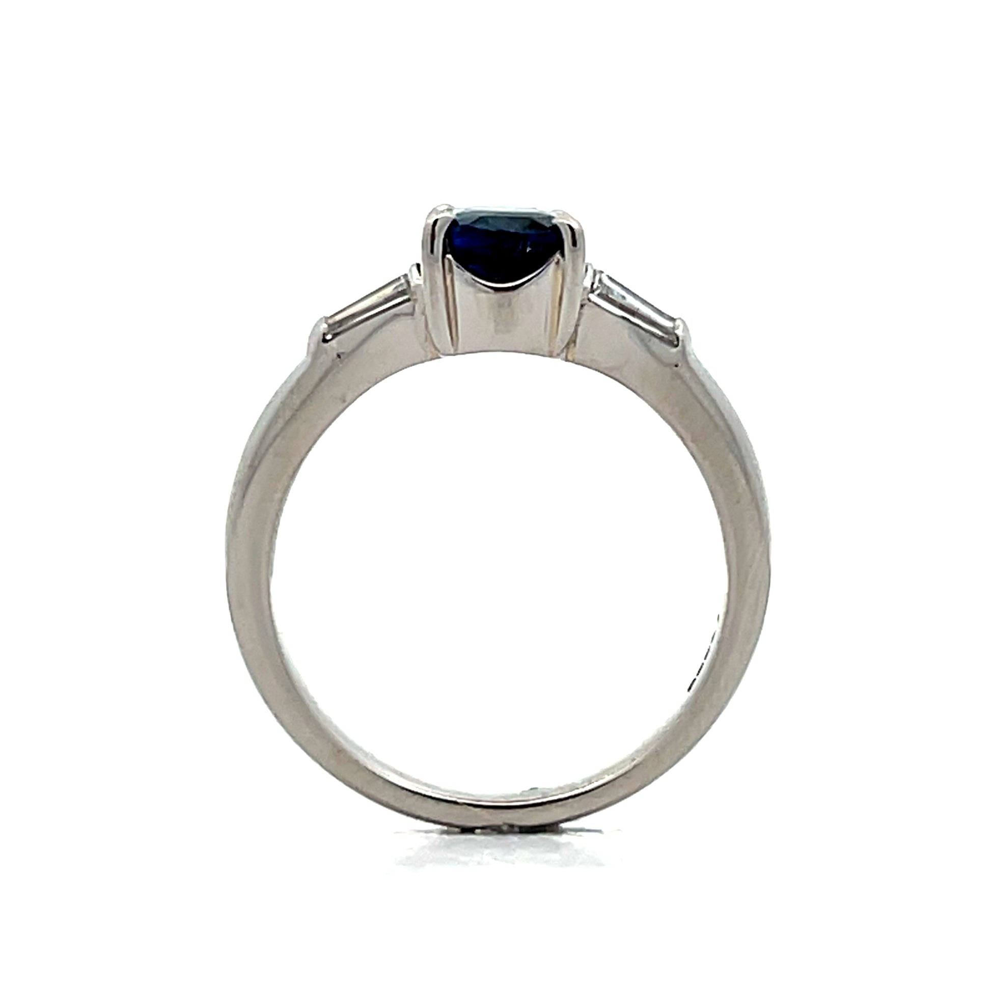 This platinum engagement ring centers a 1.98 carat oval cut blue sapphire held in a four-prong basket setting, flanked by four tapered baguette diamonds totaling .32 carats. The baguettes—two on each side—create clean lines that draw the eye toward the deep blue center stone. It's a design that feels both substantial and balanced, with the geometric baguettes playing off the oval's softer curves in a way that works beautifully on the hand.