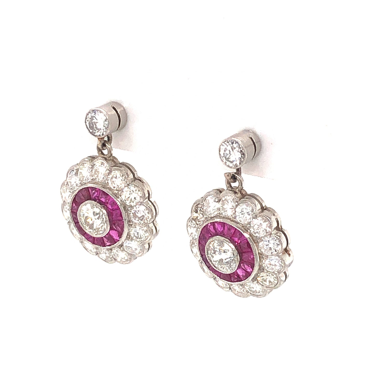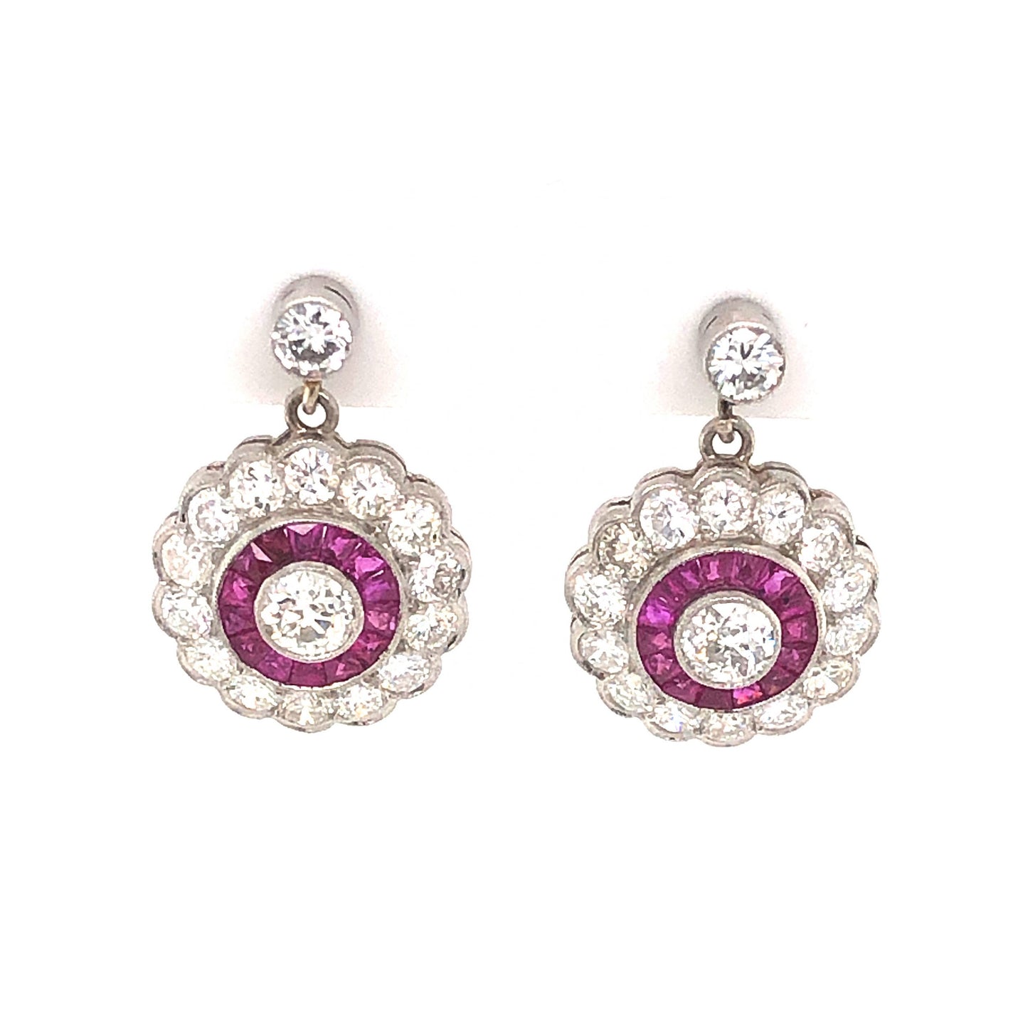 1.99 Diamond Ruby Drop Earrings in Platinum. These glittering drop earrings feature 1.99 carats of diamonds and 1.18 carats of rubies finished in polished platinum. Two (2) Old European cut diamonds are set at the center of the drops. Thirty (30) French cut rubies halo the center stones. The rubies have a deep, magenta hue and are accented by a wreath of thirty (30) Round Brilliant cut diamonds. The variety of diamond facets and geometric style of the French cut rubies give these drop earrings a dimensional sparkle and depth. Finished on platinum stud backings, these sophisticated earrings are the perfect gift for an anniversary or birthday!