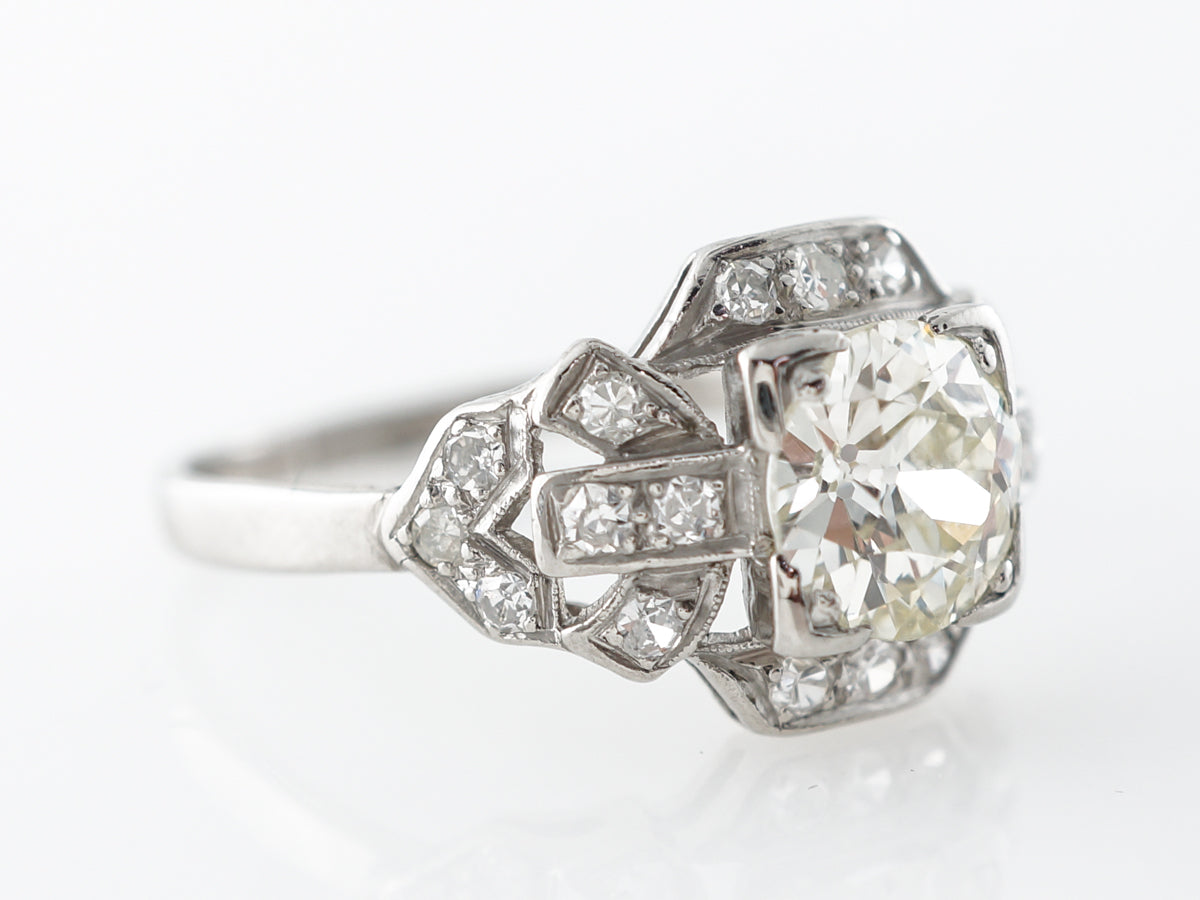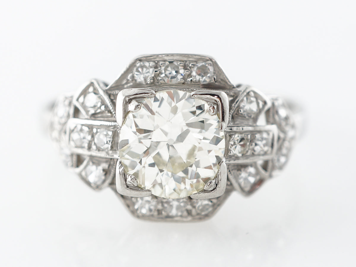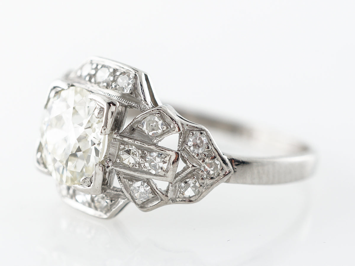 1 Carat Art Deco Engagement Ring w/ Old European Cut Diamond. This Art Deco engagement ring features a 1.08 carat Old European cut diamond with .30 carats of accent stones and is set in platinum. The borders around each section of diamonds overlap each other in a way that creates a nice implied motion and leaves plenty of negative space in and around the shoulders. This ring has nice soft features on all of the settings and shows a quintessential Art Deco style.