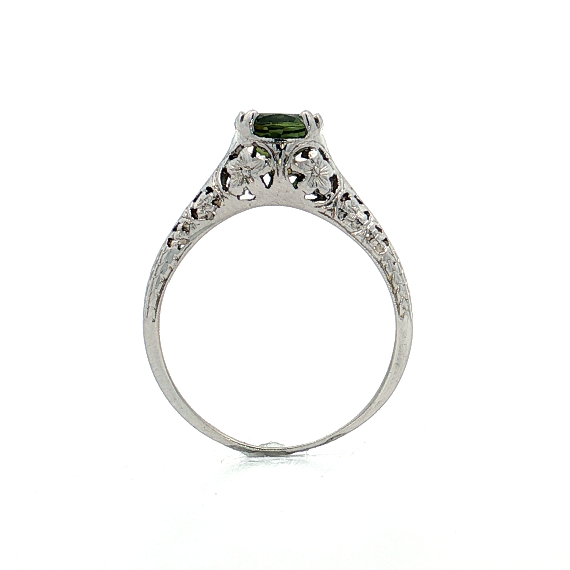 The mounting features orange blossom engraving, a decorative motif popular during the Art Deco period of the 1920s-1930s. White gold provides a neutral backdrop that allows the yellow-green tourmaline to stand out without color competition from the metal. The ring balances ornate metalwork details with a clean solitaire stone setting, keeping the overall profile low enough for comfortable daily wear.
