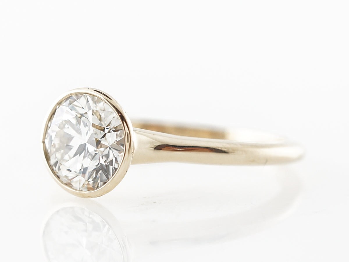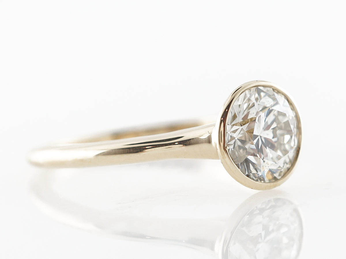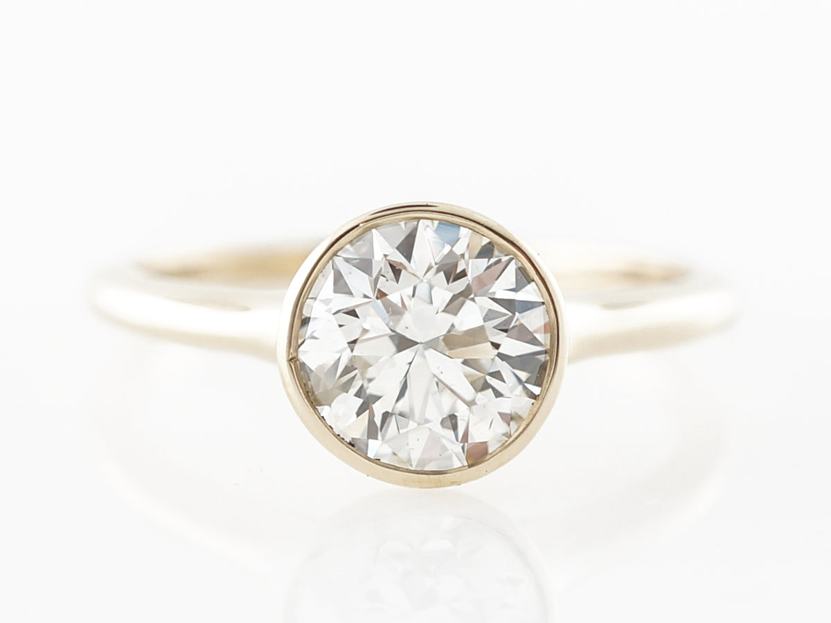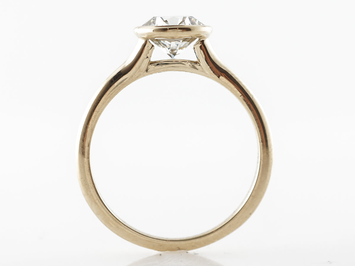 This modern engagement ring features a 1.17 carat Round Brilliant cut diamond set in 14 karat yellow gold. The diamond is bezel set in the highly polished yellow gold, but unlike many bezel set solitaires it raises up above the shoulders for a beautiful side profile view. The open space allows plenty of light into the diamond and provides an elegant look.