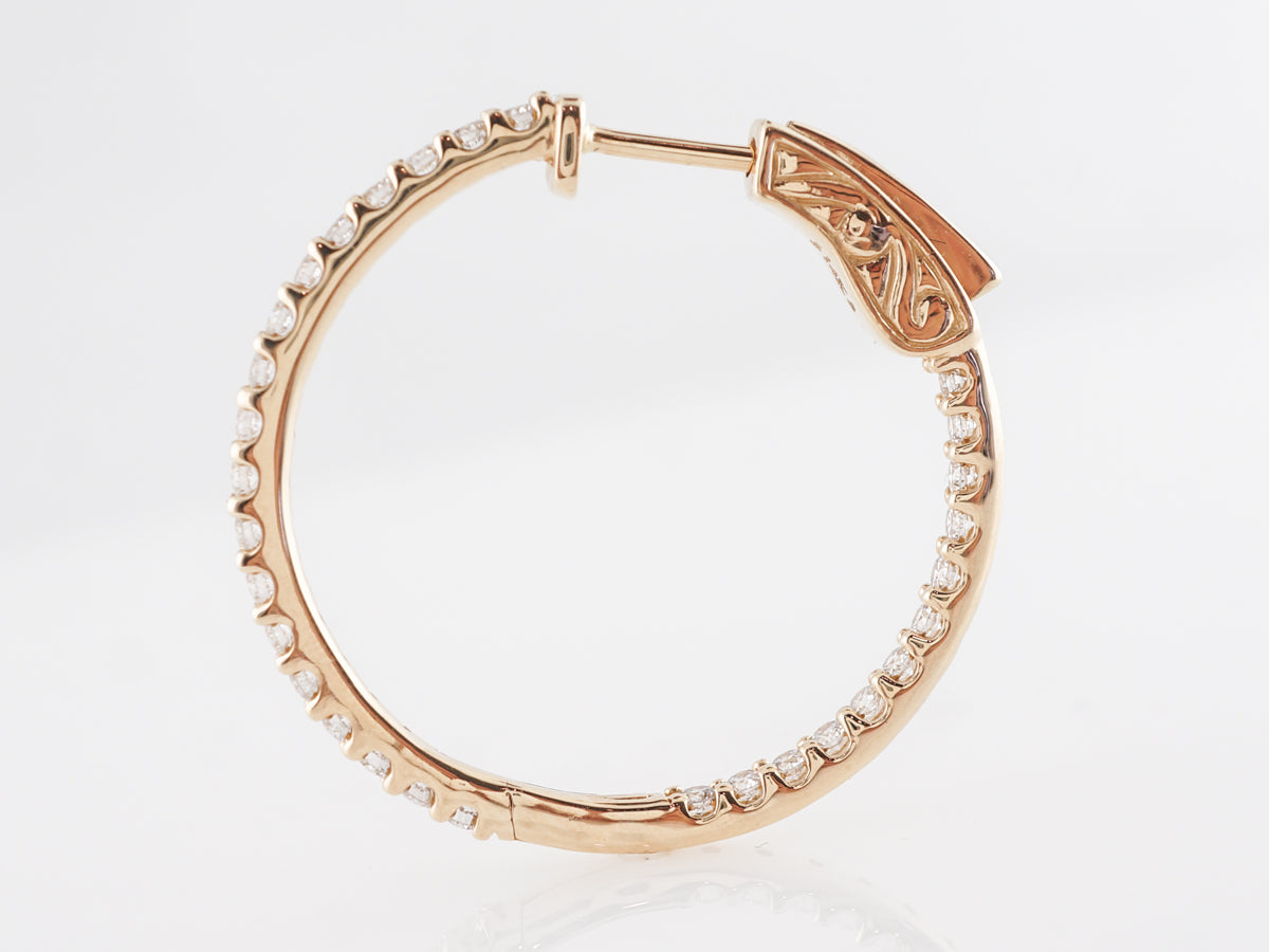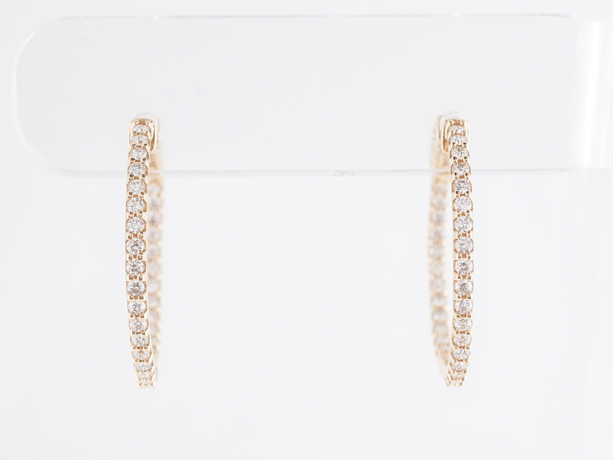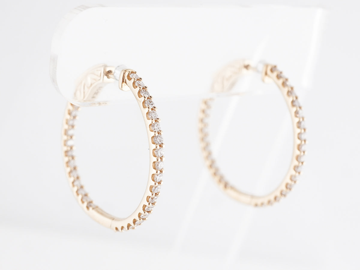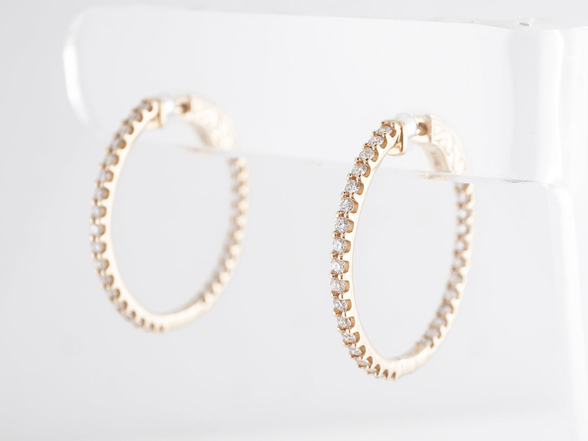 1 Carat Diamond Hoop Earrings in 14k Yellow Gold. These wonderful inside-out hoop earrings feature 1.00 carats of round brilliant cut diamonds set in 14 karat yellow gold. At about 1.25 inches long, these are a great size hoop that you could wear with just about anything and have a brilliant diamond look!