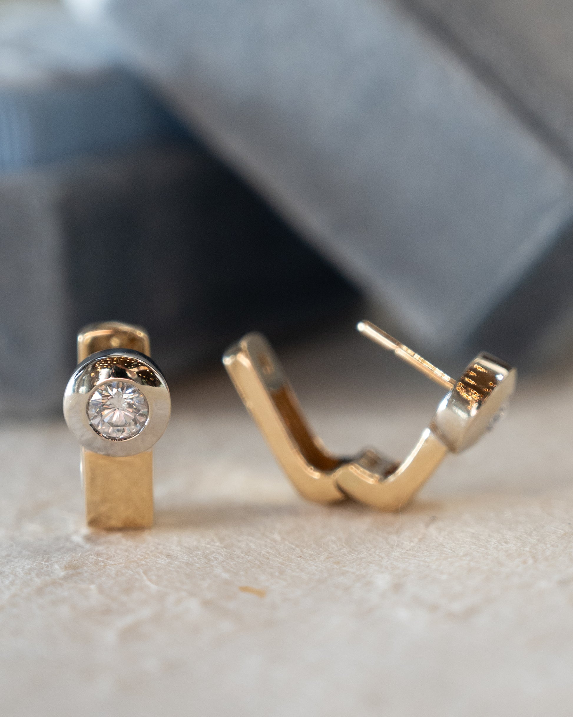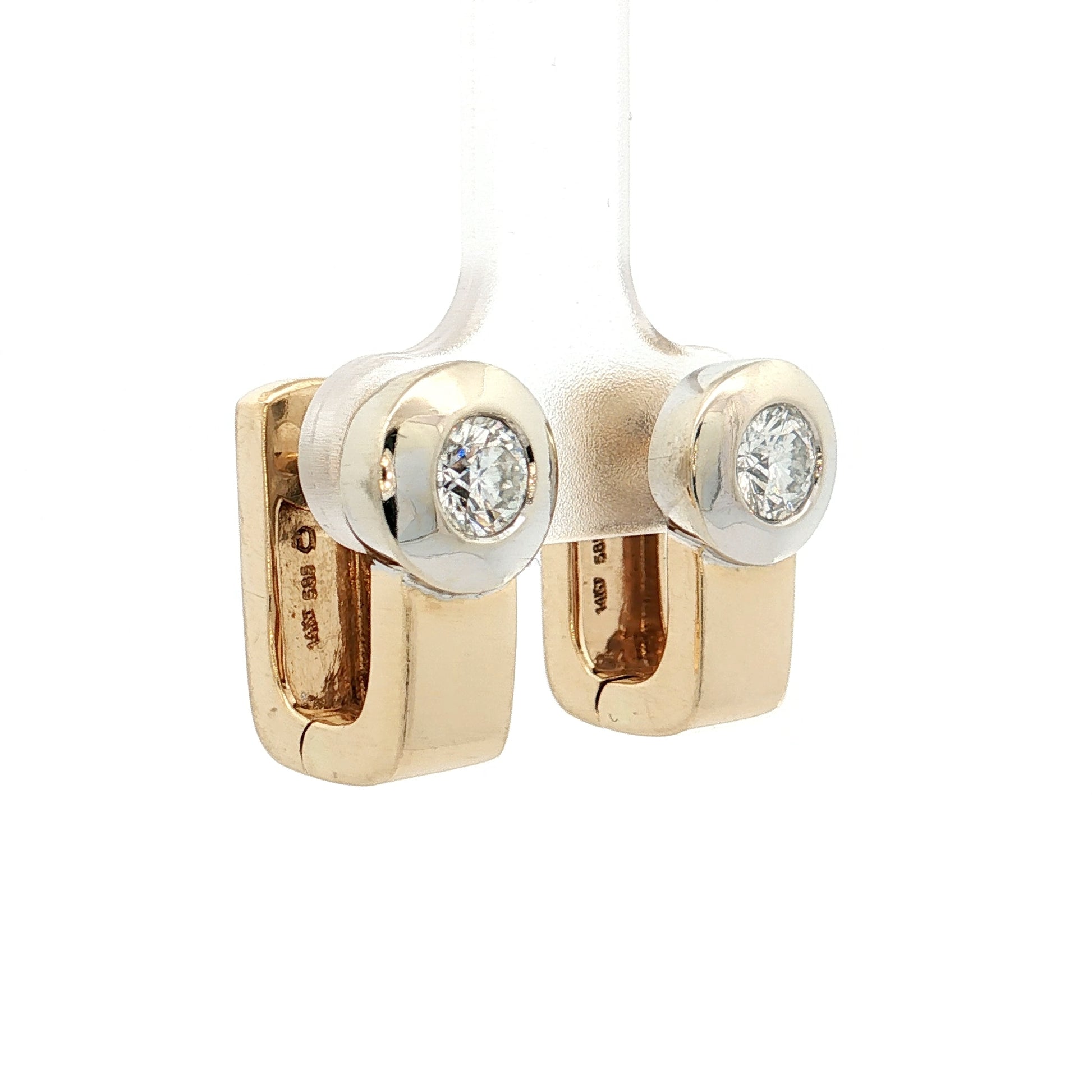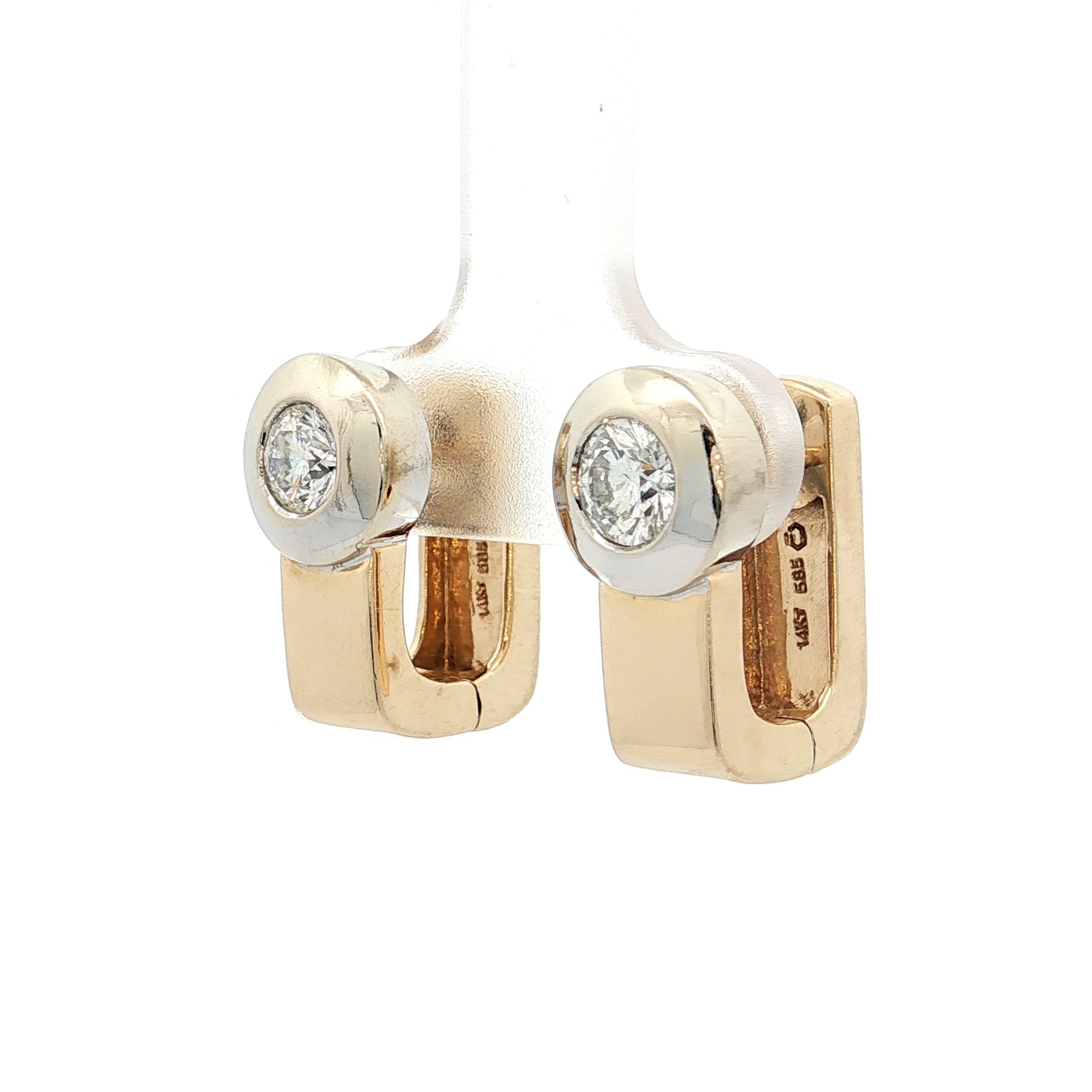 The hoops themselves are made from 14 karat yellow gold shaped in a rectangular profile rather than the typical round tube. This two-tone design pairs the white gold diamond settings against the yellow gold hoops. The huggie style sits close to the earlobe, making them comfortable for all-day wear and secure enough for active lifestyles.