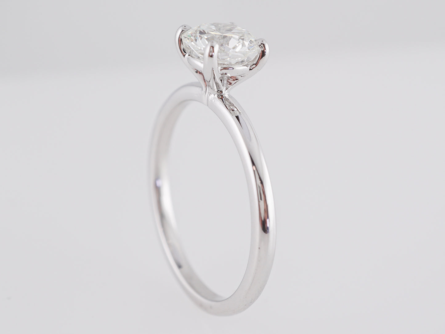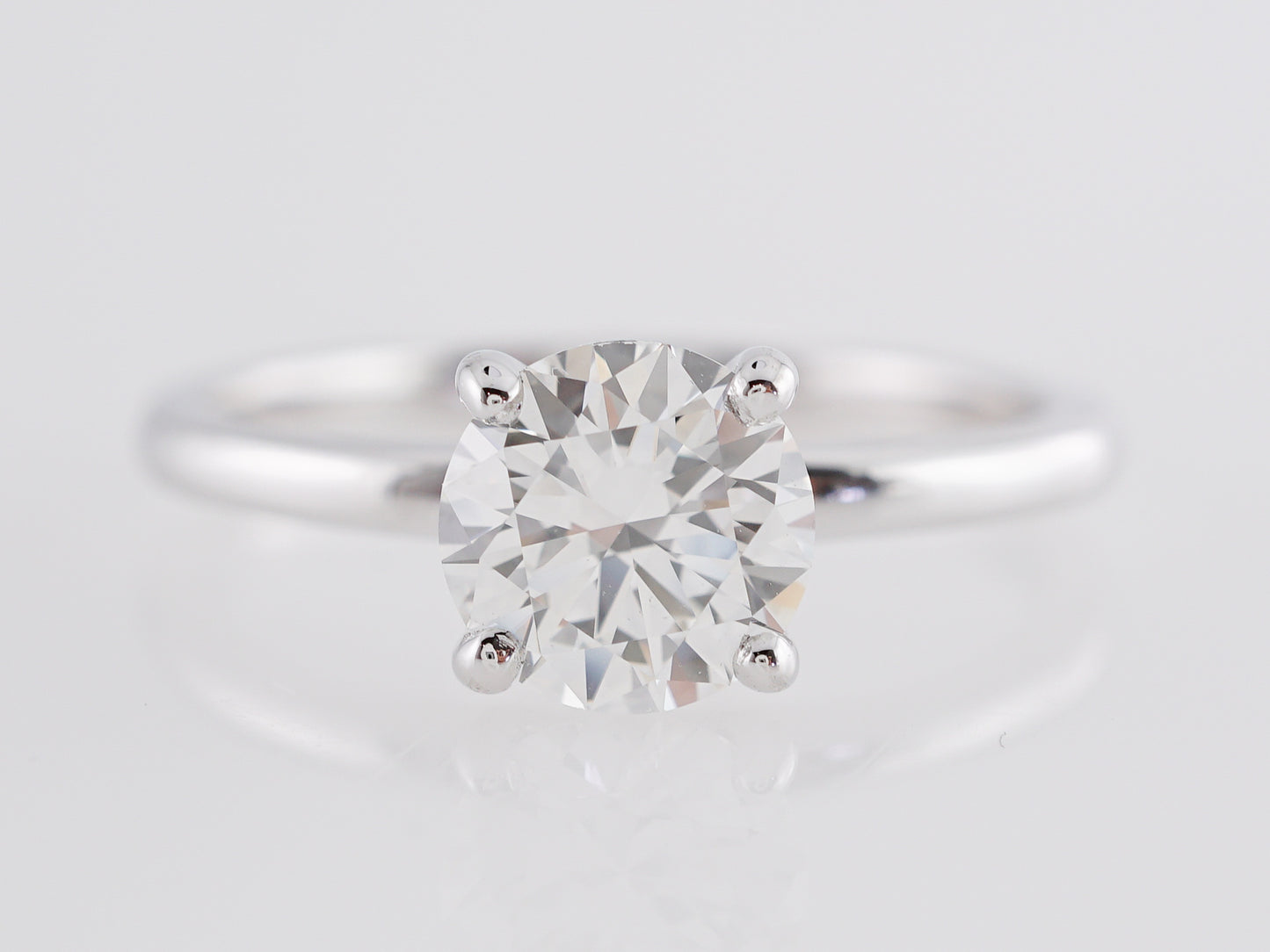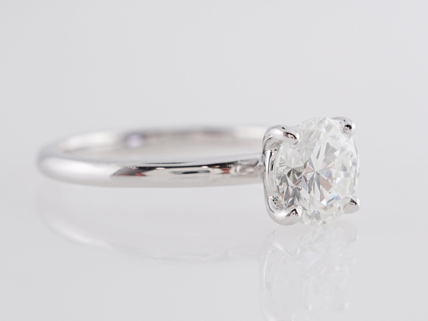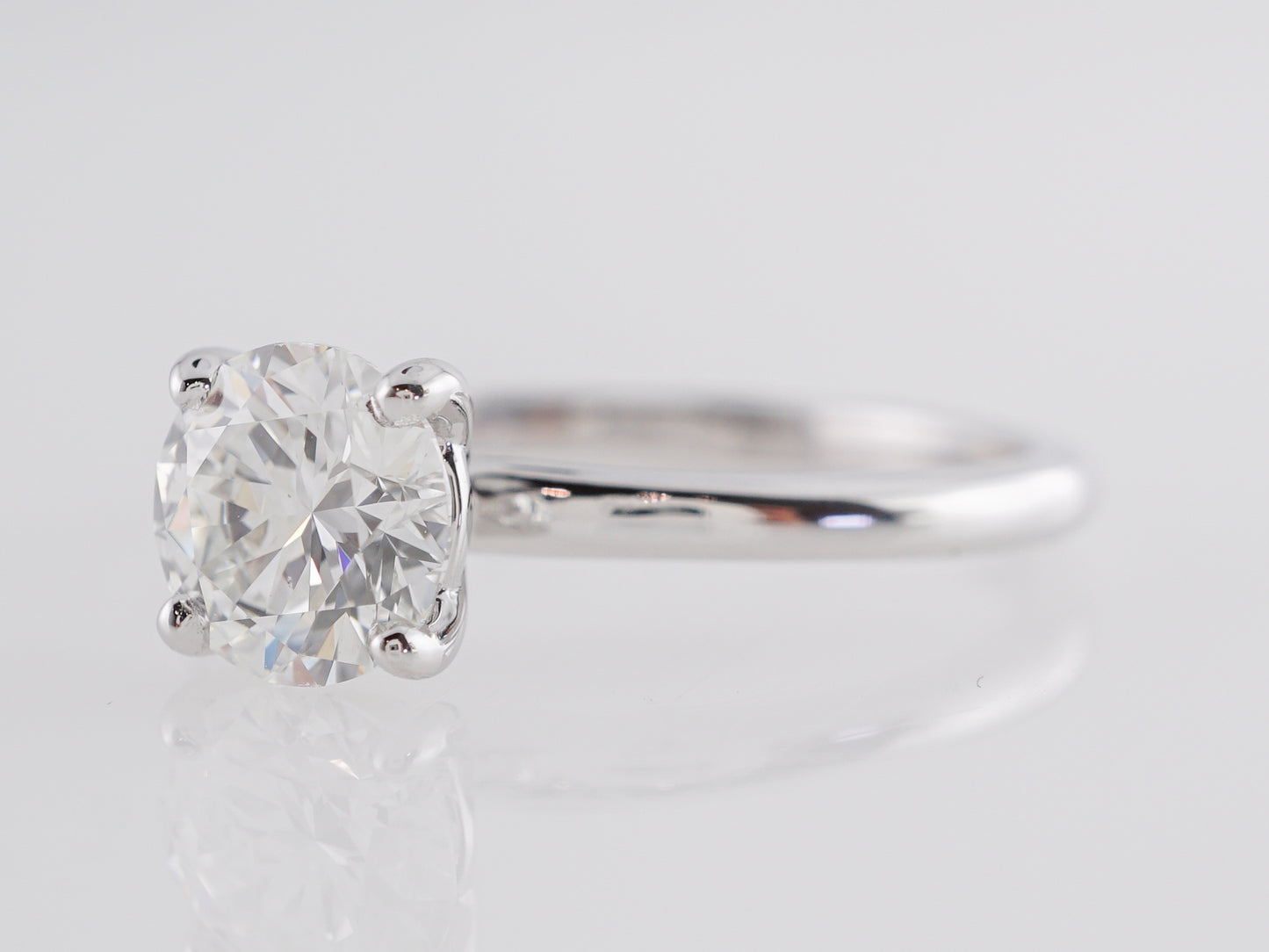 1 Carat GIA Diamond Engagement Ring in White Gold. This shimmering, solitaire engagement ring features a GIA-certified, 1.05 carat Round Brilliant cut diamond in 14 karat white gold . The primary diamond is color grade F, a true colorless gem. The strong fire and brilliance of this diamond is undeniable thanks to the multifaceted style of the round brilliant cut. The diamond is prong set and is complimented by the glistening white gold band. Reaching 6.79mm above the finger and weighing a total of 2.7 grams, this engagement ring will make your heart skip a beat!