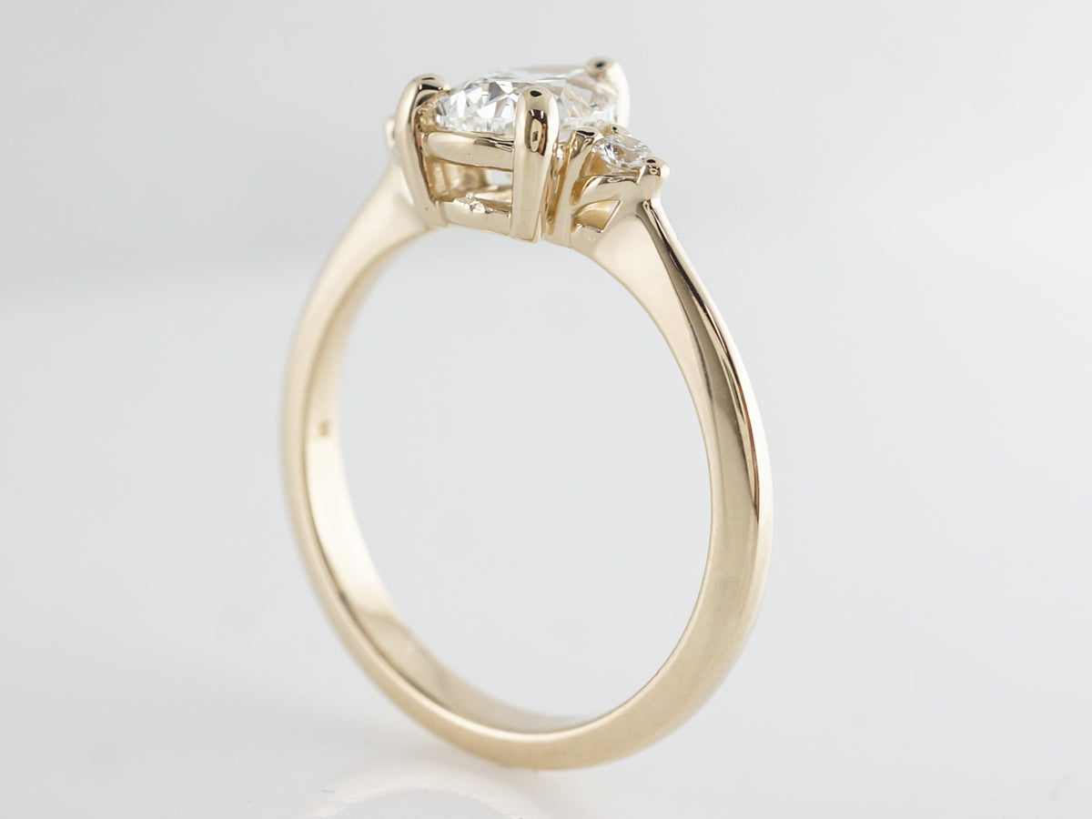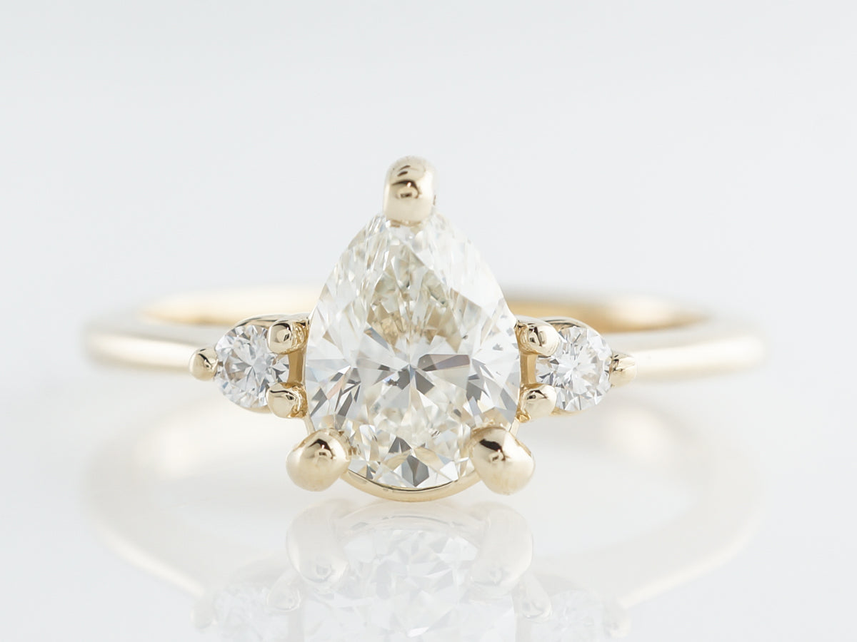 1 Carat GIA Pear Cut Diamond Engagement Ring in 14k. This GIA certified pear shape diamond is beautifully set in a custom 14 karat yellow gold mounting. The center 1.00 carat diamond is secured with three (3) prongs and rests in a yellow gold basket. The pear shape is flanked by two (2) round brilliant diamonds prong set with a total side diamond weight of .06 carats. The ring is finished in a high polish.
