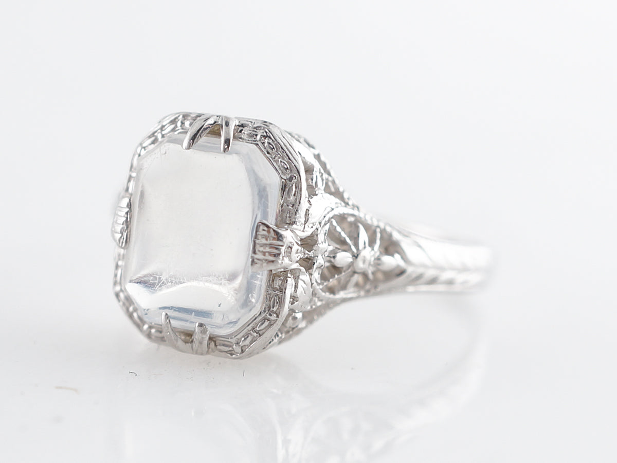 1 Carat Moonstone Filigree Cocktail Ring 14k. A delightful 14 karat white gold filigree ring with a 1.08 carat piece of faceted moonstone in the center! The modern filigree mounting has ornate wire work and open spaces all leading up to the cloudy and mystical moonstone. A great cocktail ring at a great price. Make it a gift for someone special.