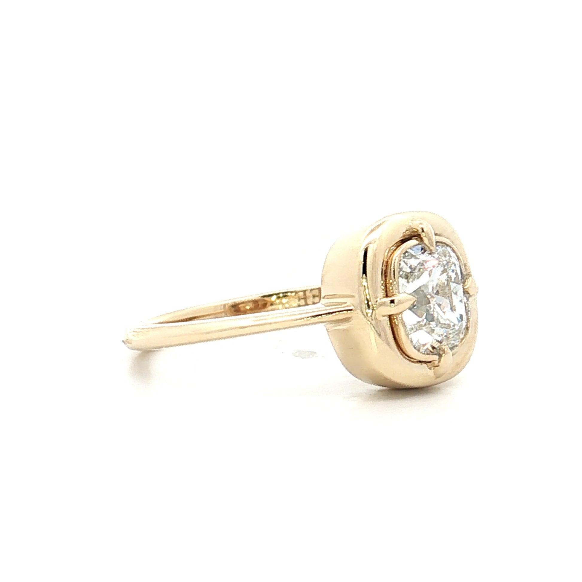 This solitaire engagement ring made 'By Filigree" is made in 14k yellow gold and features a 1.00 carat Old Mine cushion cut diamond with I color and VS2 clarity.