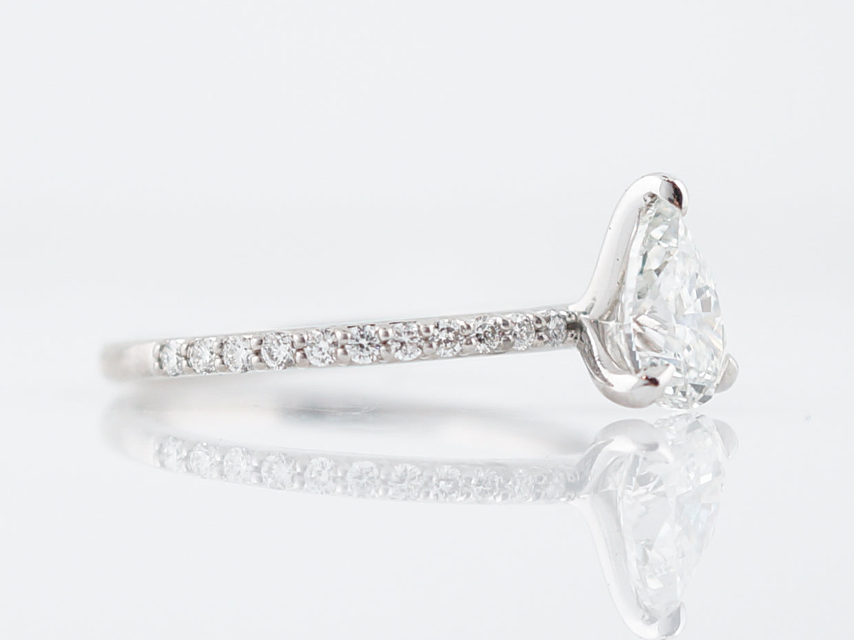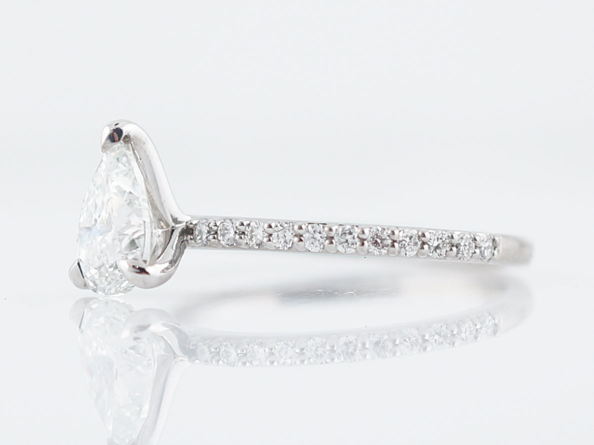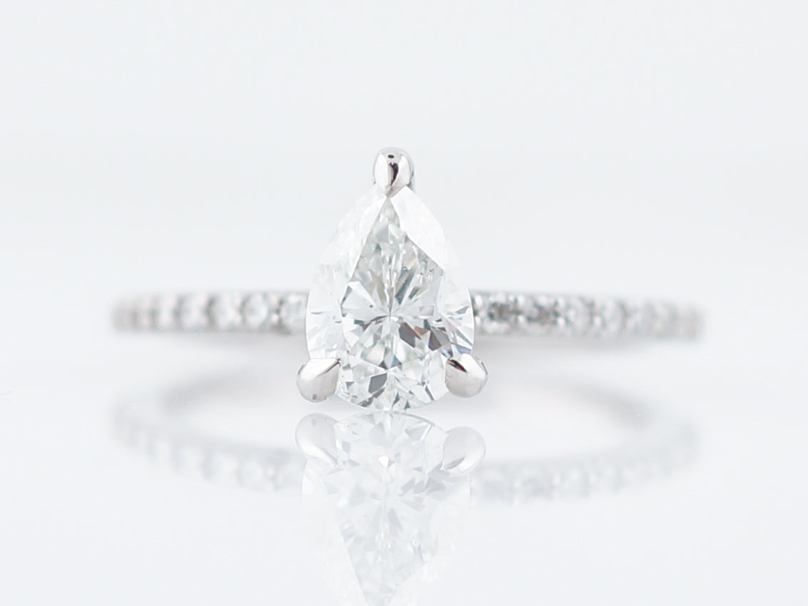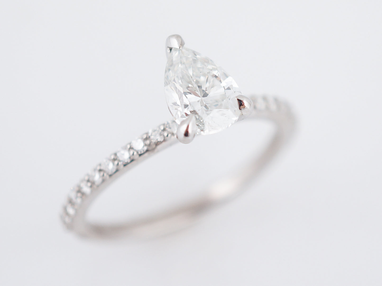 1 Carat Pear Diamond Solitaire Engagement Ring 14k. This engagement ring features a 1.05 carat pear-shaped center stone, with .22 carats of micro-prong set diamonds on the front of the band. This ring sets itself apart from your standard solitaire ring, thanks to the sparkling diamond accents. The 14 karat white gold mounting is a lovely complement to the brilliant diamonds, creating a classic yet unique look.