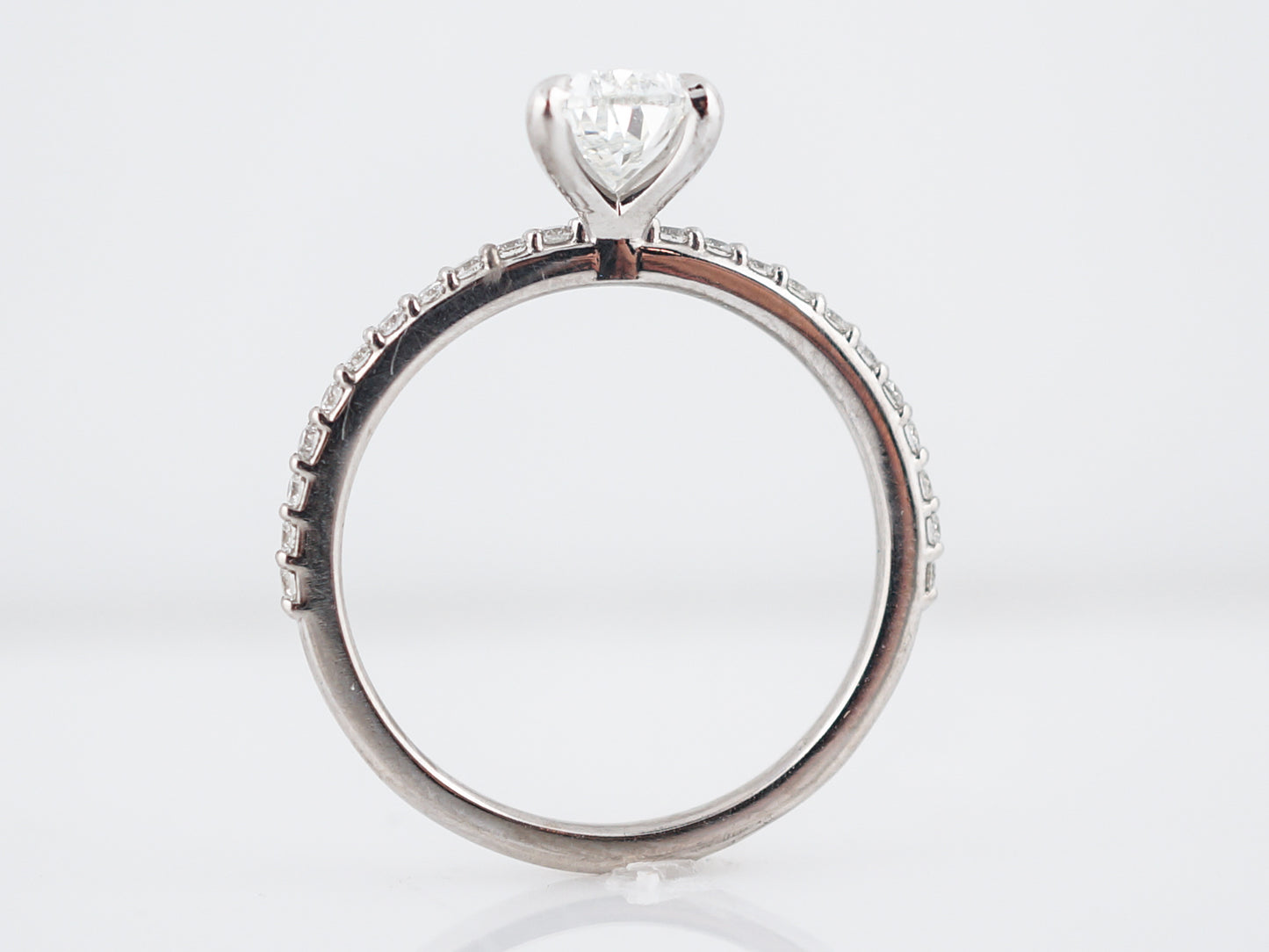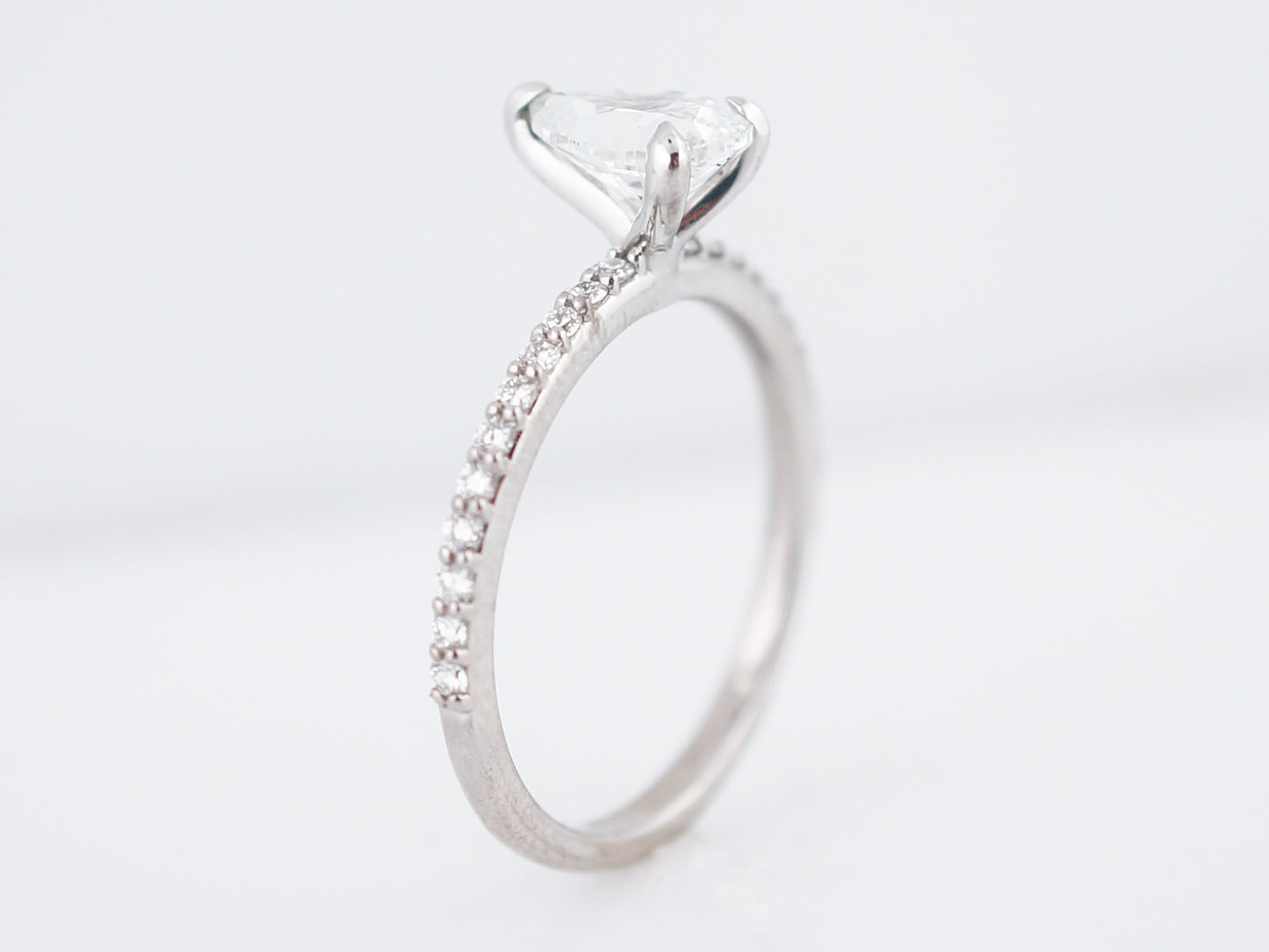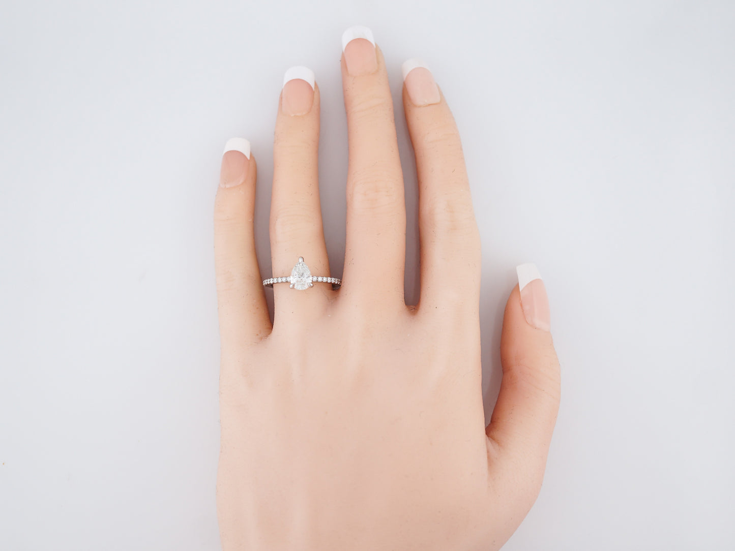 1 Carat Pear Diamond Solitaire Engagement Ring 14k. This engagement ring features a 1.05 carat pear-shaped center stone, with .22 carats of micro-prong set diamonds on the front of the band. This ring sets itself apart from your standard solitaire ring, thanks to the sparkling diamond accents. The 14 karat white gold mounting is a lovely complement to the brilliant diamonds, creating a classic yet unique look.