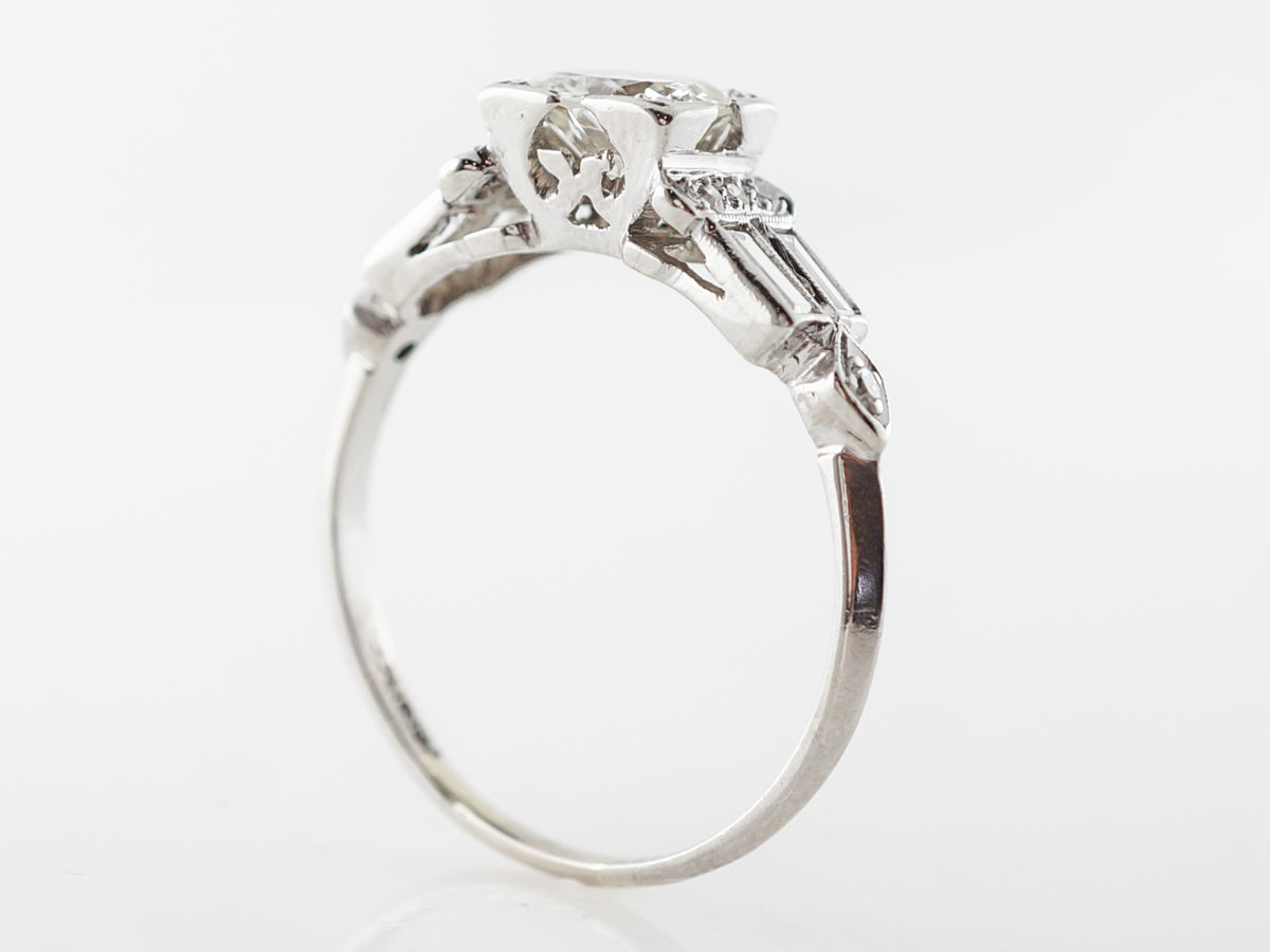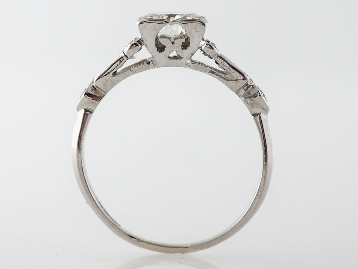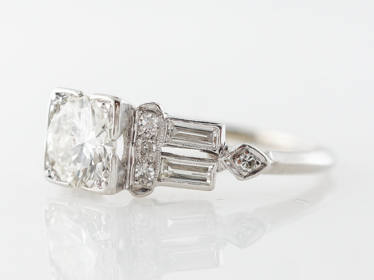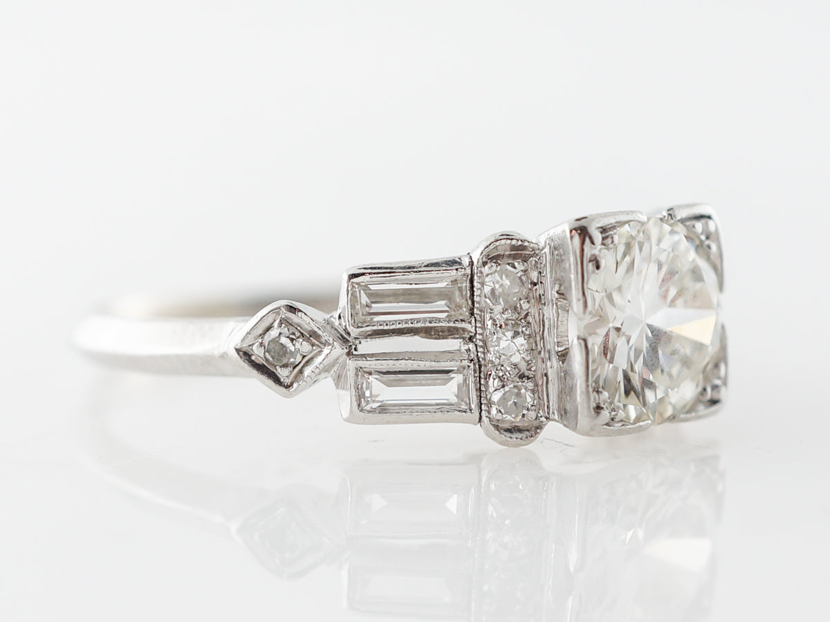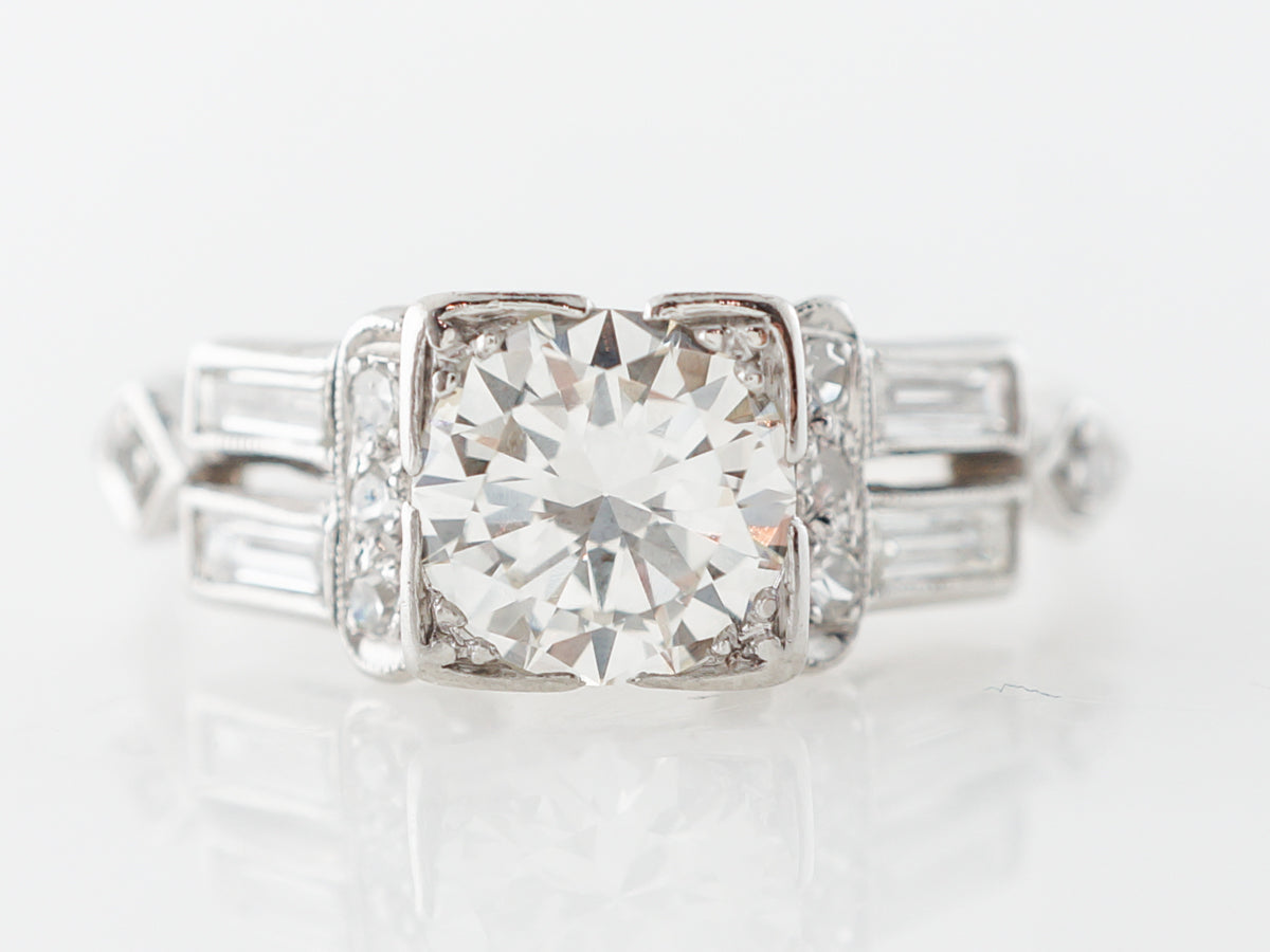 1 Carat Transitional Cut Diamond Engagement Ring Platinum. This interesting Art Deco engagement ring features a dazzling 1.01 carat transitional cut diamond and is set in platinum. The shoulders contain .24 carats of accent diamonds of which are round cuts as well as baguettes. The center stone is set with fishtail prongs inside a square shaped element that separates it from the rest of the accent stones. The shoulders split and run toward the center with bezel set baguettes that are separated from the center by milgrain detail and more round cut diamonds. The ring contains 1.33 carats of diamonds but their placement creates a much larger look that that would imply, in a very interesting design nonetheless.