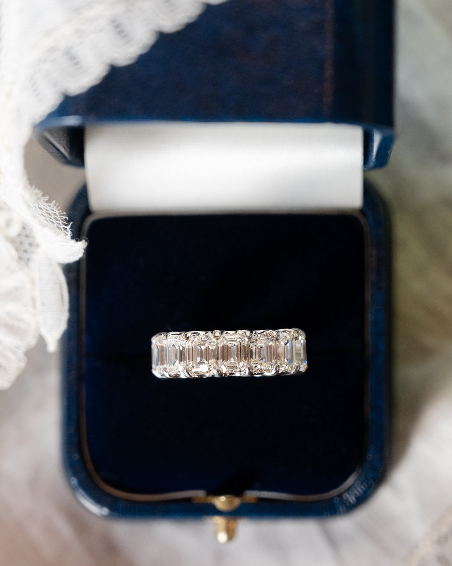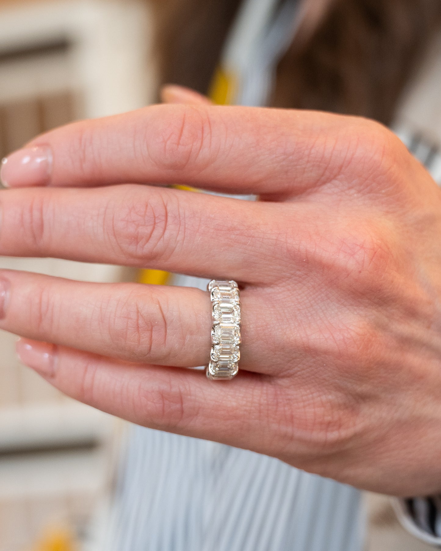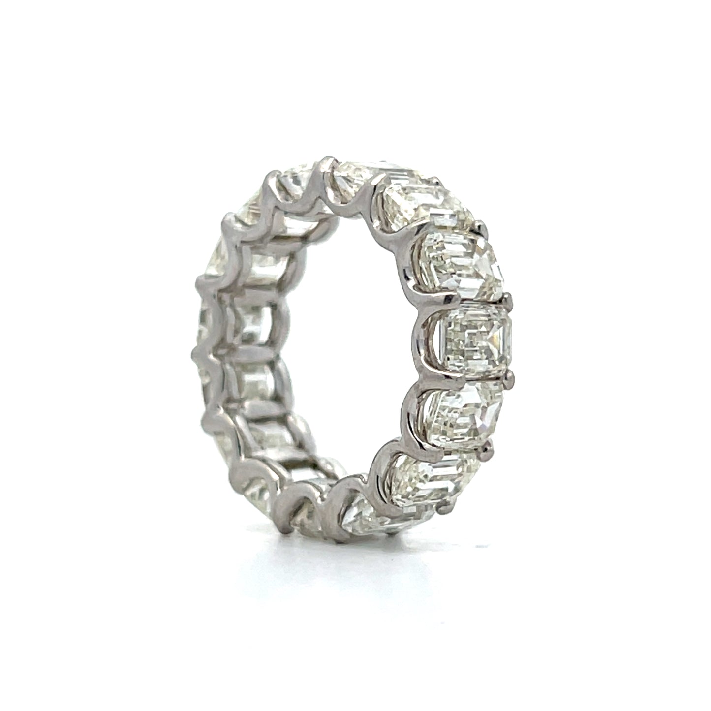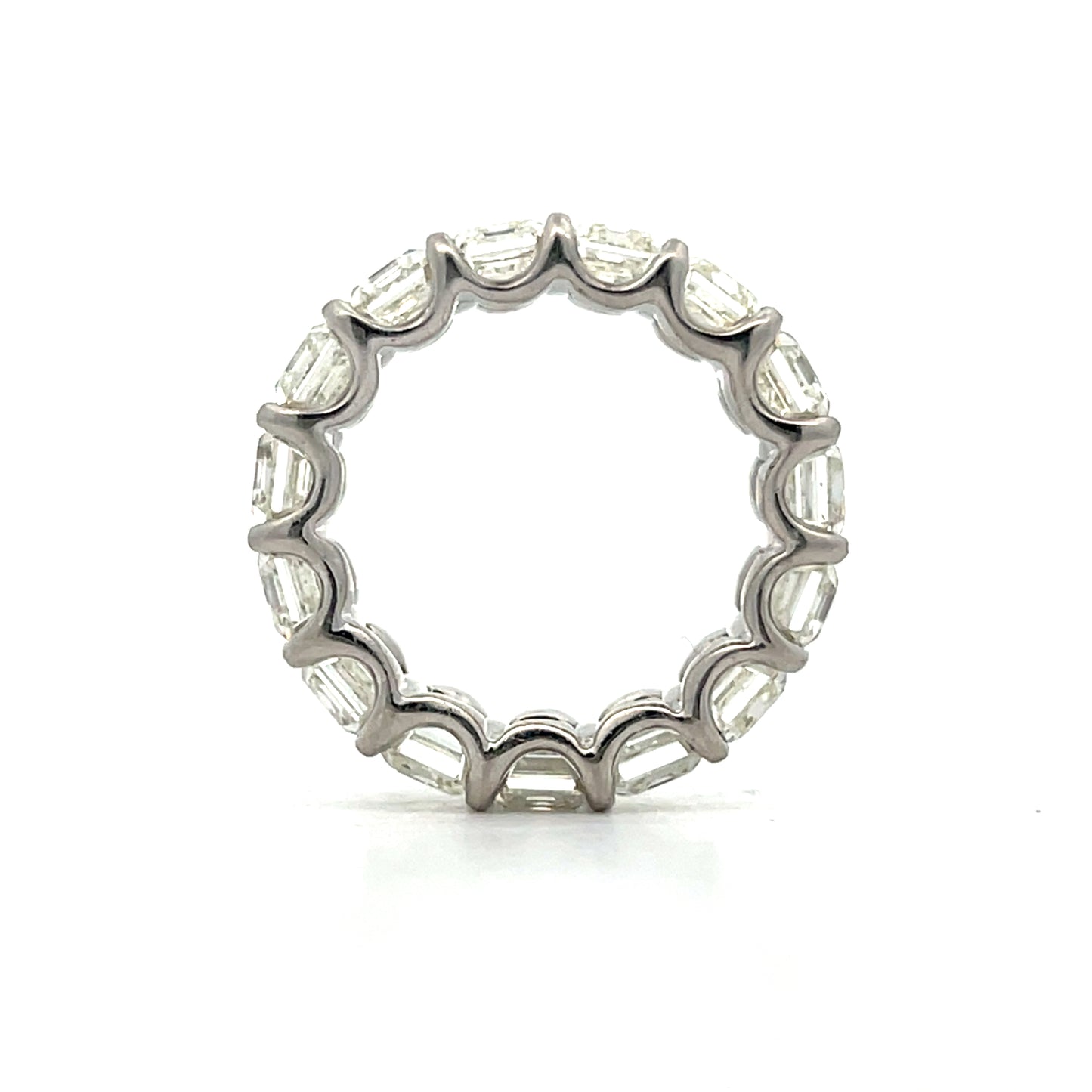 This eternity band contains emerald cut diamonds that circle the entire ring with no visible start or end point. The diamonds have a total weight of 10.80 carats with VS2 clarity and J-K color rating, creating a balanced brightness throughout the piece. The diamonds sit in a shared prong mounting that holds each stone securely while allowing maximum light interaction from multiple angles. The band itself is made from platinum that contrasts with the diamonds' sparkle.