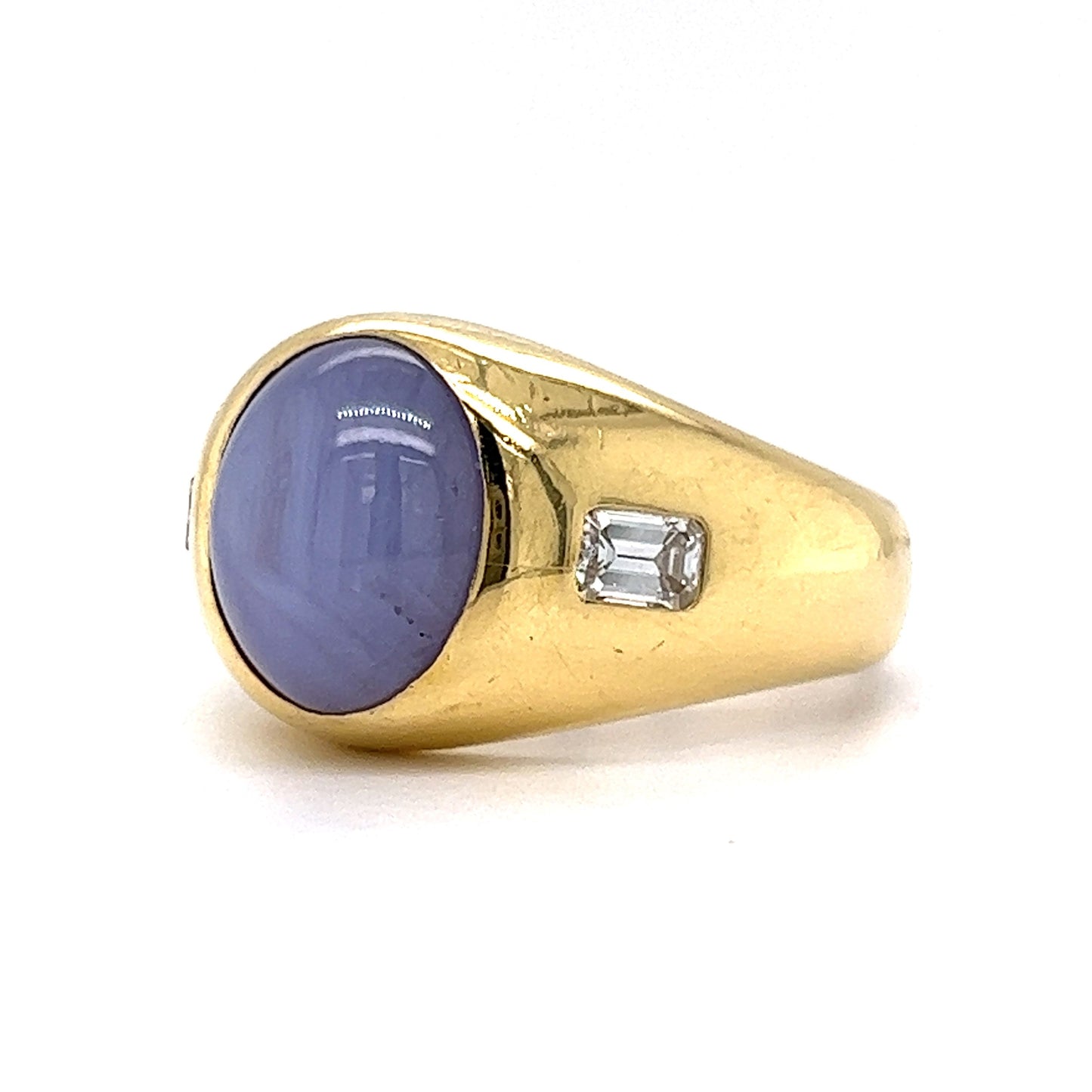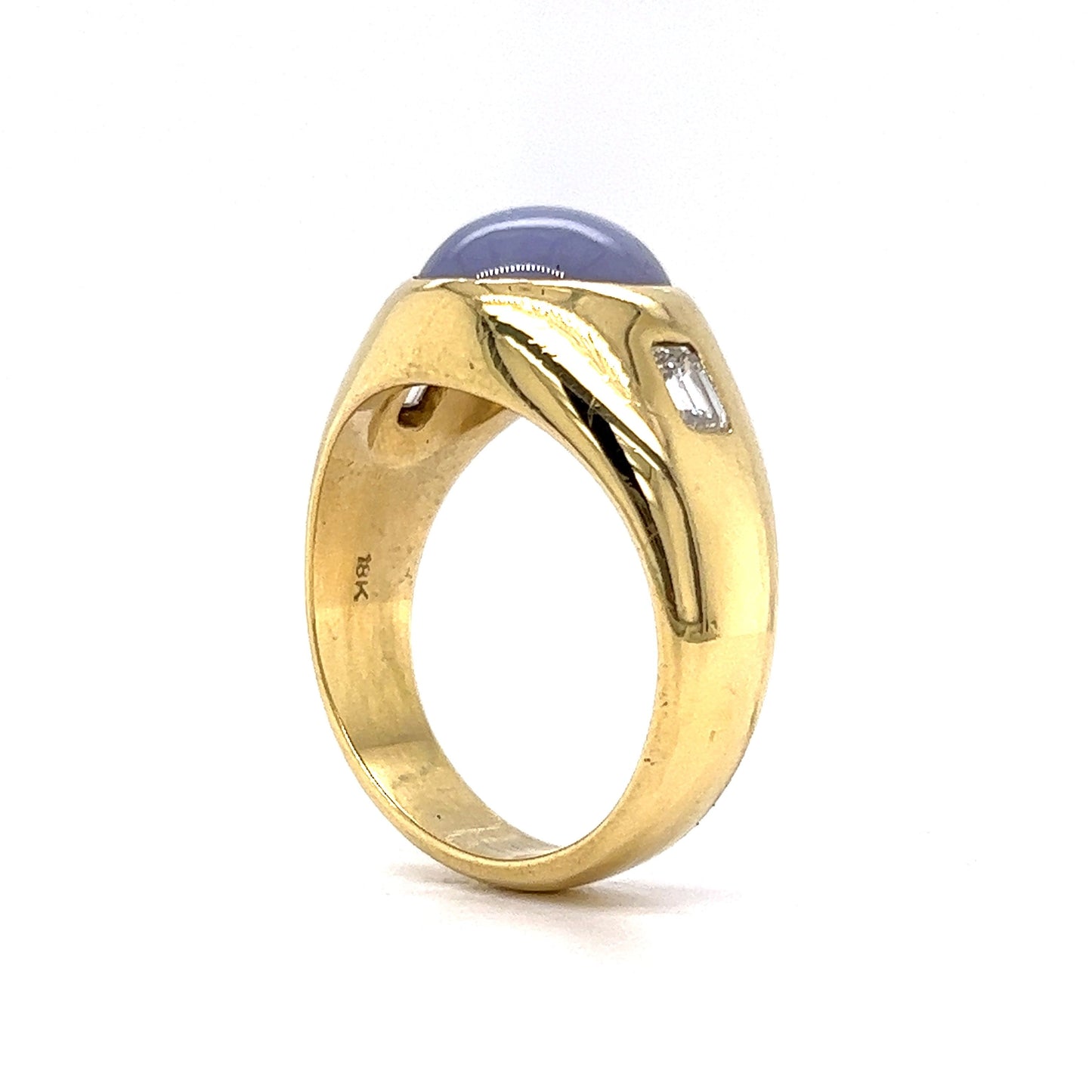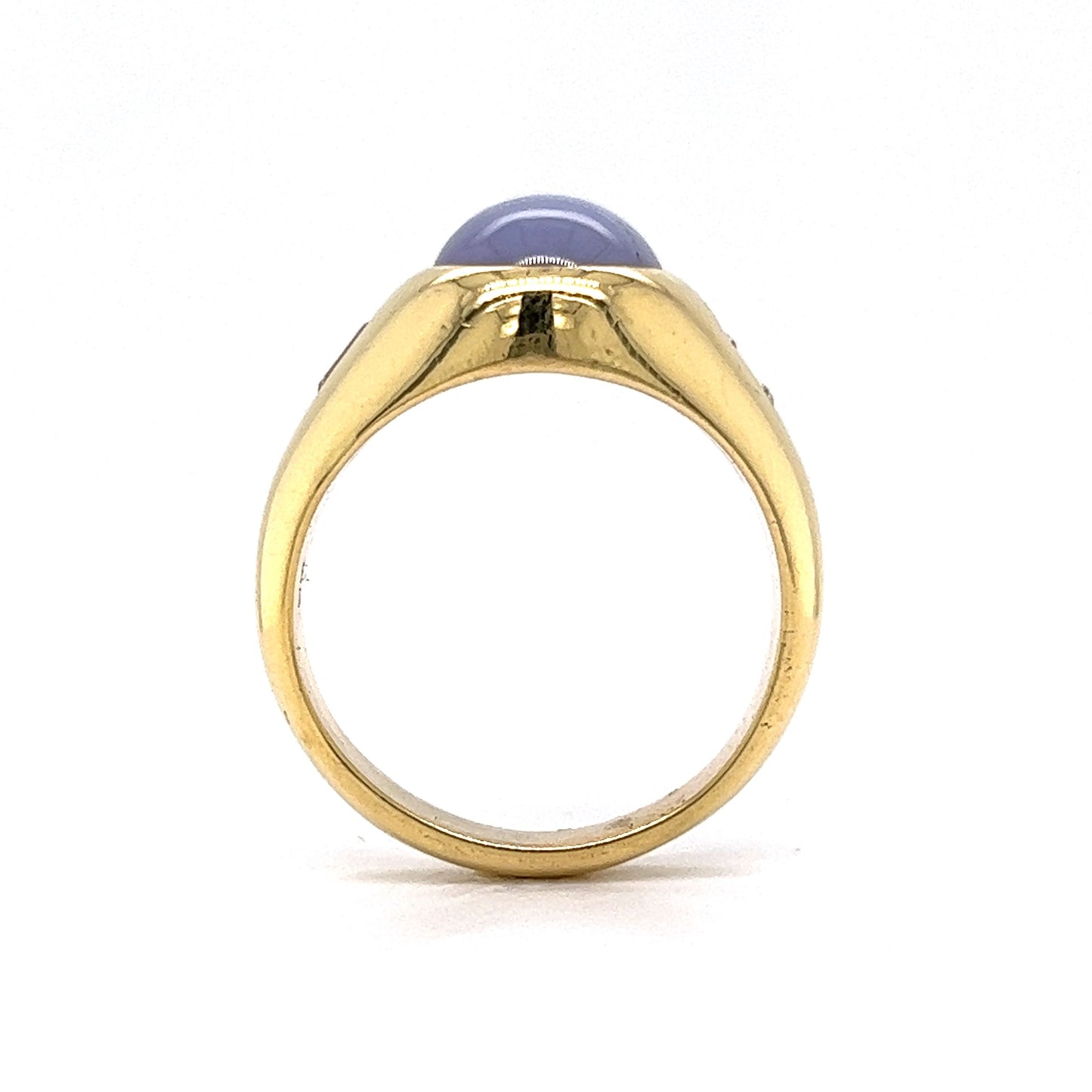 This Mid-Century men’s ring features a 10.90 carat star sapphire and .50 carats of sparkling diamonds in 18 karat yellow gold. The center star sapphire has an opaque, blue-violet hue. The iconic, needle-thin inclusions inside the stone create a star symbol when moved in the light. Two (2) .25 carat near colorless diamonds accent the star sapphire. Finished on a thick and tapered 18 karat yellow gold band.