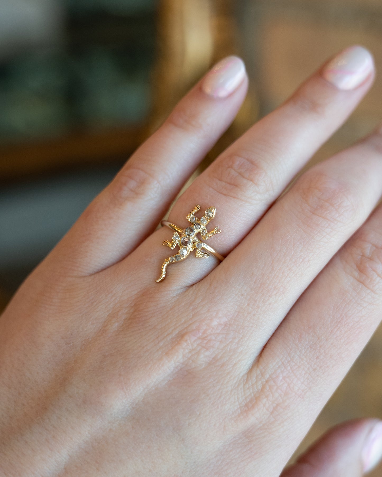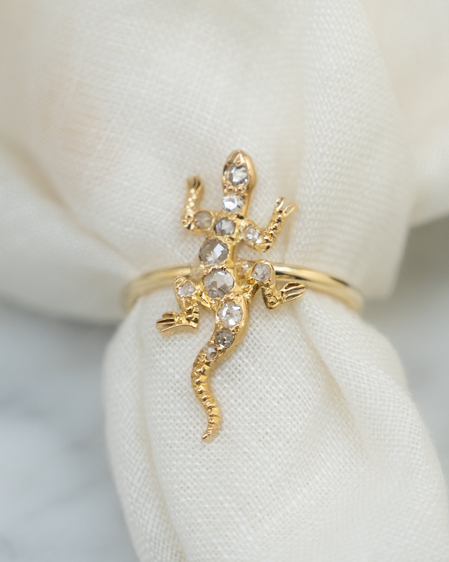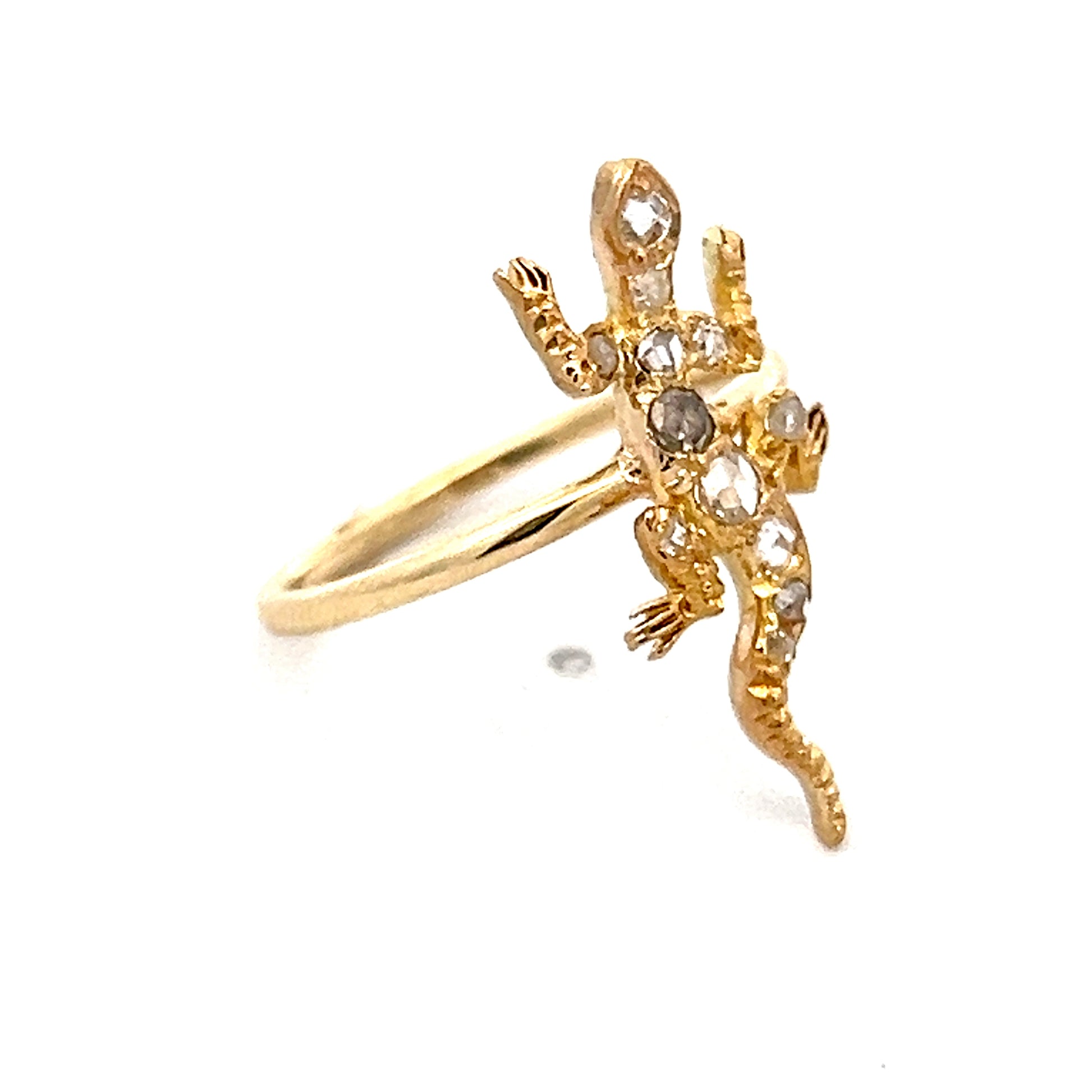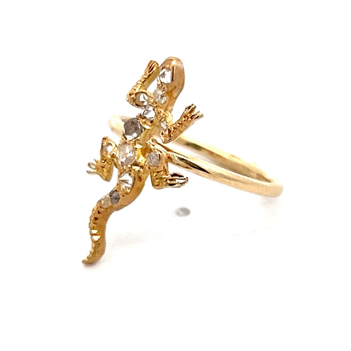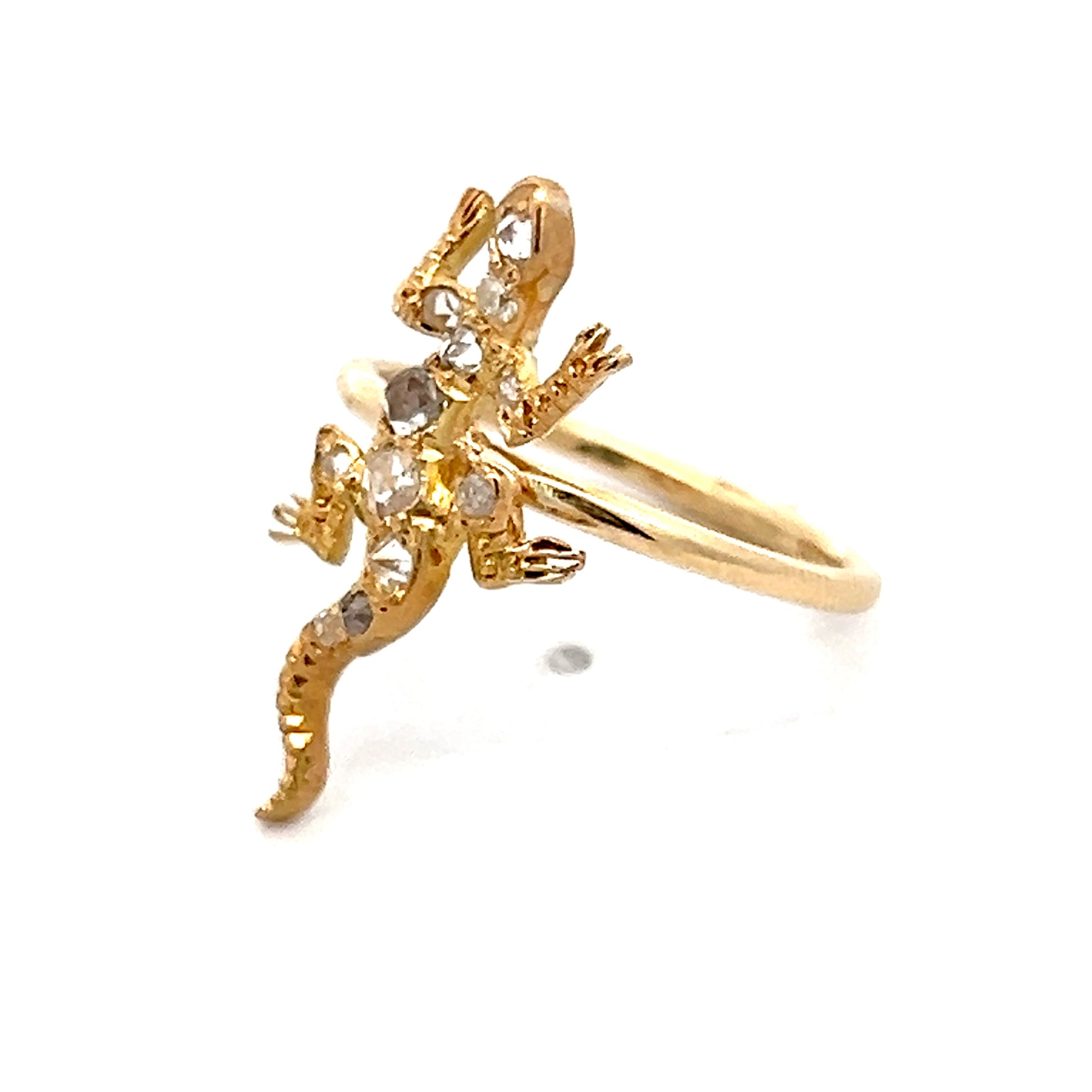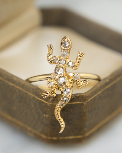The detailed lizard sits on top of the band and stands out because of its unusual animal design. This ring would be great for people who like unique jewelry, antique designs, or diamond pieces that start conversations.