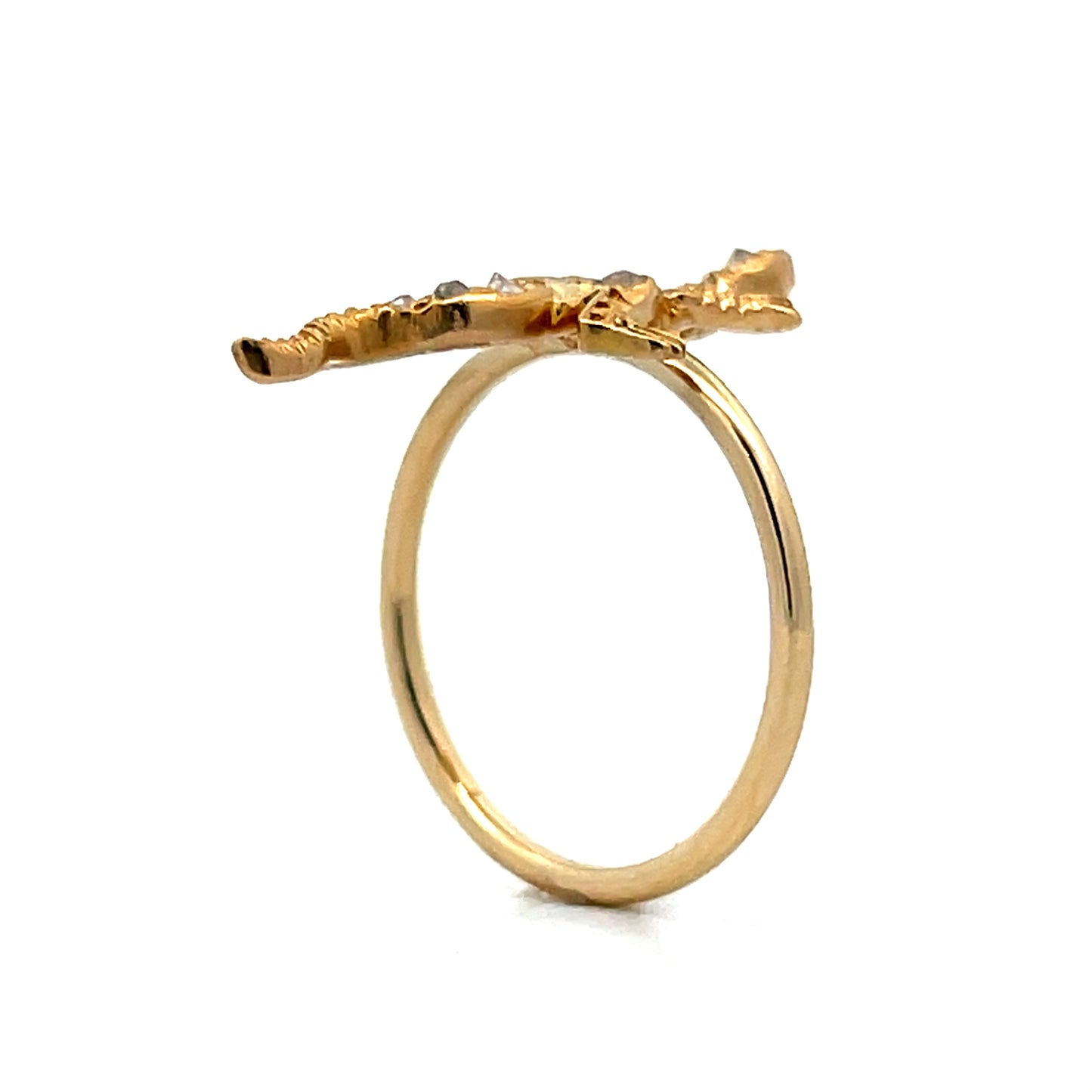 This gold lizard ring takes inspiration from Victorian design and features a 10 karat yellow gold lizard with rose cut diamonds across its body. The main diamond is a rose cut and weighs 0.10 carats. The ring has a 14 karat yellow gold band that's 1.5mm thick, giving it good balance between strength and style.