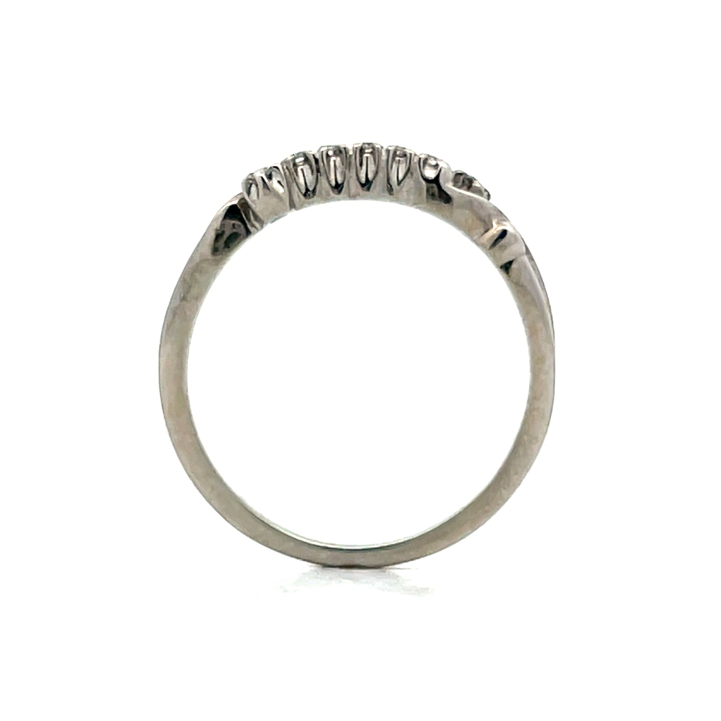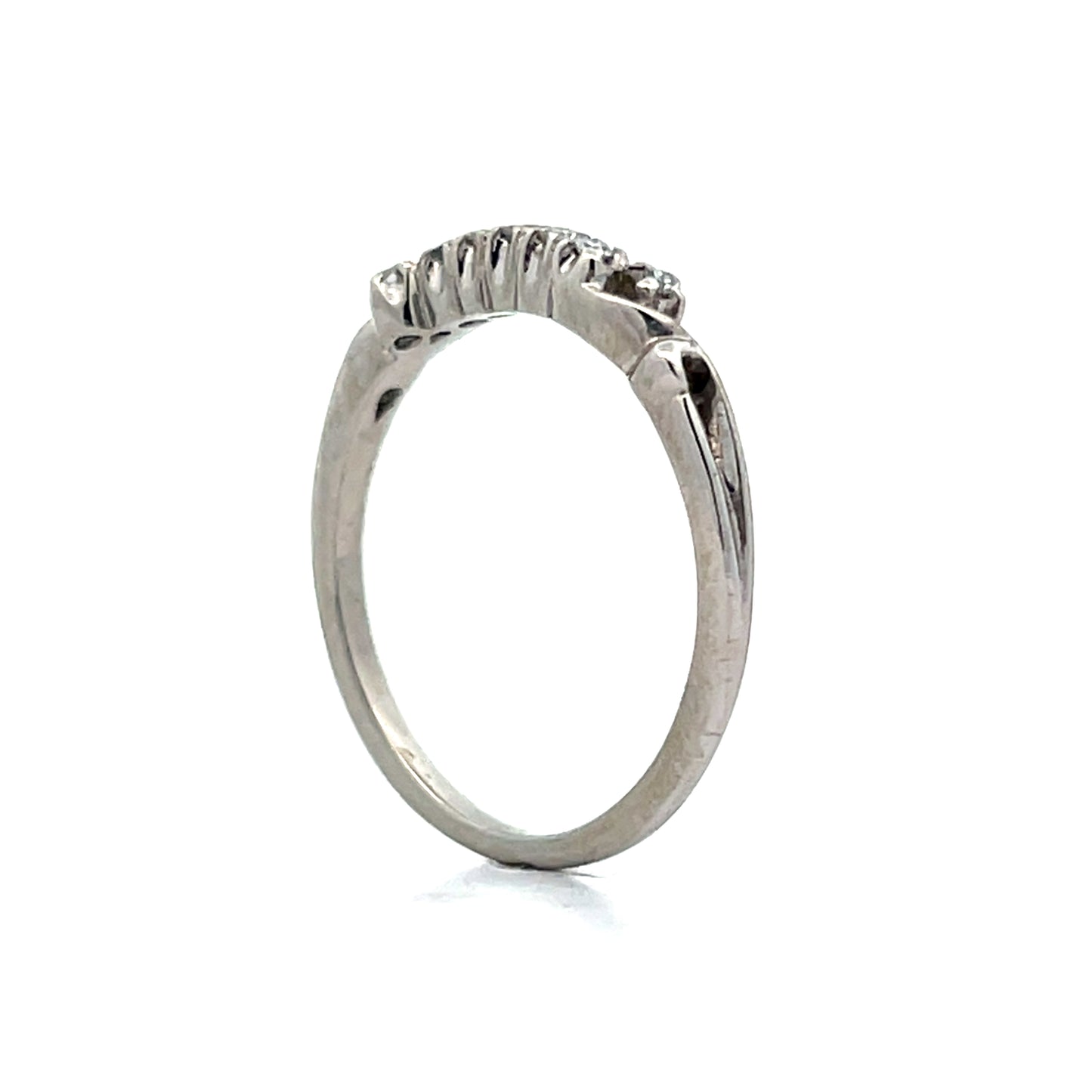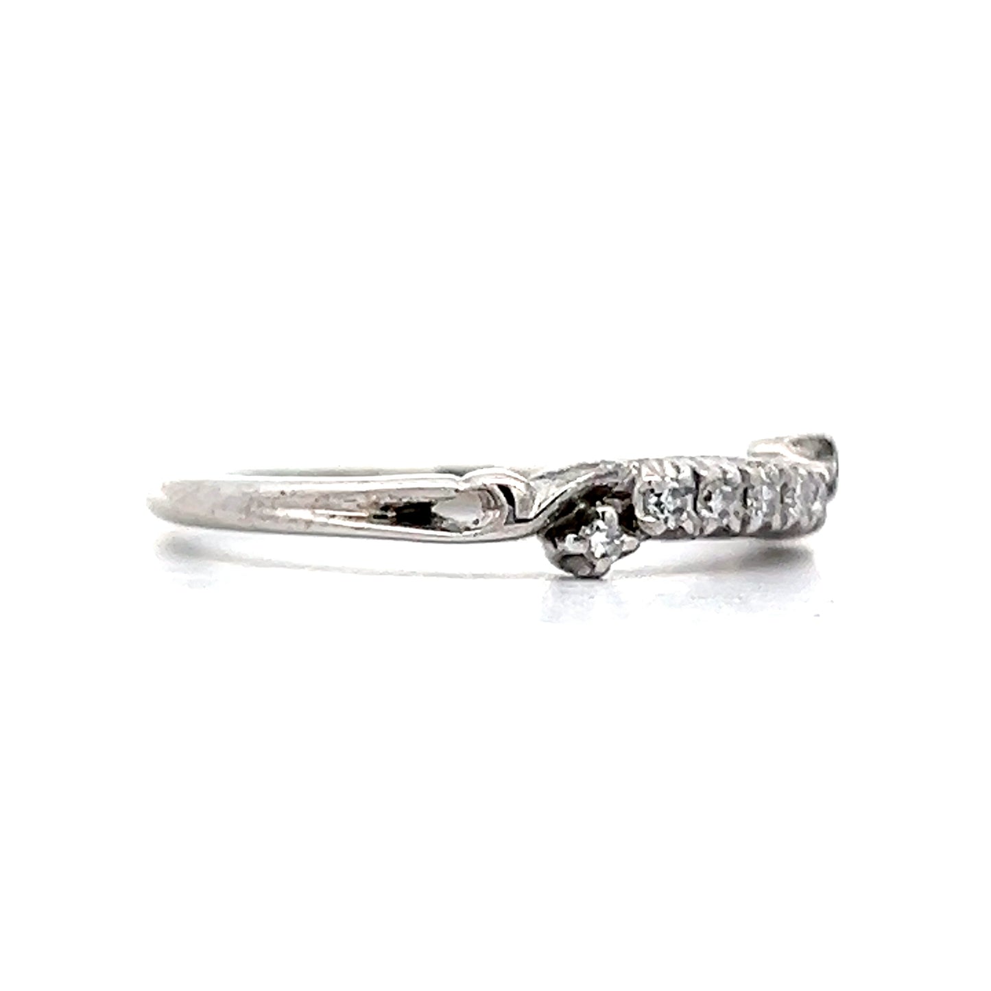 This deco asymmetrical diamond wedding band showcases a bold and unique design. Crafted in 18 karat white gold, the band features a single round brilliant cut diamond weighing .10 carats, with a VS2 clarity and G-H color that gives it a bright and clear sparkle. Additional single cut diamonds are prong set along the band, catching light beautifully to enhance the overall sparkle.