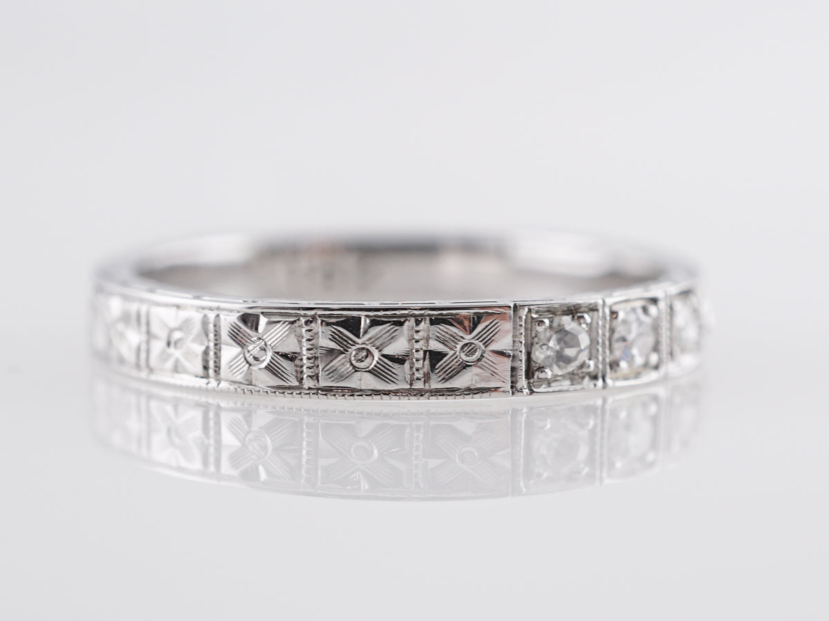 This lovely Art Deco wedding band features single cut diamonds in shimmering 18k white gold. The diamonds reflect a strong brilliance when touched with light. Mounted on a boxy, futuristic band that is reminiscent of iconic Art Deco design. Streamlined and graphical designs. A vintage gem from the Art Deco period.