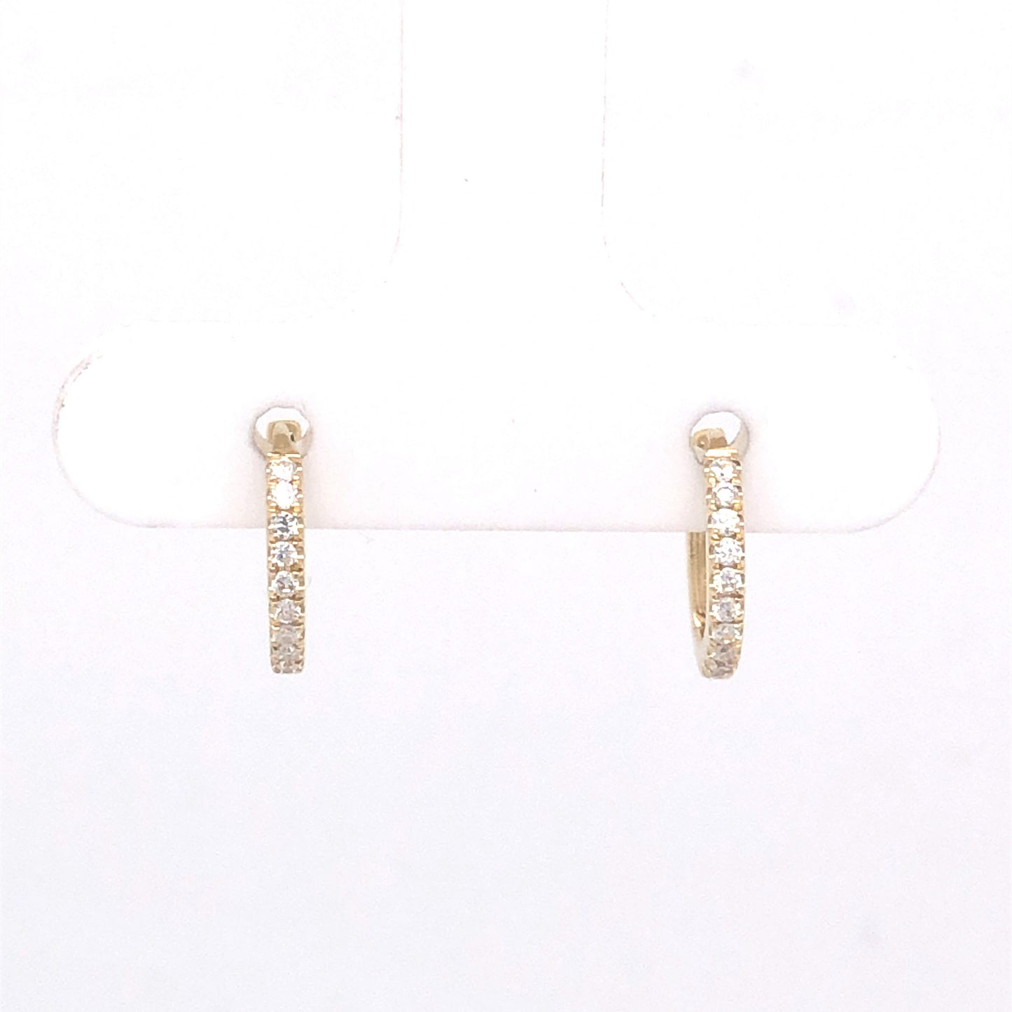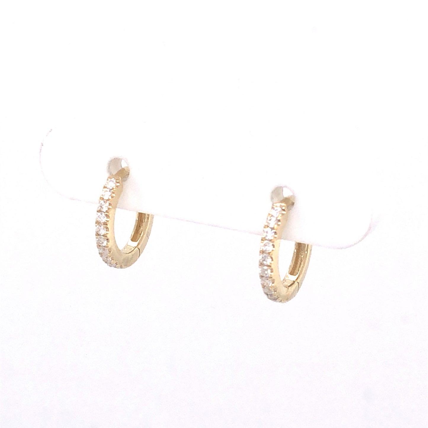 .10 Diamond Hoop Earrings in 14K Yellow Gold. These lovely, huggie hoop earrings feature .10 carats of sparkling diamonds in polished 14 karat yellow gold. Curving halfway around the hoops, twenty (20) .005 carat diamonds gives an undeniable brilliance to the warm yellow gold structure. The diamonds are near colorless and set in delicate French V split prongs. These hoops will glitter from every angle and are perfect for any wardrobe style!