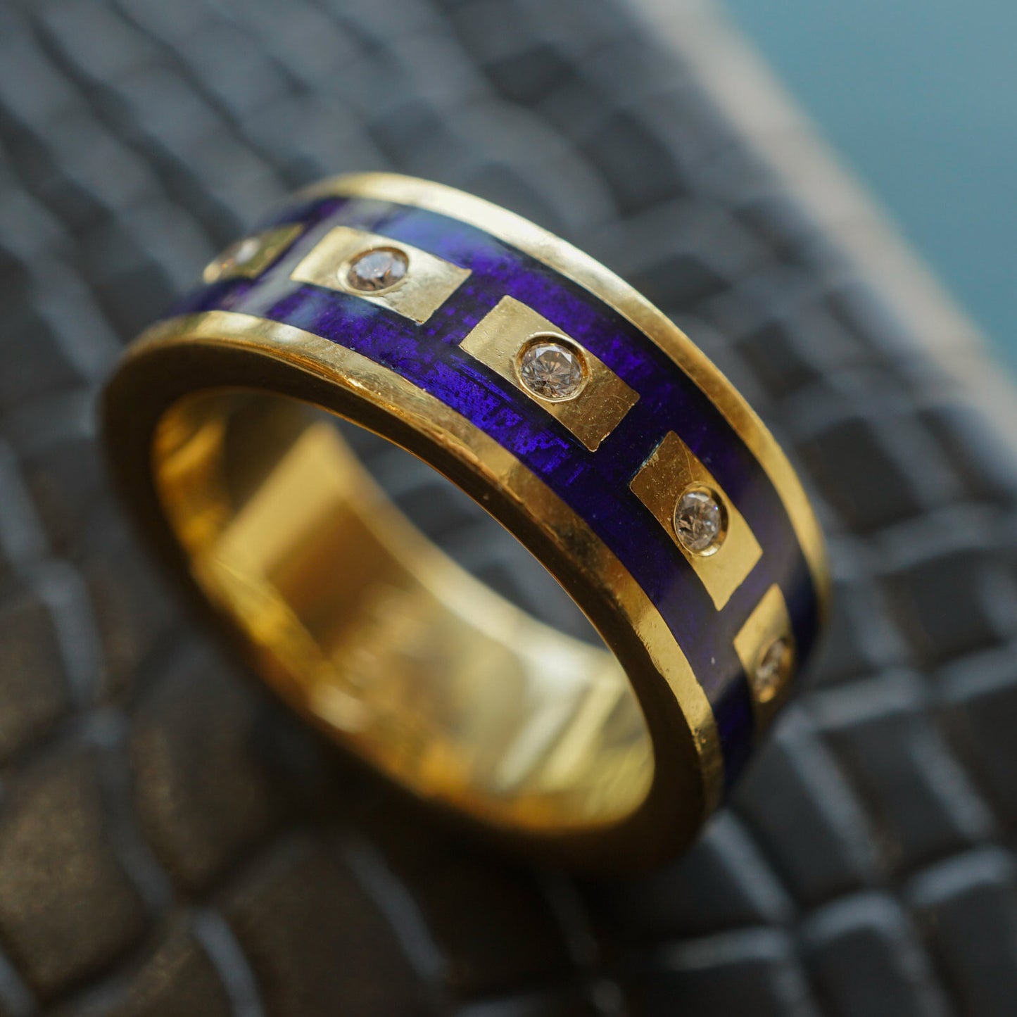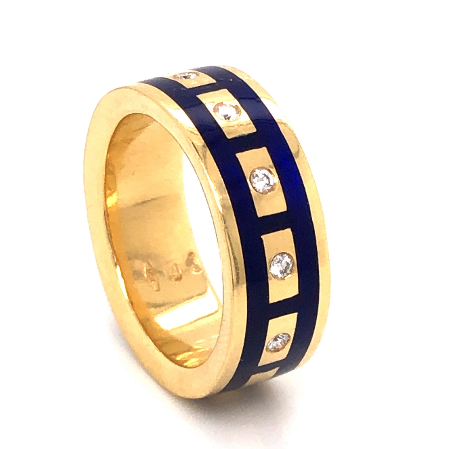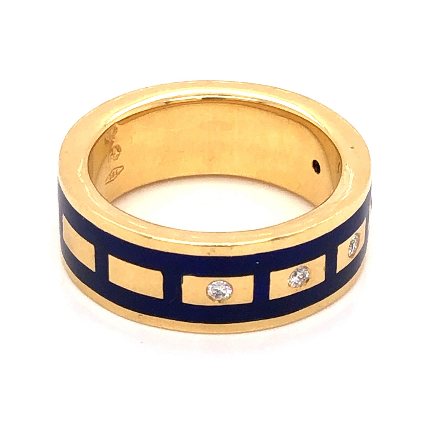 .10 Diamond Right Hand Ring in 18K Yellow Gold w/ Blue Enamel. This modern cocktail ring features .10 carats of Round Brilliant cut diamonds and vibrant blue enamel details finished in 18 karat yellow gold. Five (5) .02 carat diamonds are set flush and mounted on a 7.52mm wide band. The Round Brilliant diamonds are near colorless and punctuate the boxy blue enamel design. A timeless modern band to wear for any occasion!