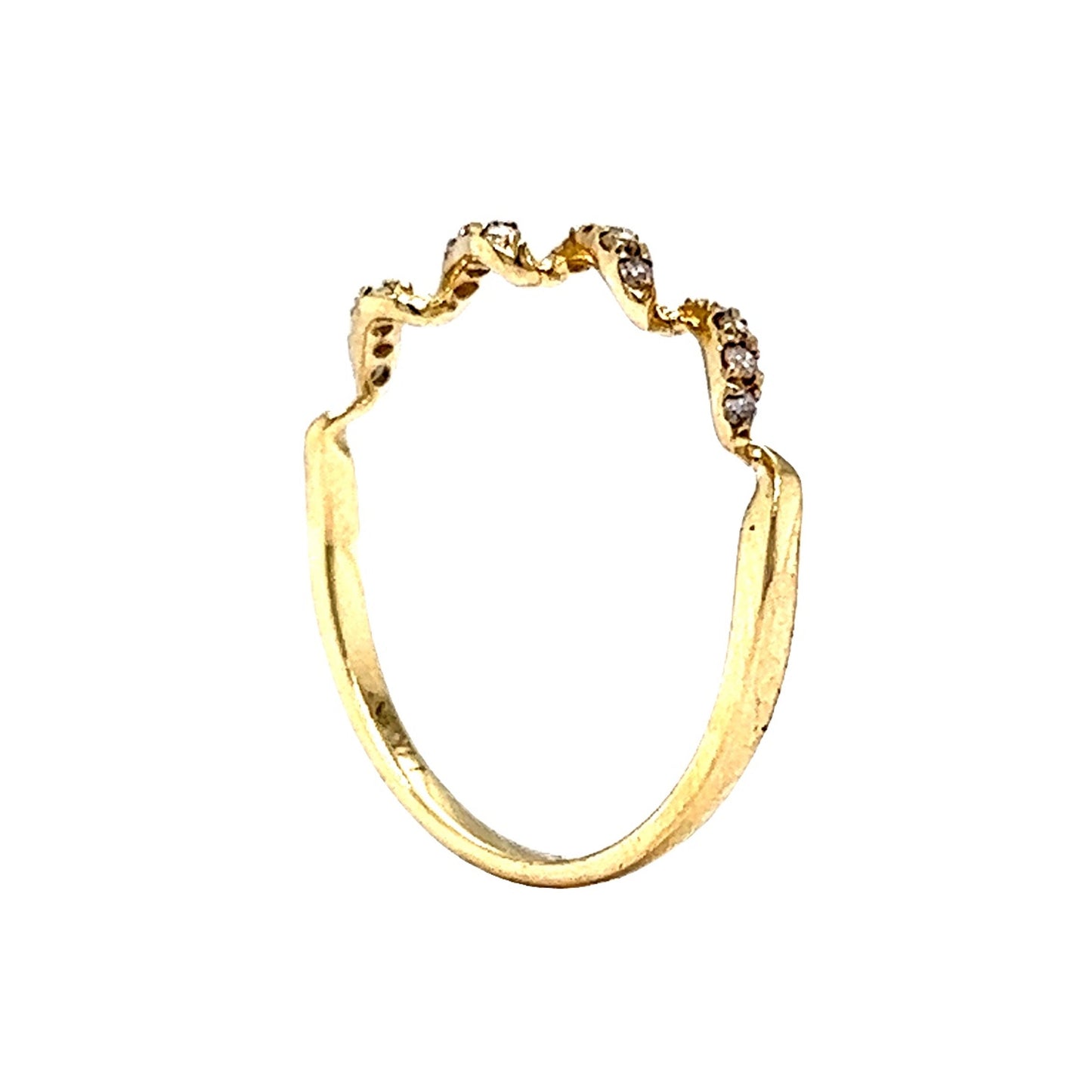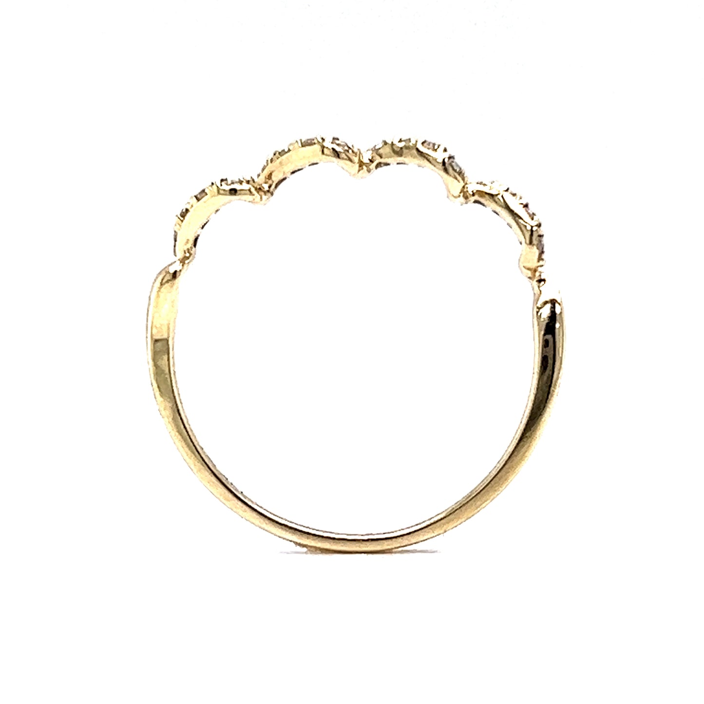 This beautiful modern wedding band is the perfect addition to any jewelry collection. Crafted in 14 karat yellow gold, this stacking ring features a row of round brilliant cut diamonds extending across the top. The diamonds are securely set in a pave setting, allowing the yellow gold metal to peek through. The entirety of the ring is finished with a high polish, creating a timeless look that is sure to stay in style for years to come.