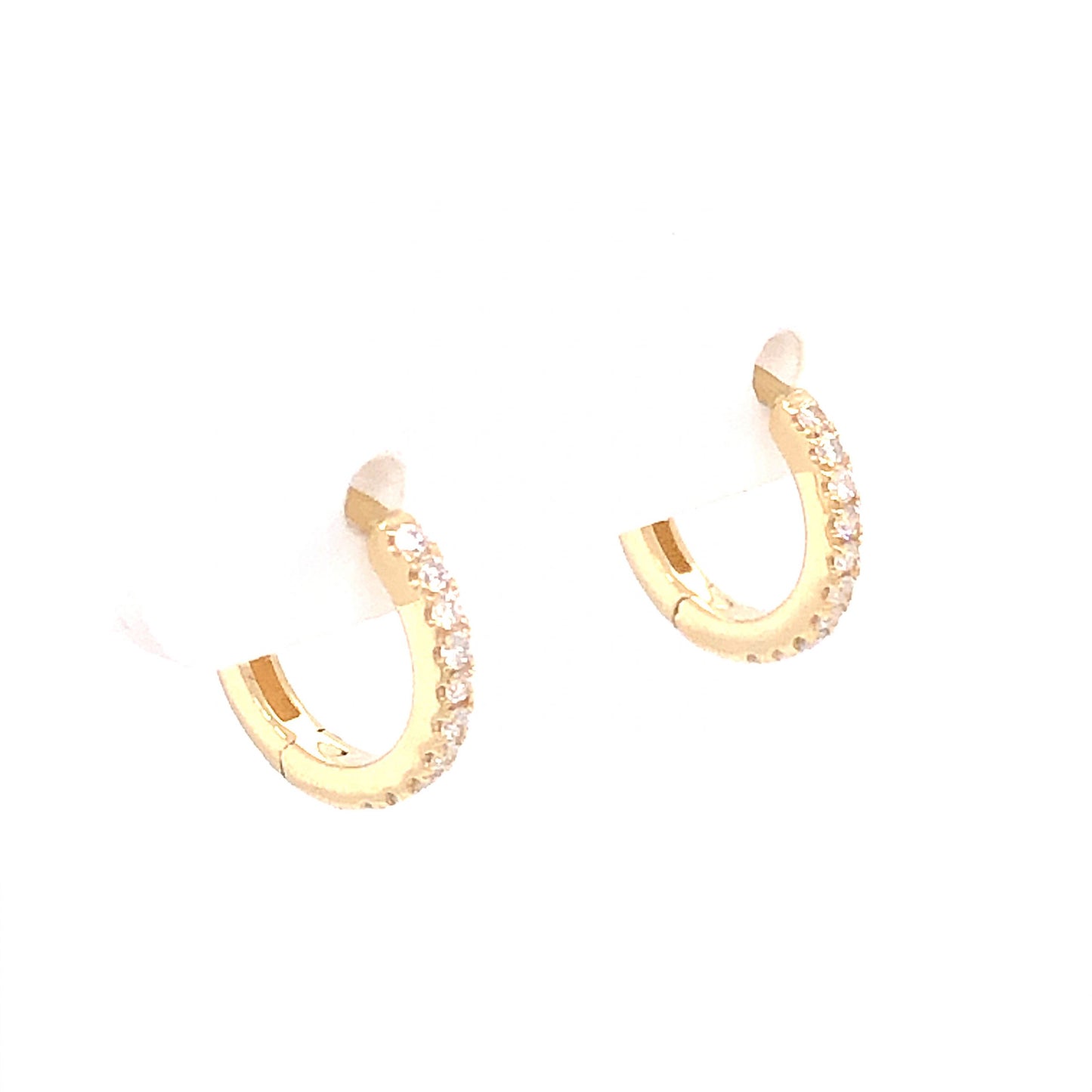 .10 Small Diamond Hoop Earrings in 14K Yellow Gold. These small hoop earrings feature .10 carats of sparkling diamonds in polished 14 karat yellow gold. Curving halfway around the petite hoops, twenty (20) .005 carat diamonds gives an undeniable brilliance to the warm yellow gold structure. The diamonds are near colorless and set in delicate French V split prongs.