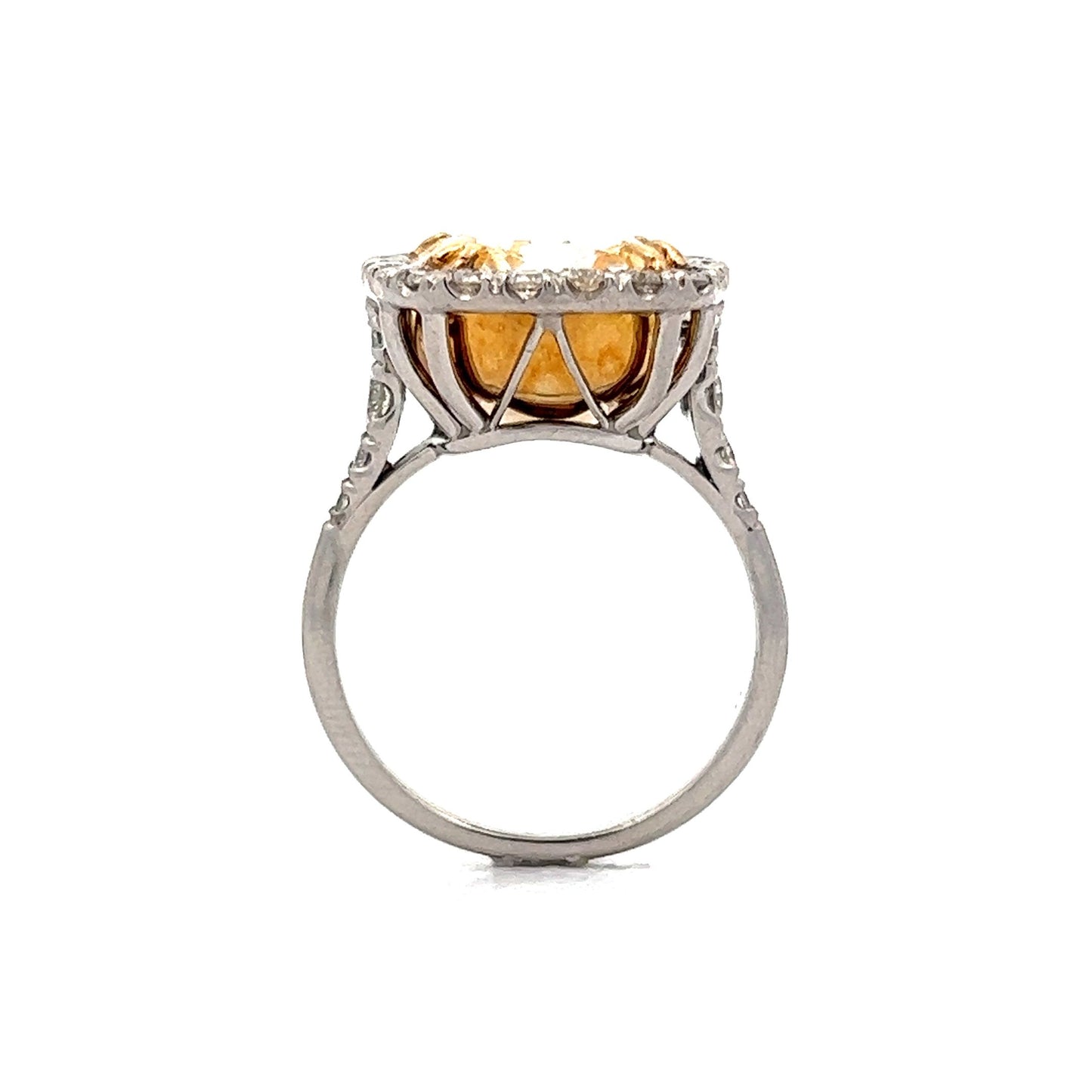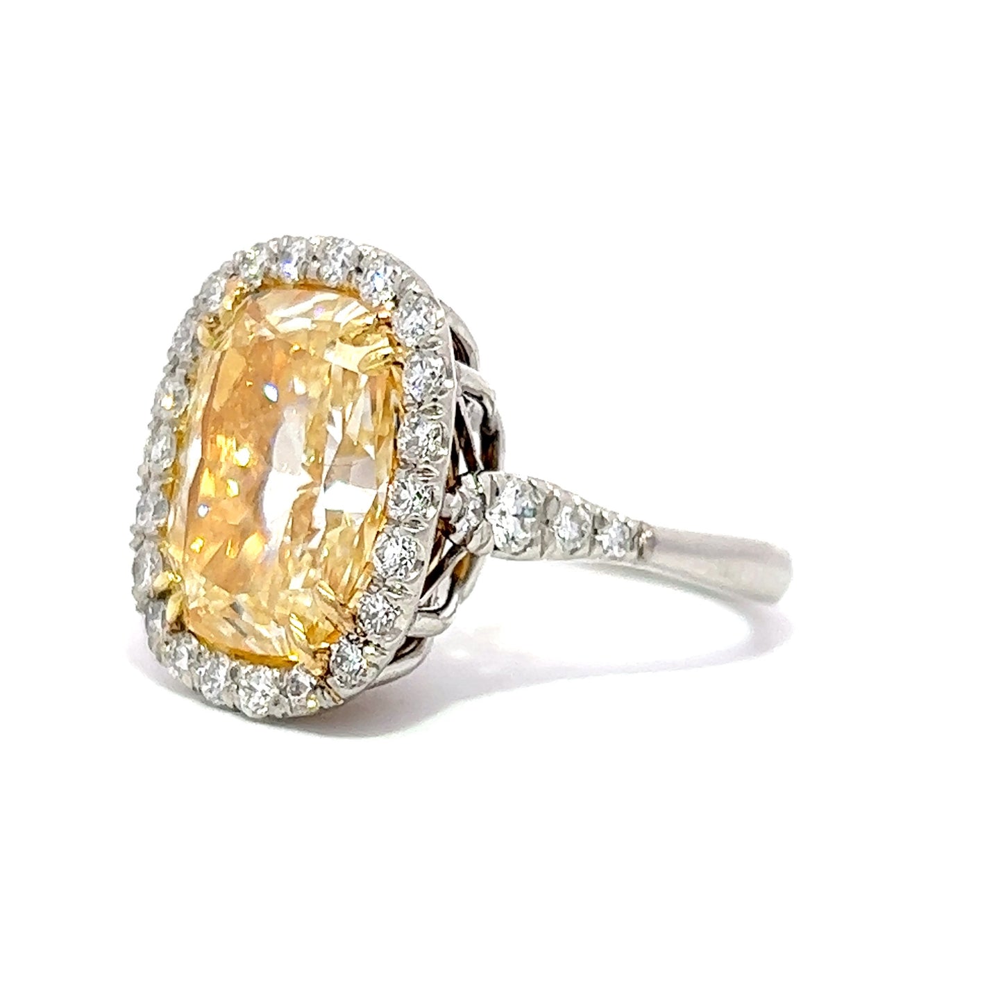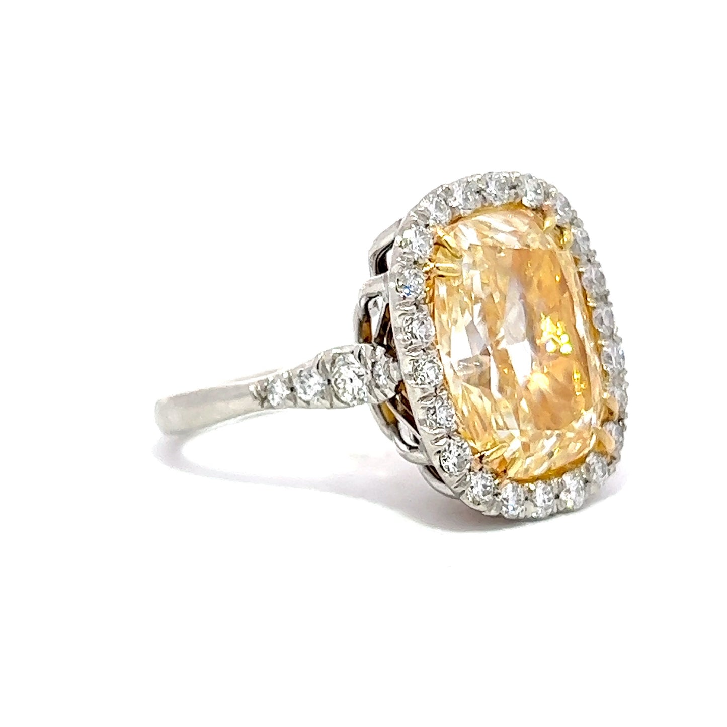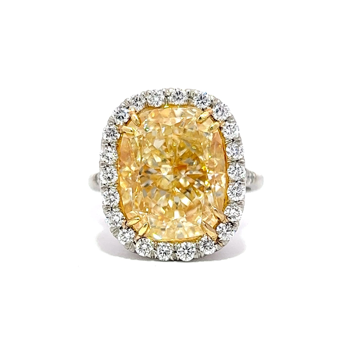 This modern engagement ring features a mesmerizing 11.79 carat cushion cut Fancy Yellow diamond in polished platinum and 18 karat yellow gold. The center diamond is cut for maximum sparkle and fire, with a beautiful cushion shape that slenderizes the finger. Set in four prongs, the diamond is accented by twenty-eight (28) .02 carat near colorless accent diamonds, each set in secure shared prongs. From the profile, a modern halo setting holds the collection of diamonds, finished on a polished platinum and 18 karat yellow gold band. It's hard to beat a fancy yellow diamond and one of this magnitude makes a serious statement.