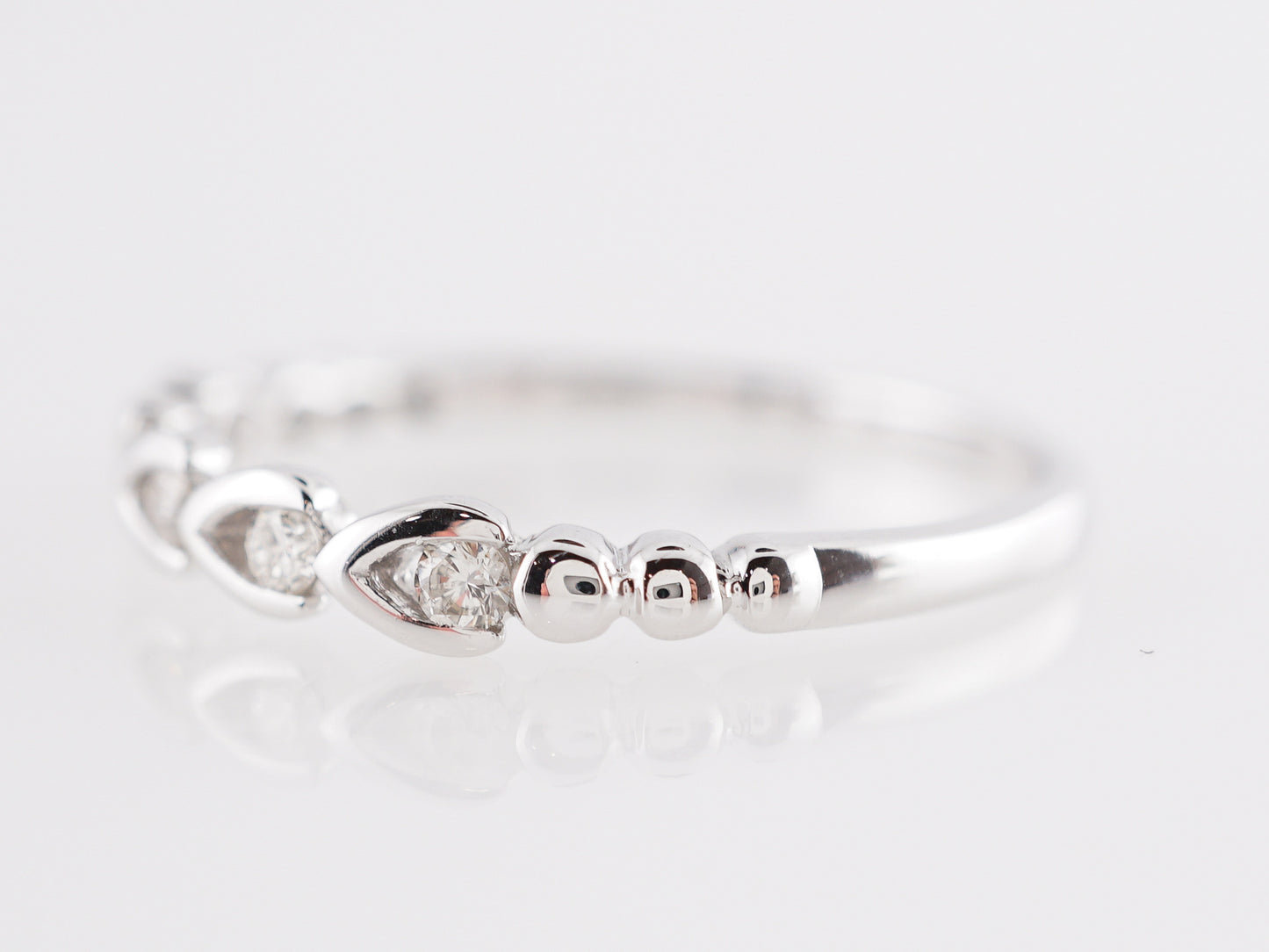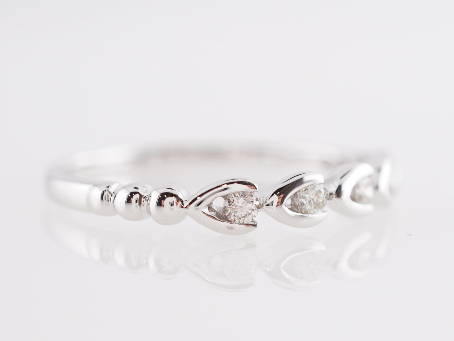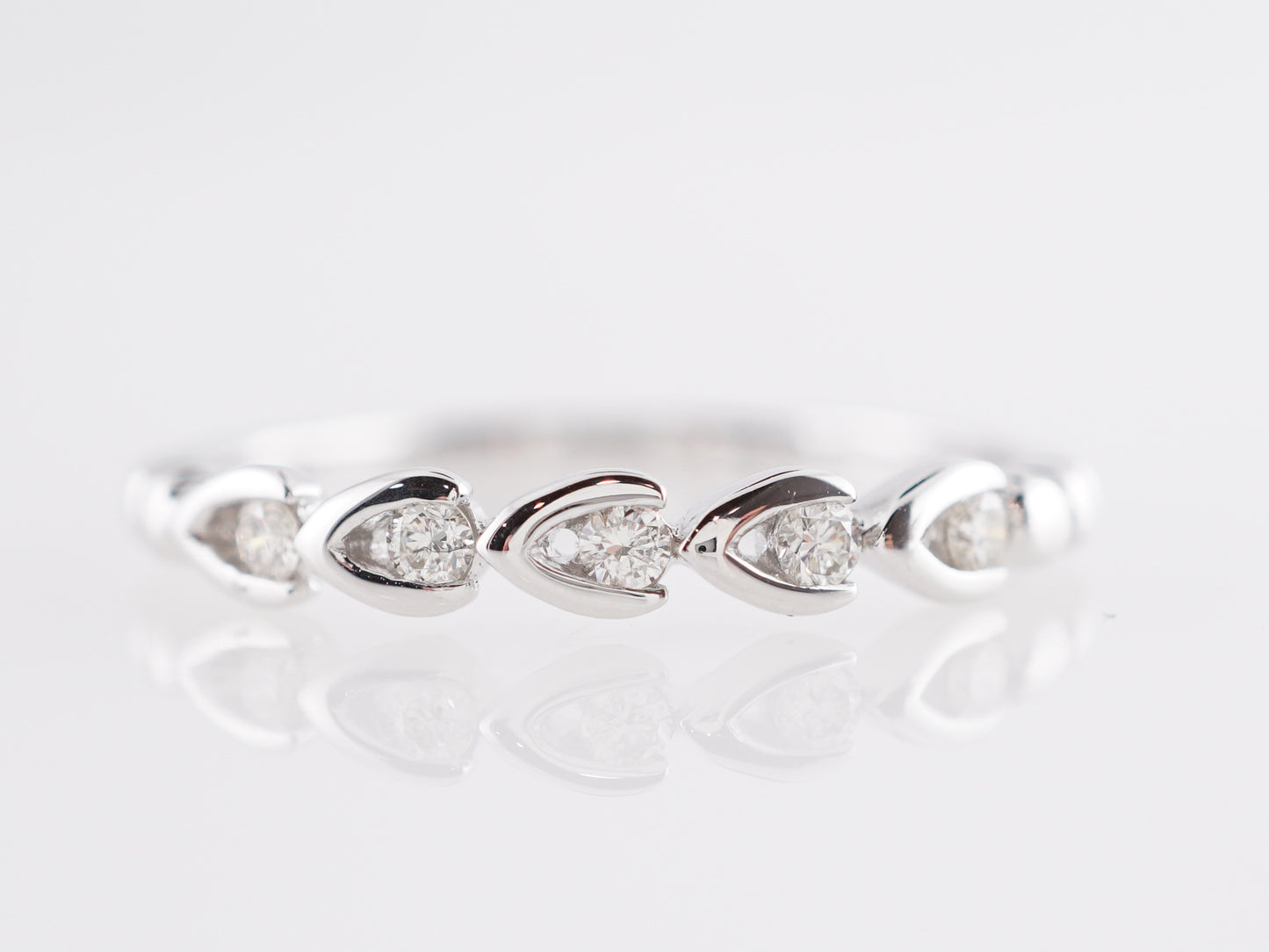 This modern wedding band features .11 carats of genuine natural diamonds in dazzling 14k white gold. The half-eternity band has a shimmering wishbone design that cradles each petite diamond inside its prongs. The band also features ornate spheres that punctuate the shoulders of the ring. This wedding band will look absolutely beautiful paired with any engagement ring or can be stacked for a more modern, fashionable look!