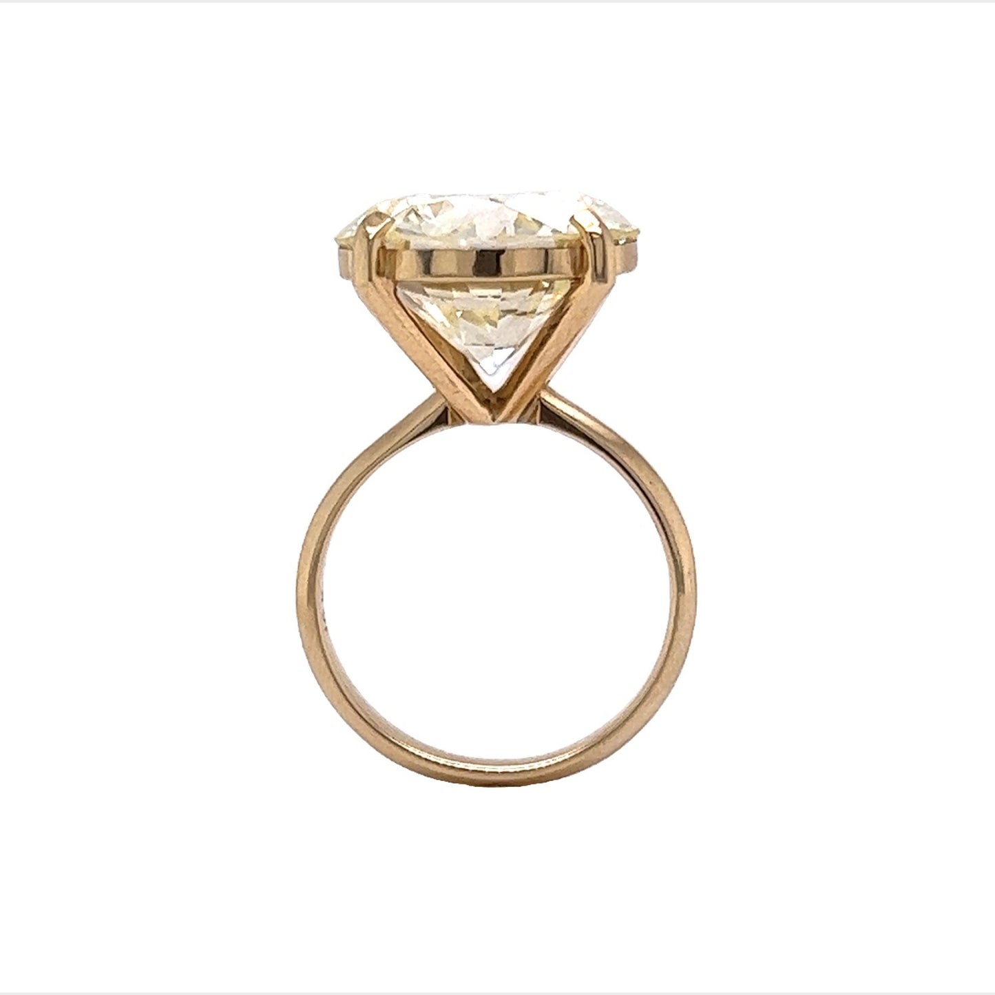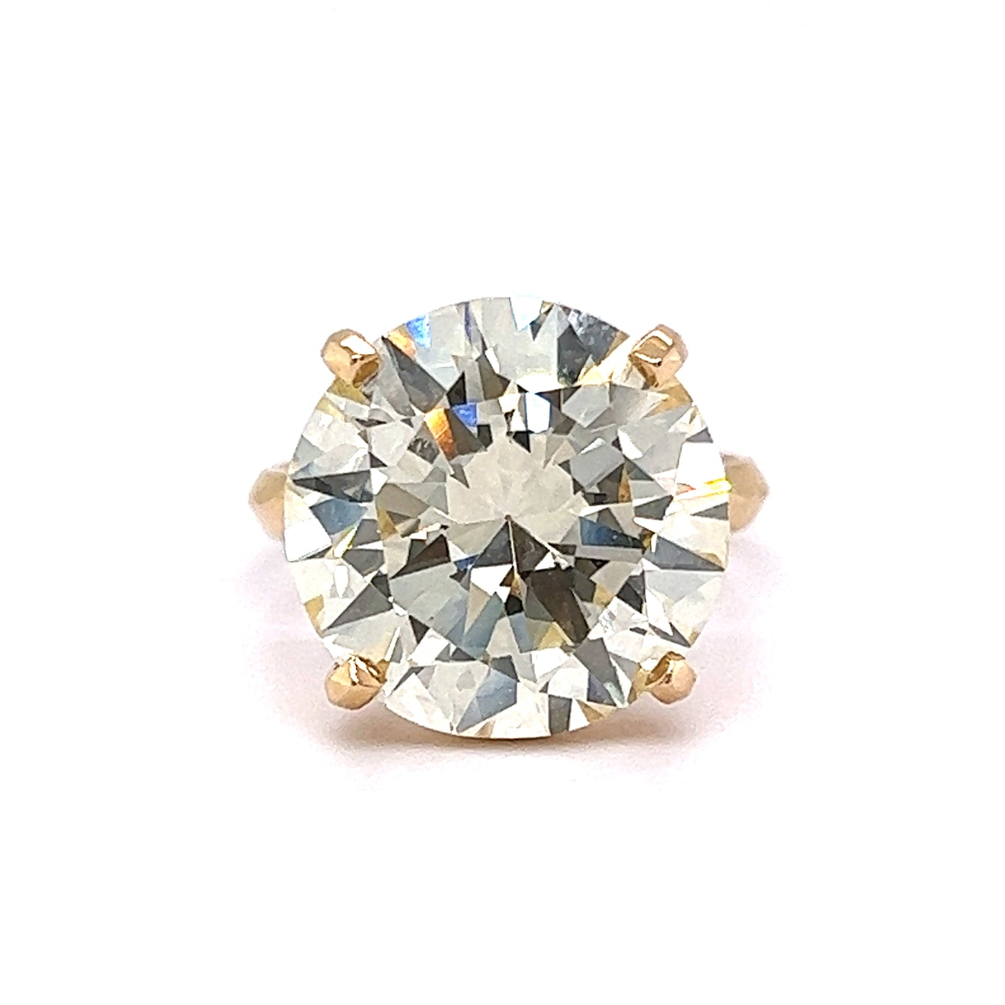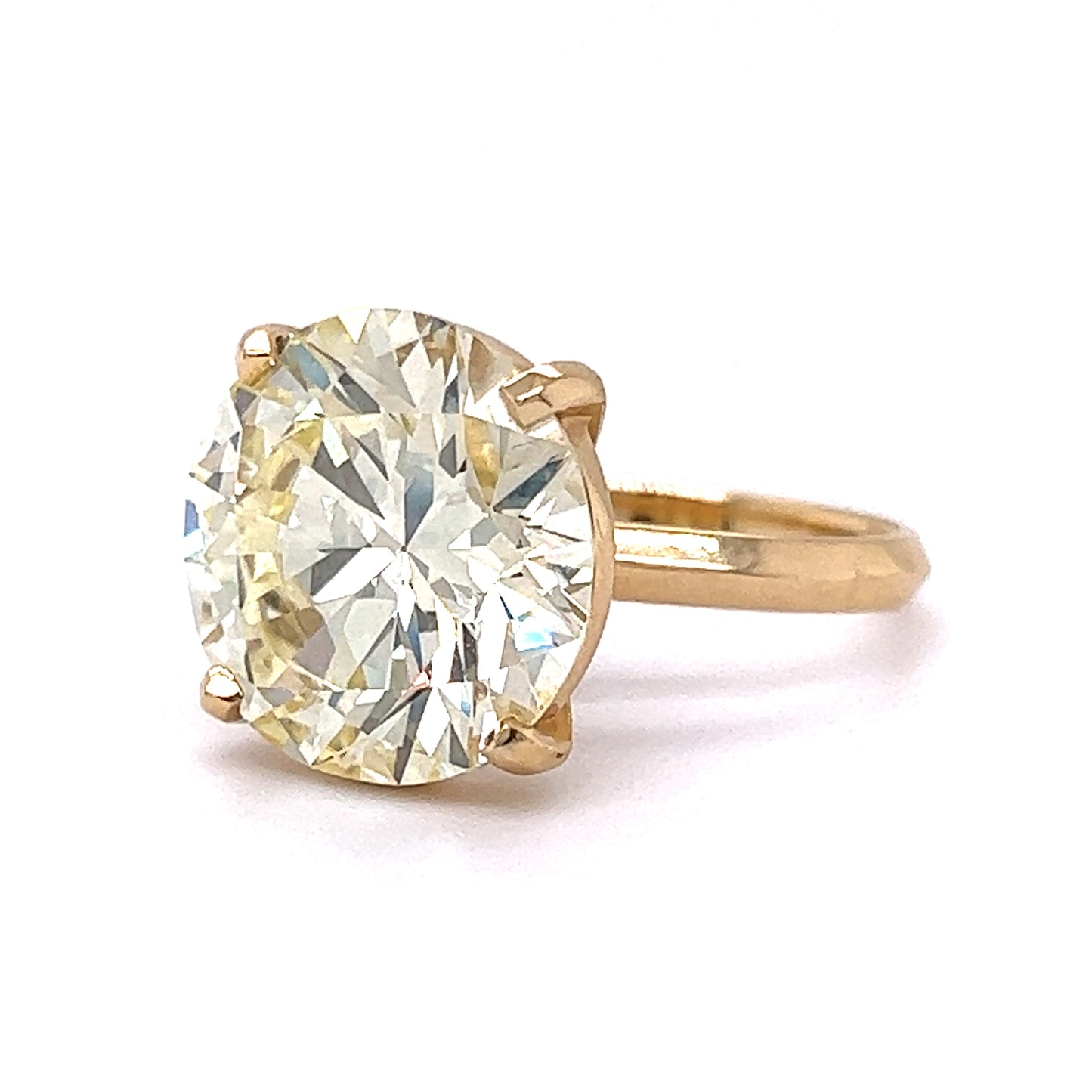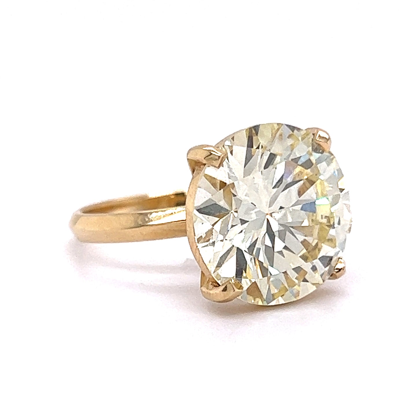 11 Carat Diamond Engagement Ring in 14K Yellow Gold. This elegant diamond engagement ring features an 11.11 carat GIA-certified Round Brilliant cut diamond finished in 14 karat yellow gold. Set in four golden prongs, the impressive solitaire diamond has ample amounts of brilliance and fire. Dazzling from every angle, this ring is truly breathtaking. From the profile, an openwork peg mounting showcases the underside of the diamond. Finished on a comfort fit 14K yellow gold ring, this GIA engagement ring is truly unforgettable.