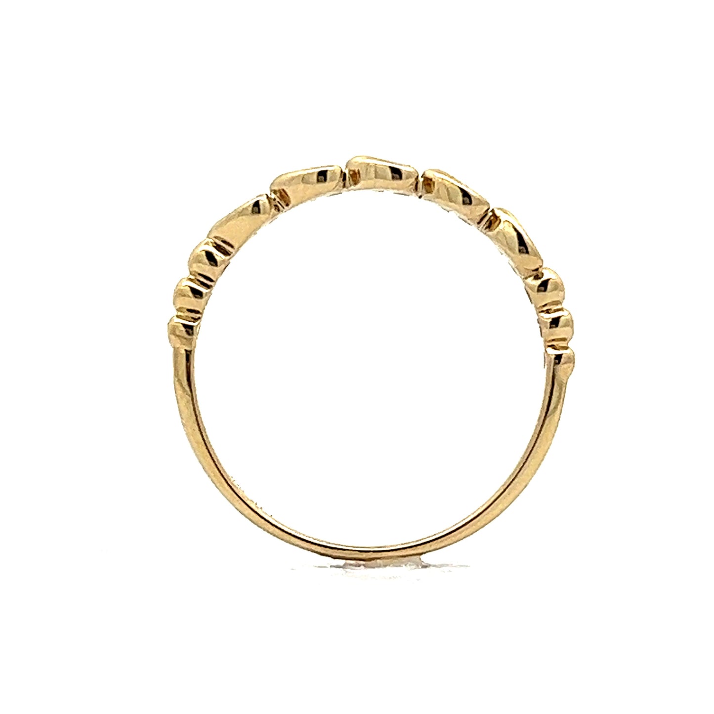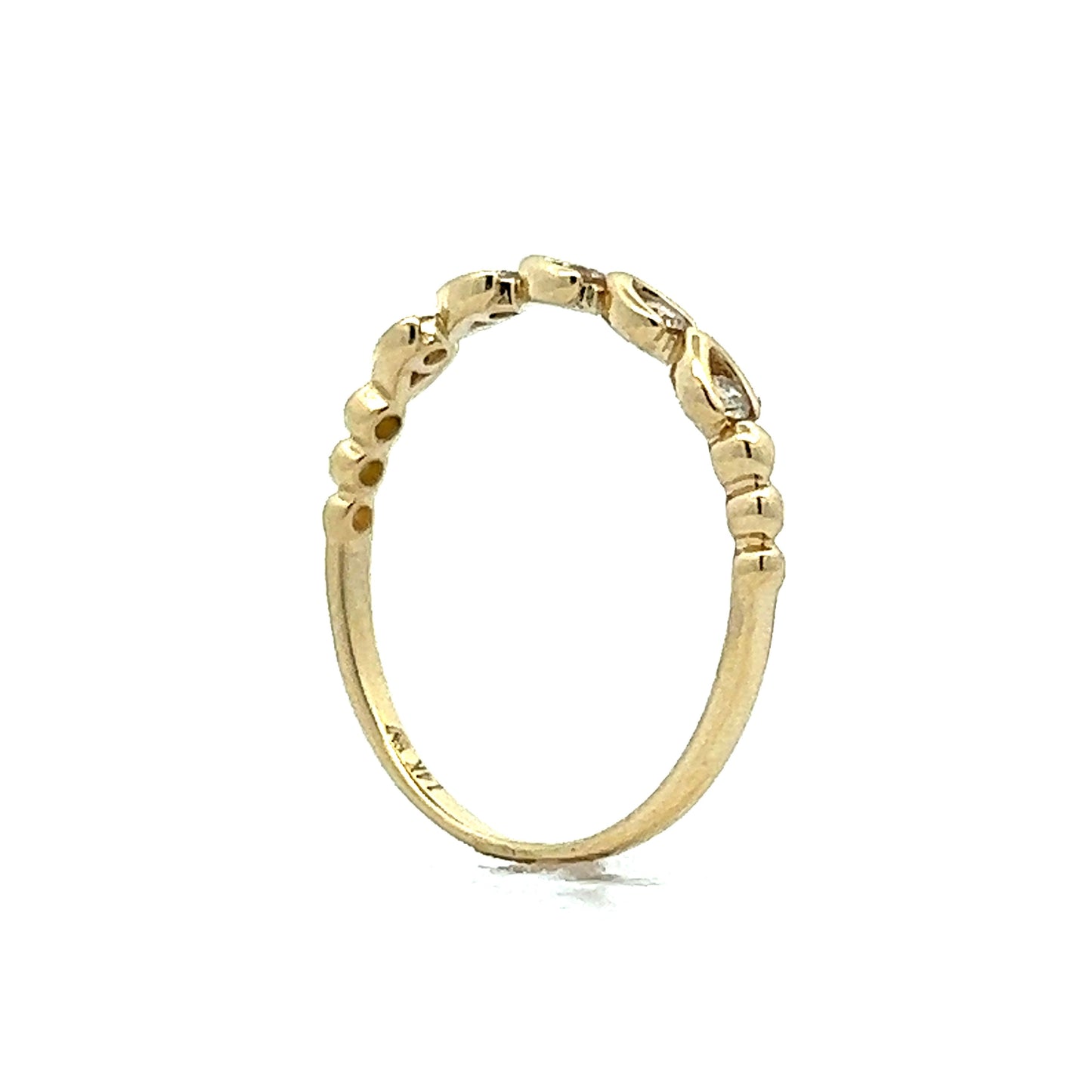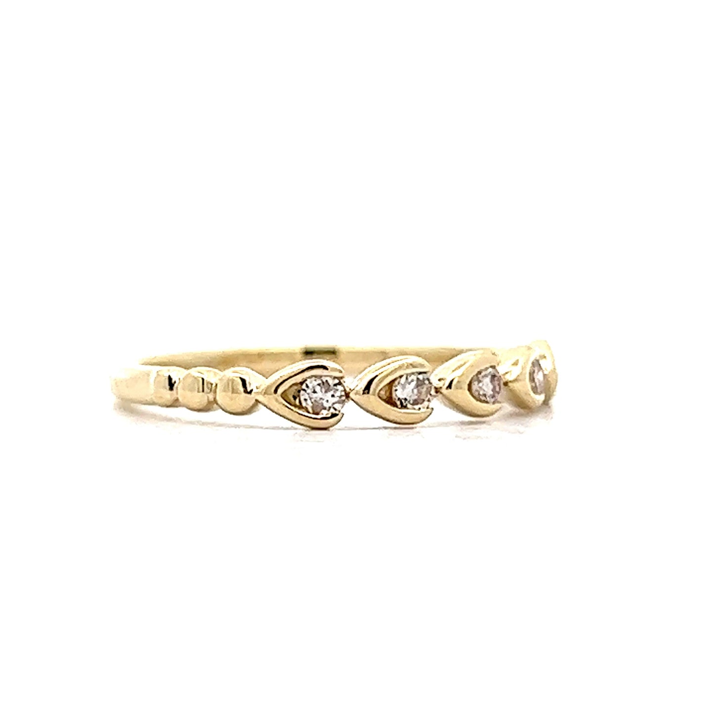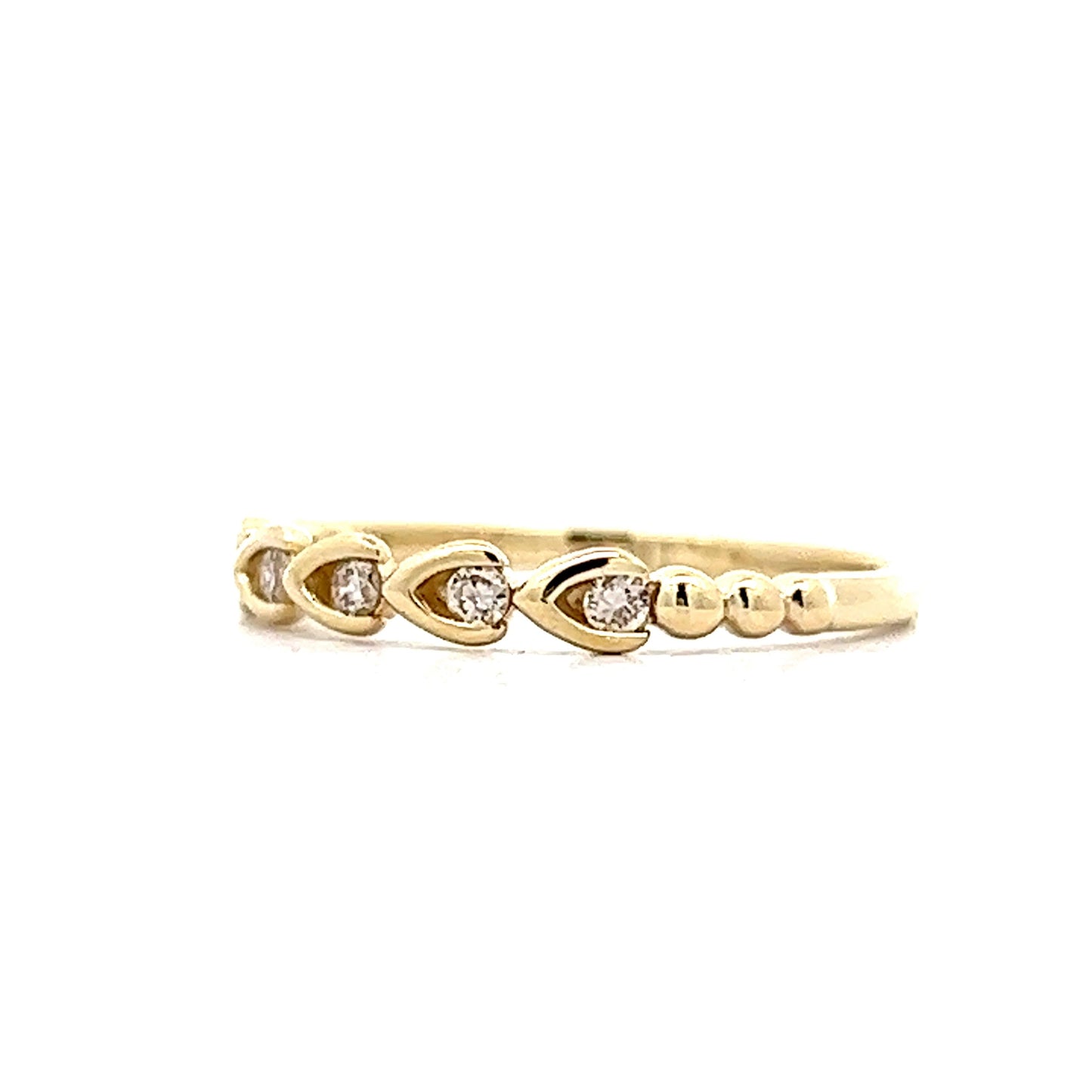 This one of a kind wedding band features .11 carats of genuine natural diamonds in 14k yellow gold. The half-eternity style ring has a unique, golden wishbone design that cradles each petite diamond inside its prongs. The band also features ornate, golden spheres that punctuate the shoulders of the ring. This wedding band will look absolutely beautiful paired with any engagement ring or can be stacked for a more modern, fashionable look!