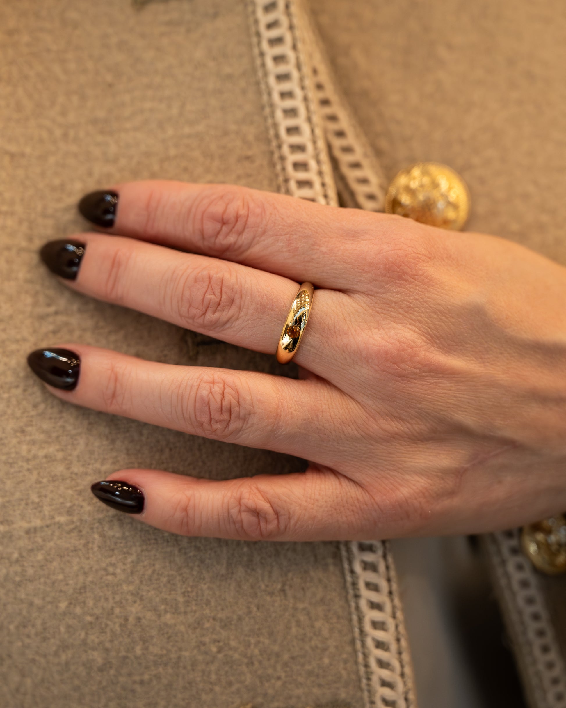 The round cut maximizes the stone's fire and brightness, while the flush setting keeps the gemstone protected and practical for everyday wear. The band tapers for a comfortable fit that sits well on the finger. This design works solo or stacks easily with other rings for a layered effect.