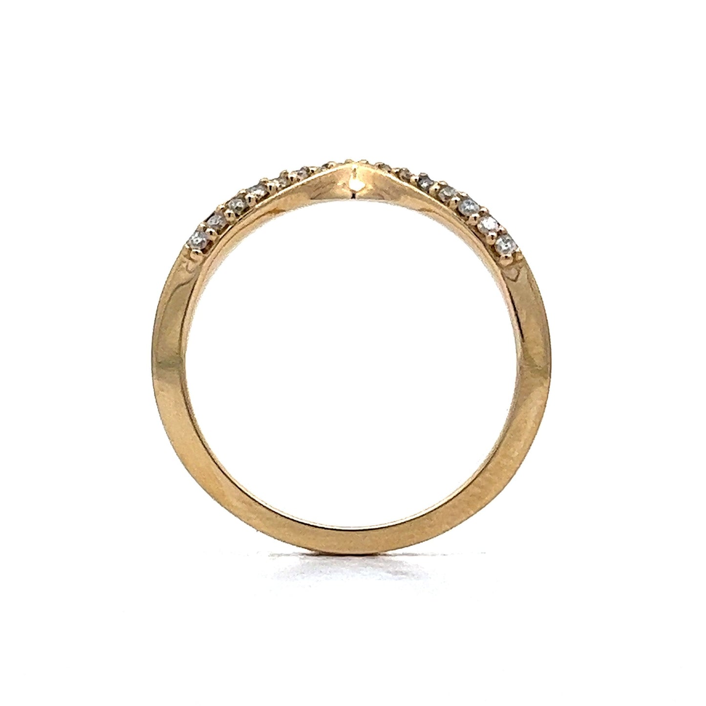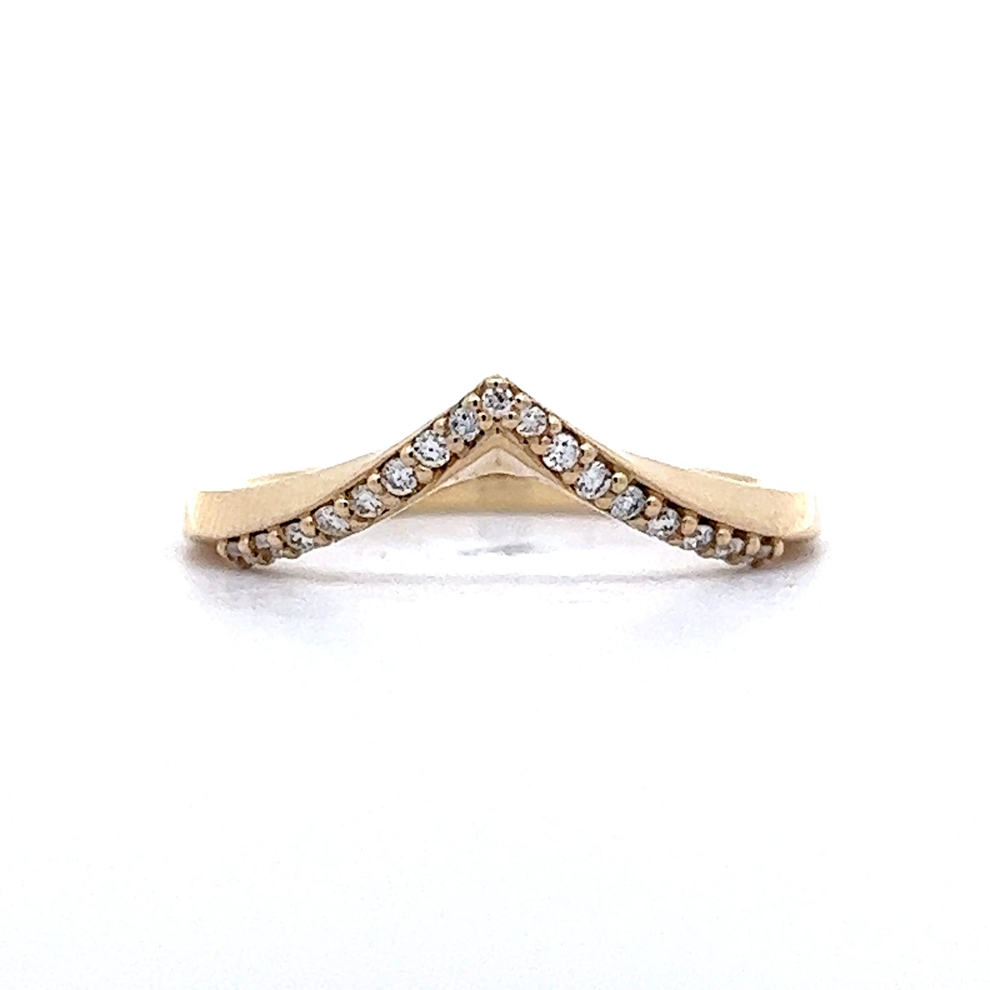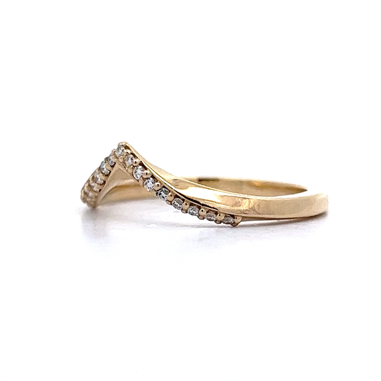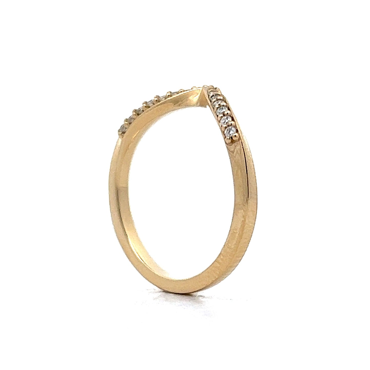 This modern contoured V-shaped wedding band is perfect next to a low profile engagement ring. Crafted from 14 karat yellow gold, the band features round diamonds as the centerpiece with a clarity of SI1 and a color of H. With its unique contoured design and glittering stones, this wedding band is a timeless piece that will be cherished for years to come.