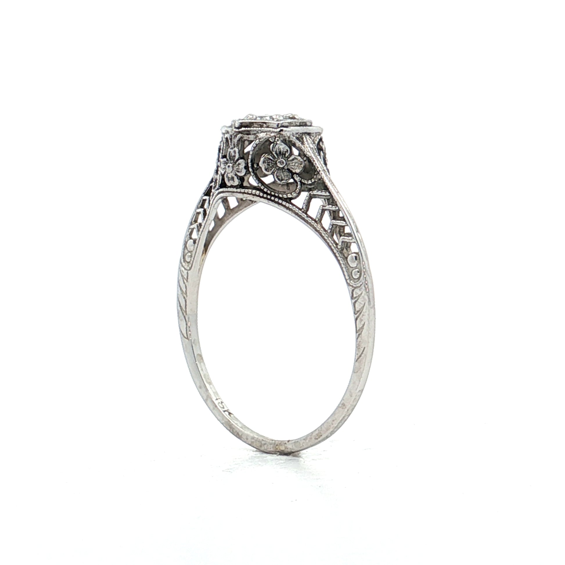 This Art Deco solitaire engagement ring features a .12 carat old European cut diamond with VS2 clarity and I color set in a hexagon-shaped head of 18 karat white gold. The band displays floral filigree mounting with orange blossom motifs throughout the design. The intricate openwork patterns and nature-inspired decorative elements reflect the ornate metalwork popular in jewelry from the 1920s-1930s.