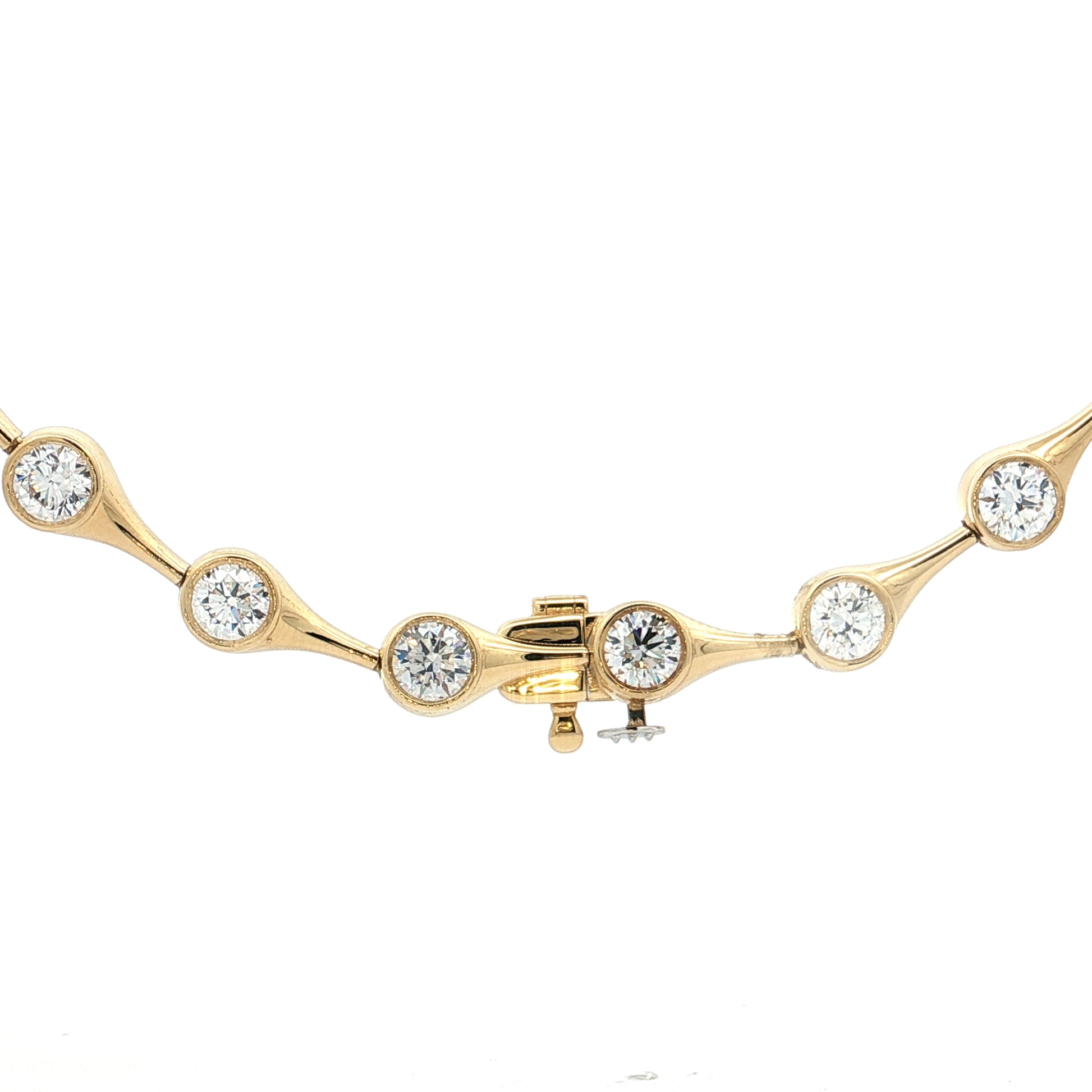 This 18 karat yellow gold necklace features 36 round brilliant cut diamonds arranged in bezel-set raindrop stations along its 16-inch length. Each diamond measures 4.5mm and weighs .30 carats, bringing the total carat weight to 12.00 carats.