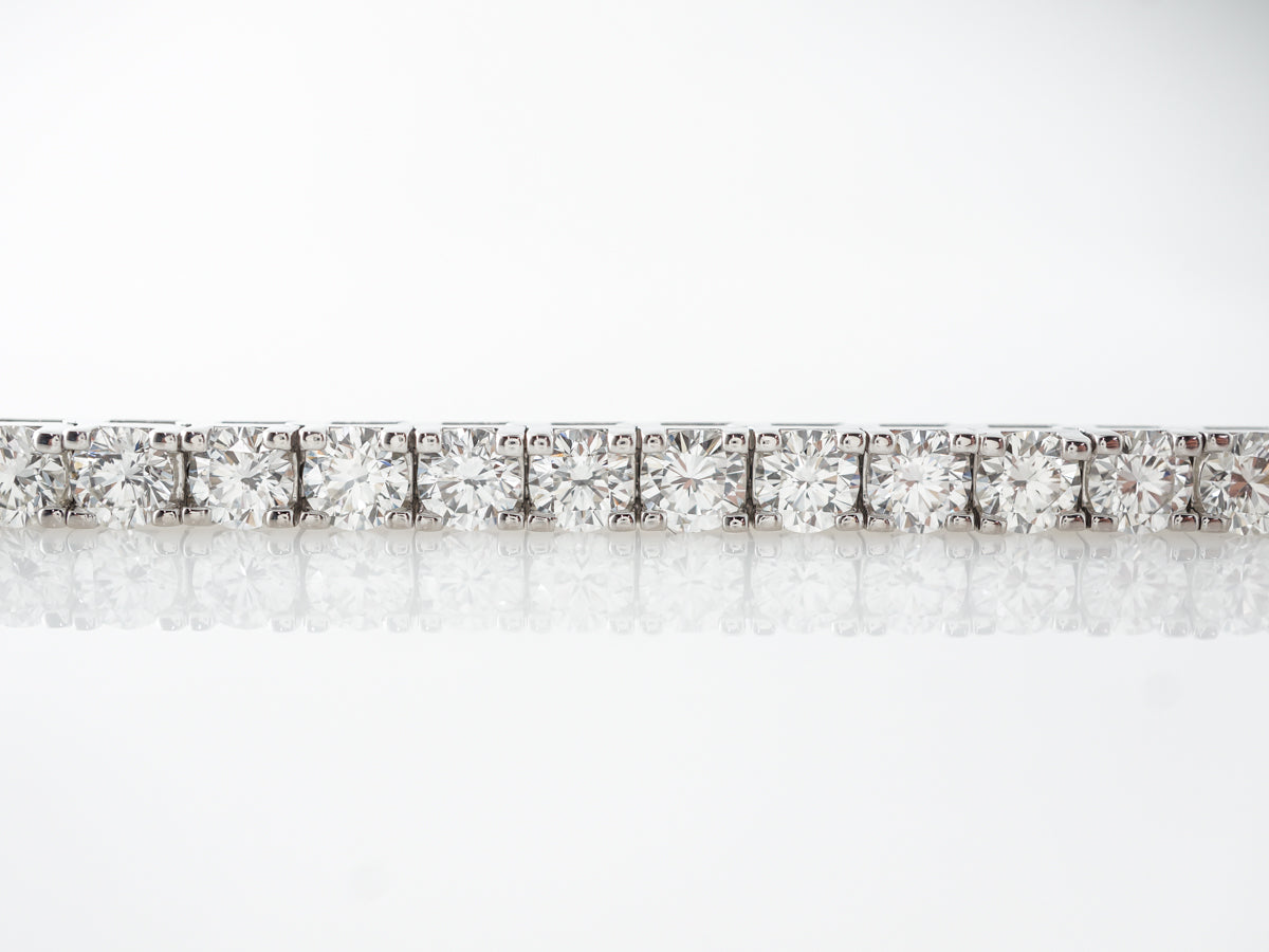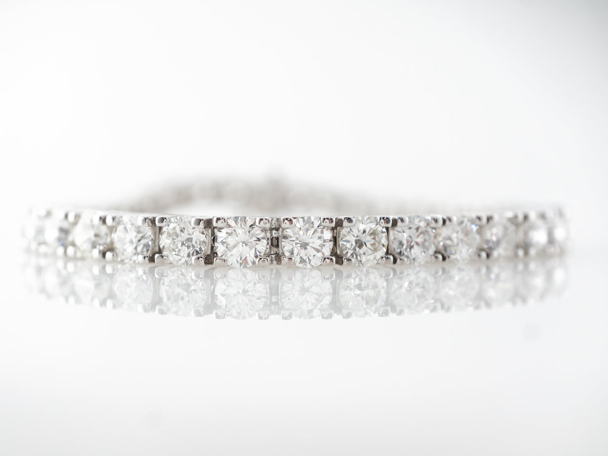 12 Carat Diamond Bracelet in 14k White Gold. This modern tennis bracelet contains 12.96 carats of round brilliant cut diamonds set in 14 karat white gold. The tennis bracelet is a classic staple in any jewelry collection and this one makes use of G and H color diamonds to dazzle in their white gold settings.
