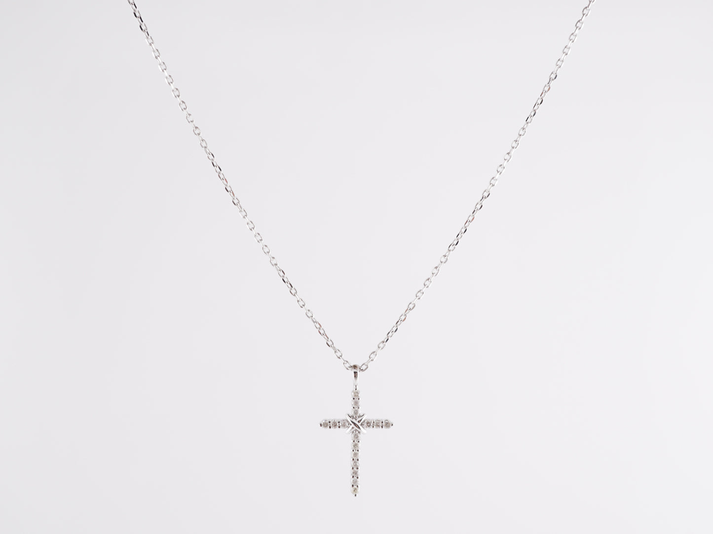 .12 Diamond Cross Necklace in 14k White Gold. This angelic cross necklace features a total of .12 carat genuine natural diamonds on 14k white gold. This 17” chain necklace showcases round brilliant cut diamonds that are bead set, forming a beautiful cross pendant design. The stones meet in the middle of the pendant at a 14k white gold “x” at the heart of the cross. A meaningful symbol set in glittering, genuine diamonds!
