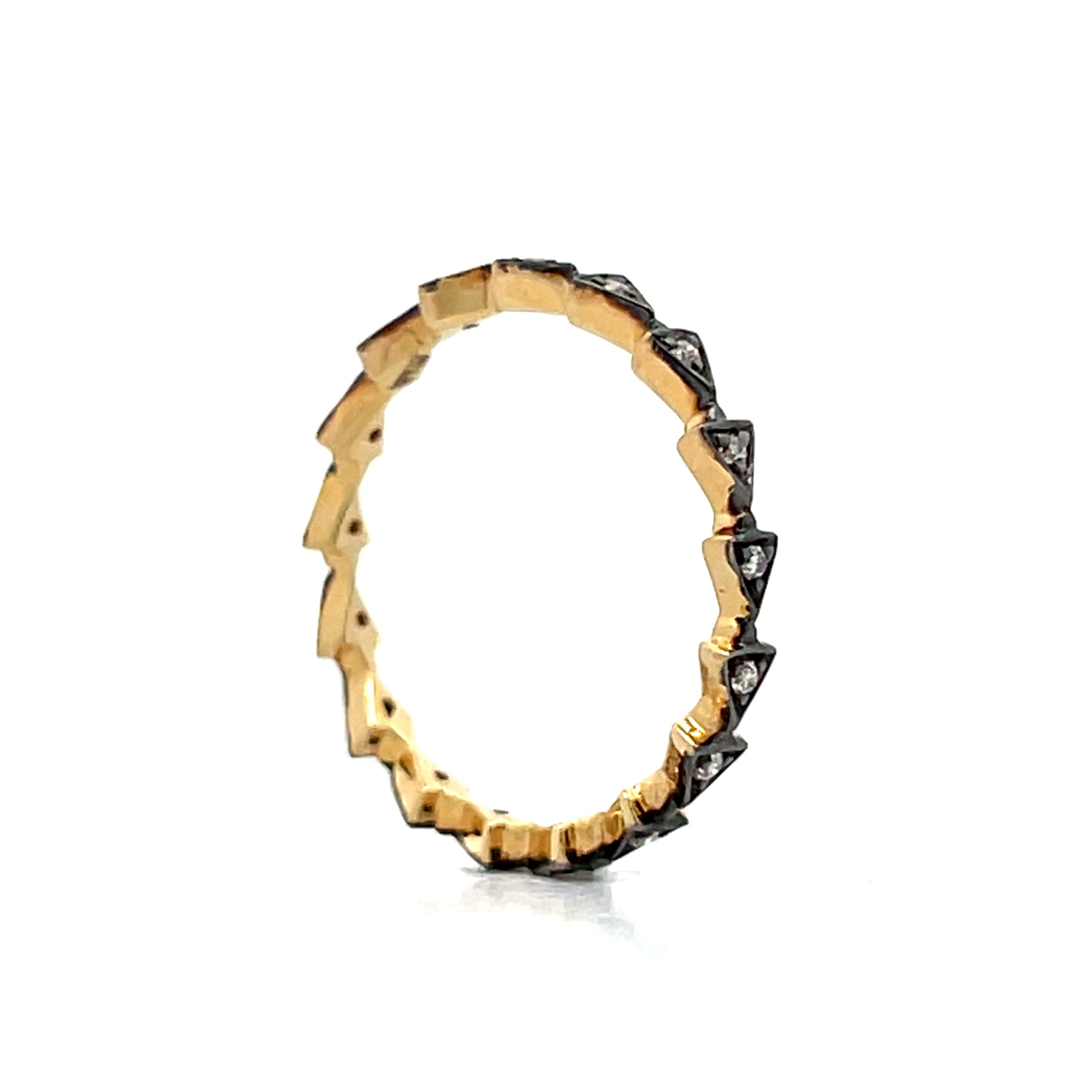 This diamond eternity band features 18 karat yellow gold with round brilliant cut diamonds circling the entire ring, each stone weighing .12 carats. The diamonds have VS2-SI1 clarity and J color grading. Triangle stations create geometric details throughout the band's design, while black rhodium finishing provides contrast against the yellow gold and diamonds. The continuous circle of diamonds makes this ring work well for stacking or wearing on its own.