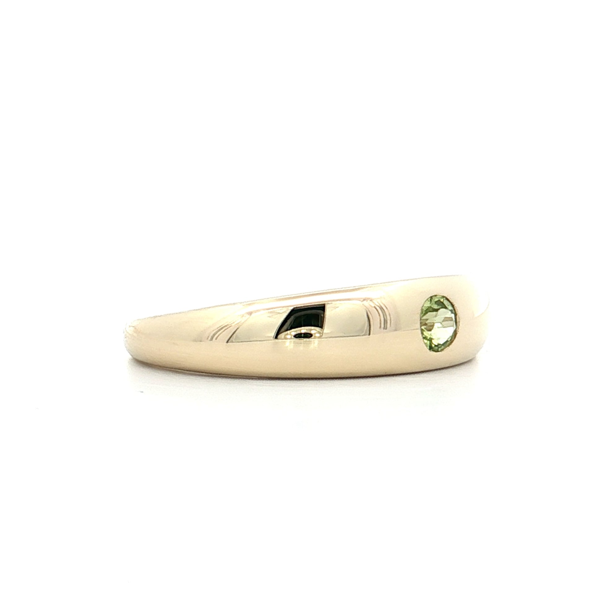 The 5 mm band tapers down from its widest point, making it comfortable to wear all day and allowing it to sit smoothly alongside other rings. The yellow gold provides a warm backdrop that complements the peridot's green tones, and at .12 carats, the stone adds noticeable color while maintaining a practical size for everyday wear.