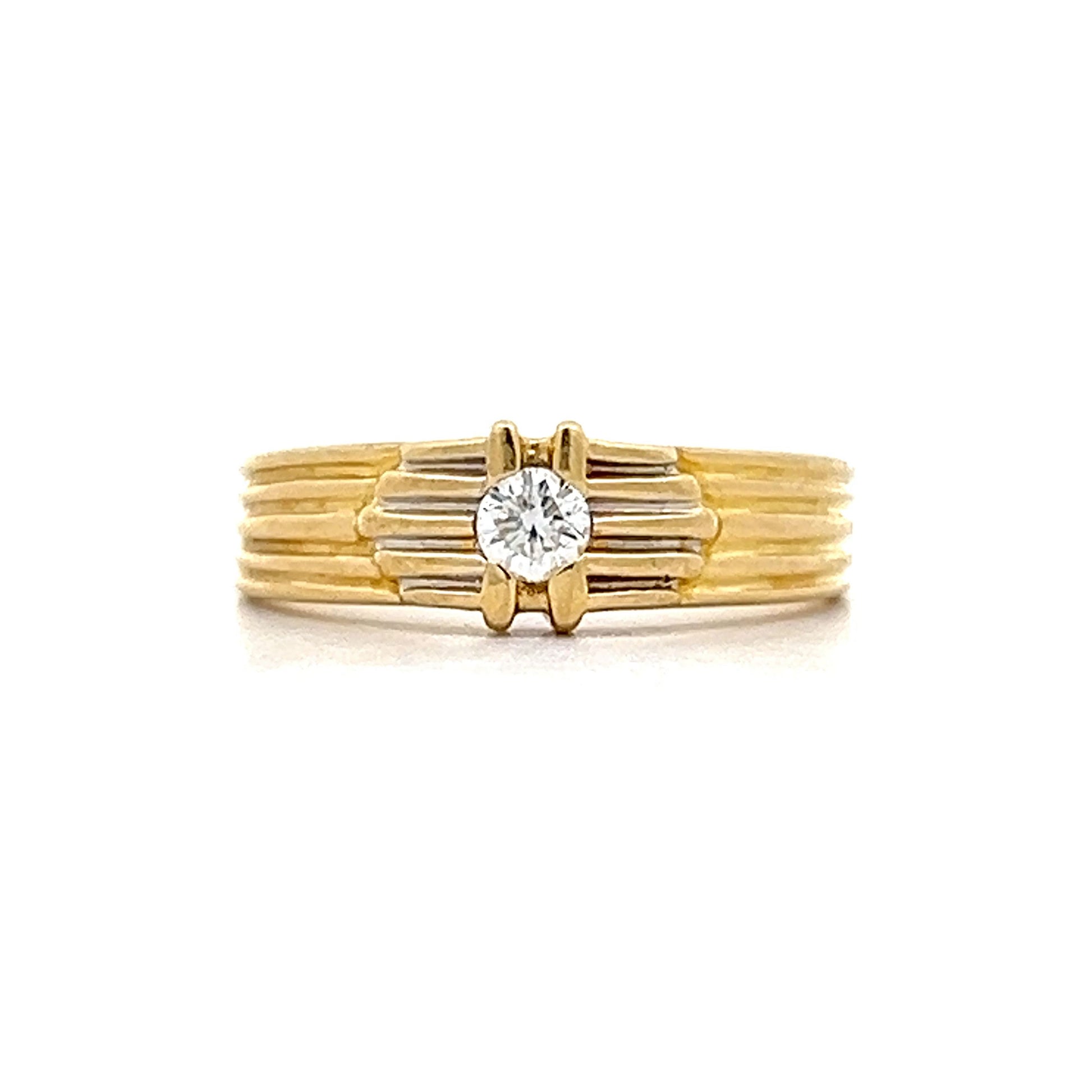 This Mid-Century stacking ring, crafted in 18 karat yellow gold, is a fun piece of vintage jewelry. Featuring a single round brilliant cut diamond weighing .12 carats, it has an exceptional VS2 clarity and a radiant G color. The diamond is flush set at the center, creating an elegant focal point. The polished yellow gold band includes subtle ridge detailing, adding sophistication to the design. Ideal for stacking or wearing solo, this ring adds a delightful vintage touch to any outfit.