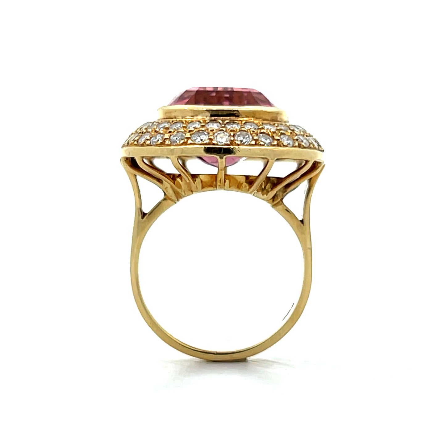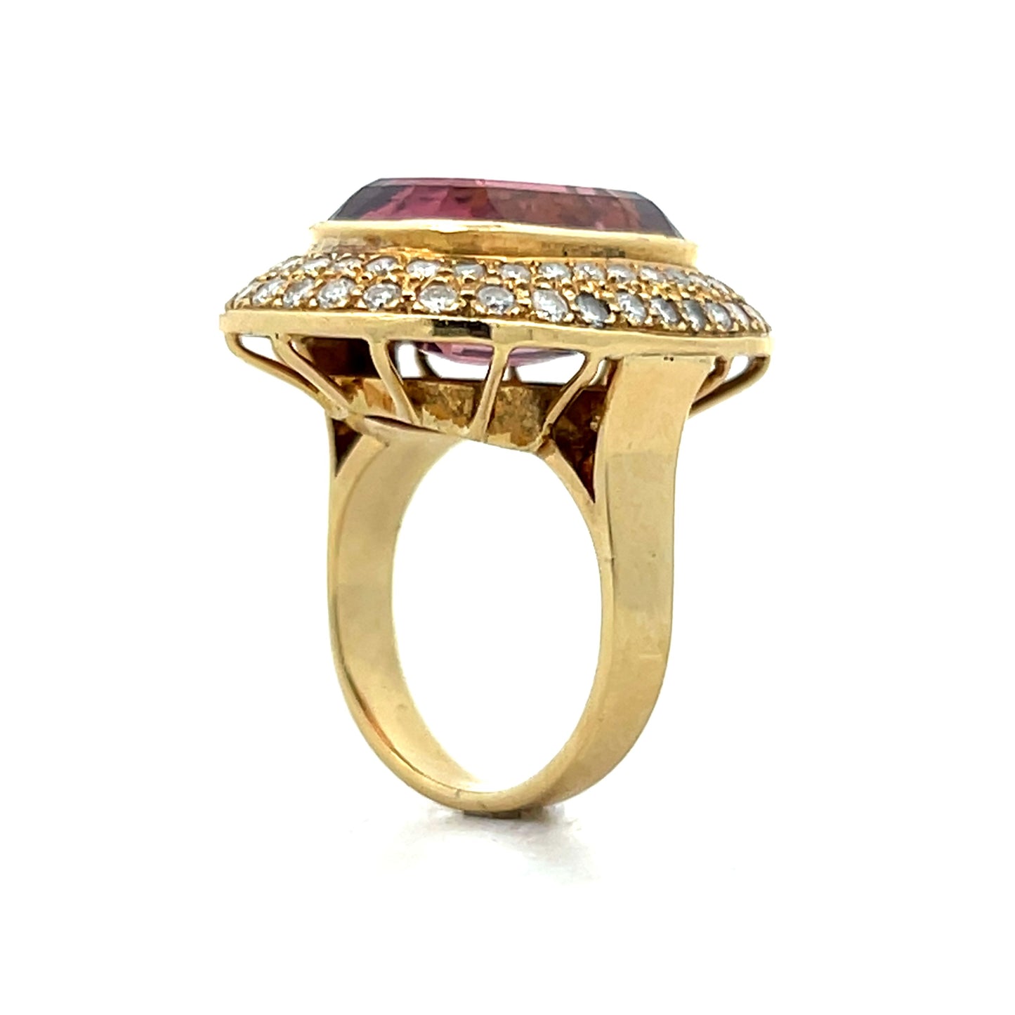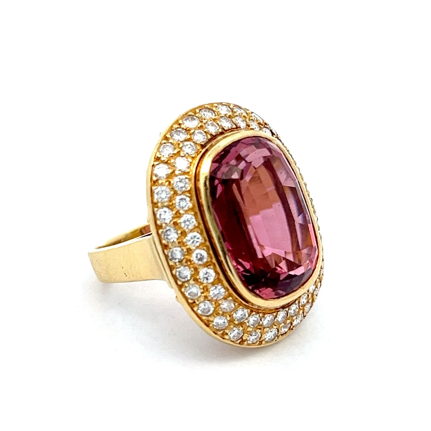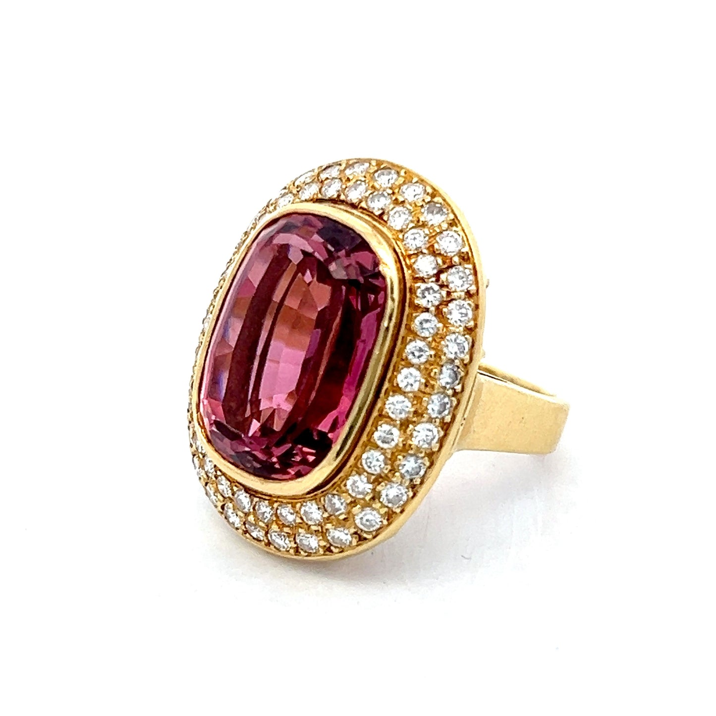 This cocktail ring features a 13.70-carat oval cut pink tourmaline, bezel set in 18-karat yellow gold. The center stone is surrounded by two layers of diamond pave halos, totaling 64 diamonds with a combined weight of 1.28 carats. The ring's bold design highlights the vibrant color of the tourmaline and the brilliance of the diamonds, creating a striking visual effect. A truly gorgeous statement ring.