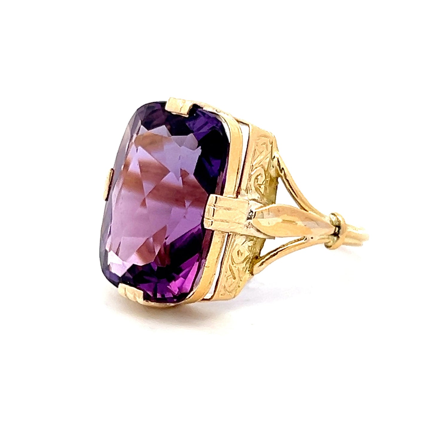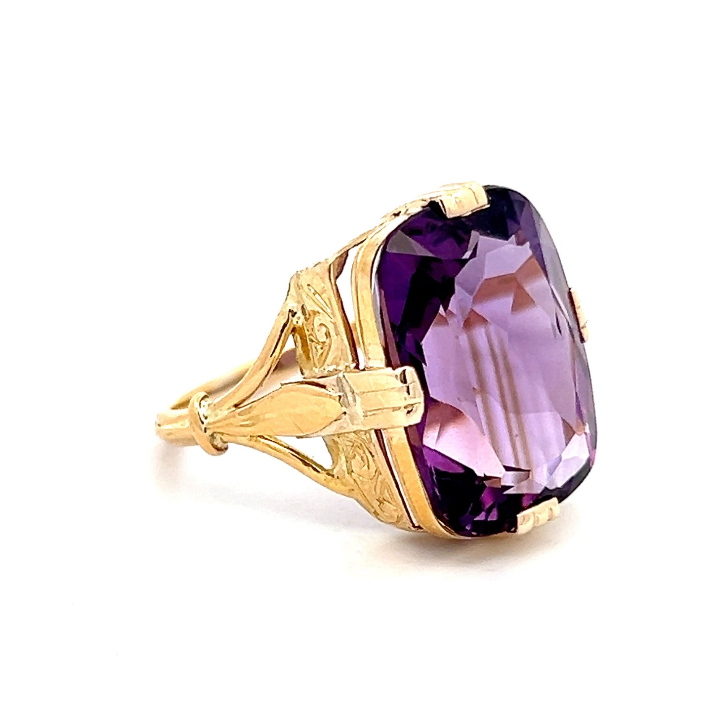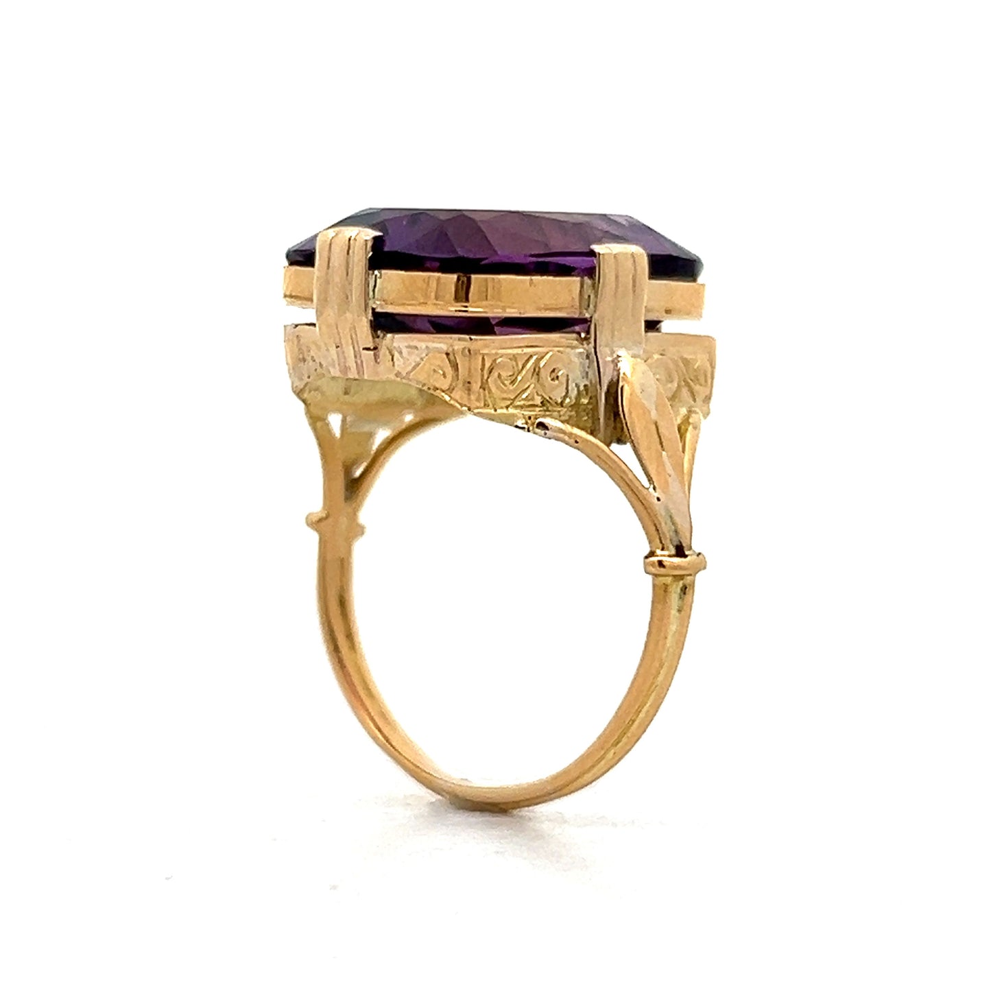 Make a statement with this Retro cocktail ring! Crafted from rich 18 karat yellow gold, this vintage piece features a stunning cushion-cut amethyst at its center. The vibrant purple gemstone is a substantial 13.85 carats, displaying a mesmerizing checkerboard faceted pattern. Held securely in a four-prong setting, the amethyst is elevated by an intricately engraved mounting, adding a touch of elegance to the piece. With its polished yellow gold finish, this cocktail ring is sure to turn heads and add a touch of vintage glamour to any outfit.