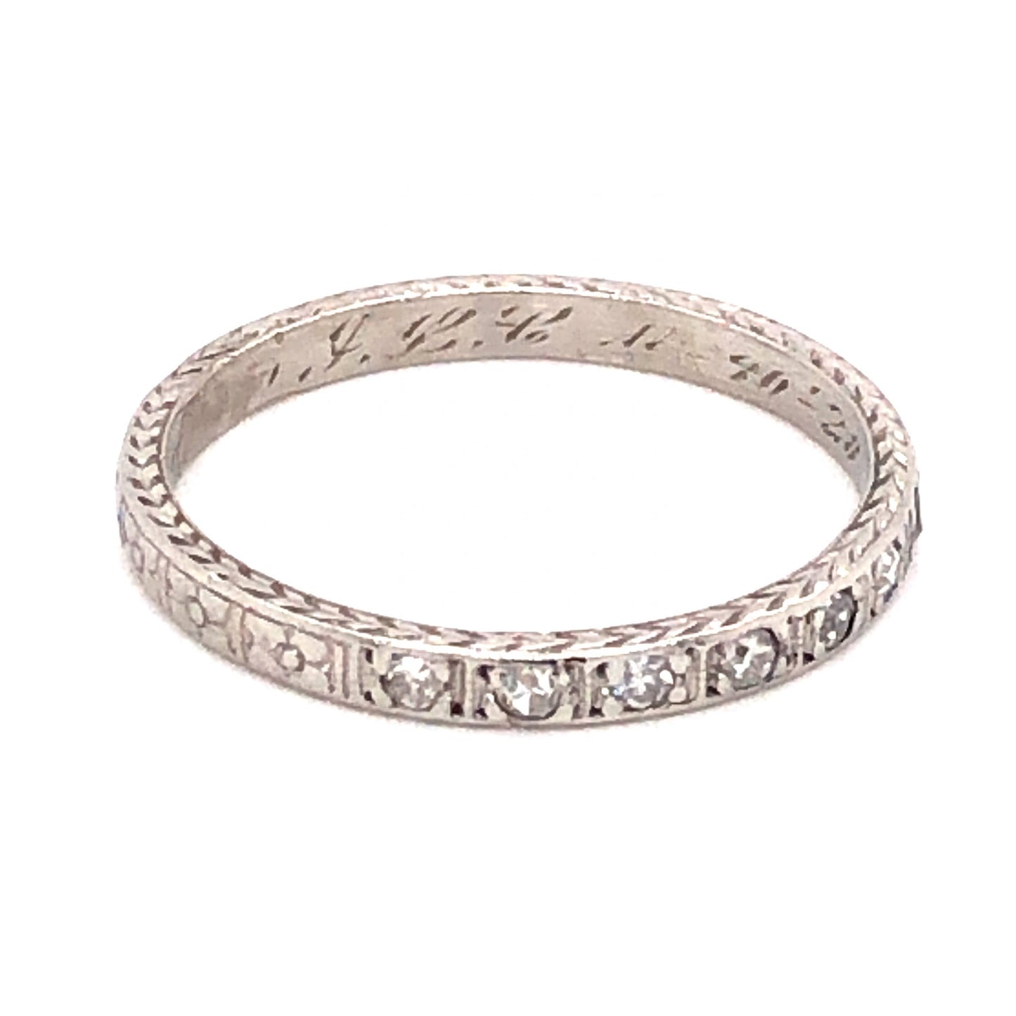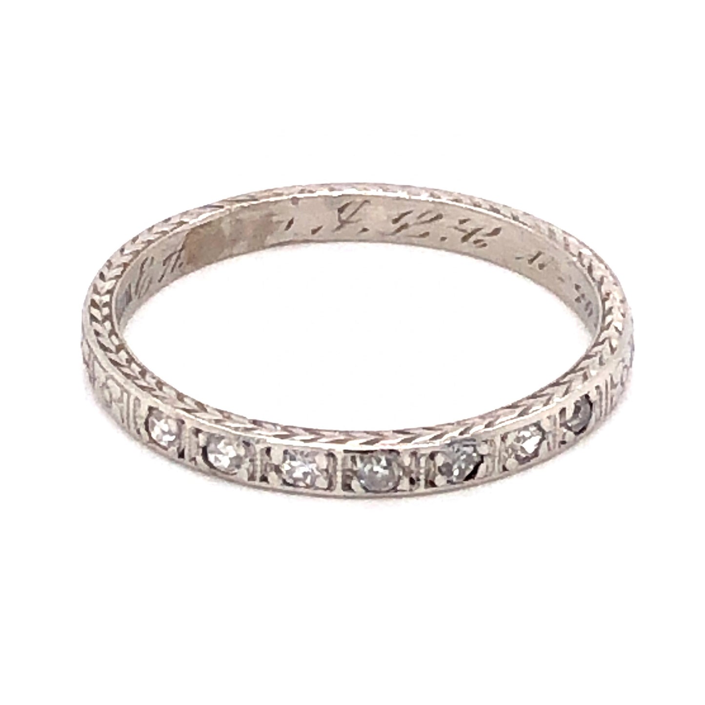 .13 Art Deco Diamond Wedding Band in Platinum. This Art Deco wedding band features .13 carats of diamonds finished in shimmering platinum. Seven (7) .018 carat diamonds, each near colorless and highly brilliant, are mounted on a geometric Art Deco band. The flat profile of the ring features chevron and flower engravings that can be admired from all angles. This breathtaking diamond wedding band is 2.15mm wide and can be resized upon request.