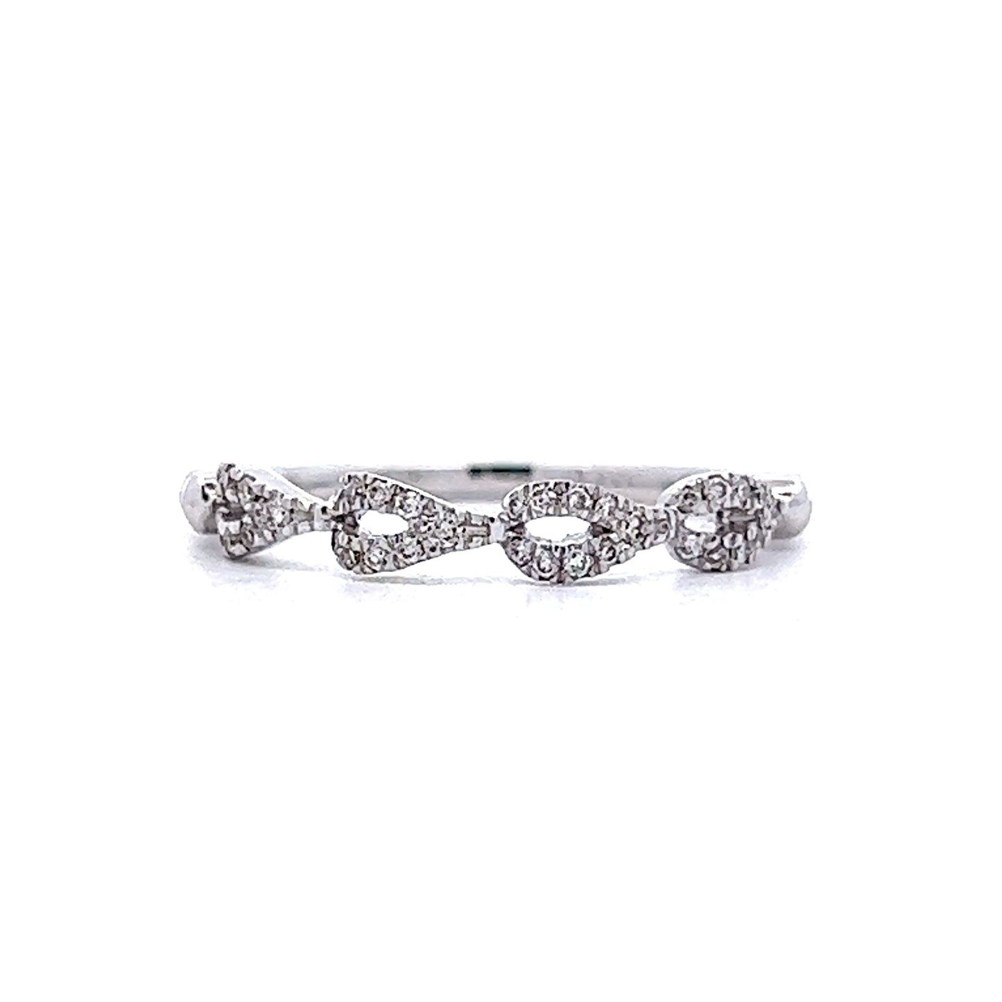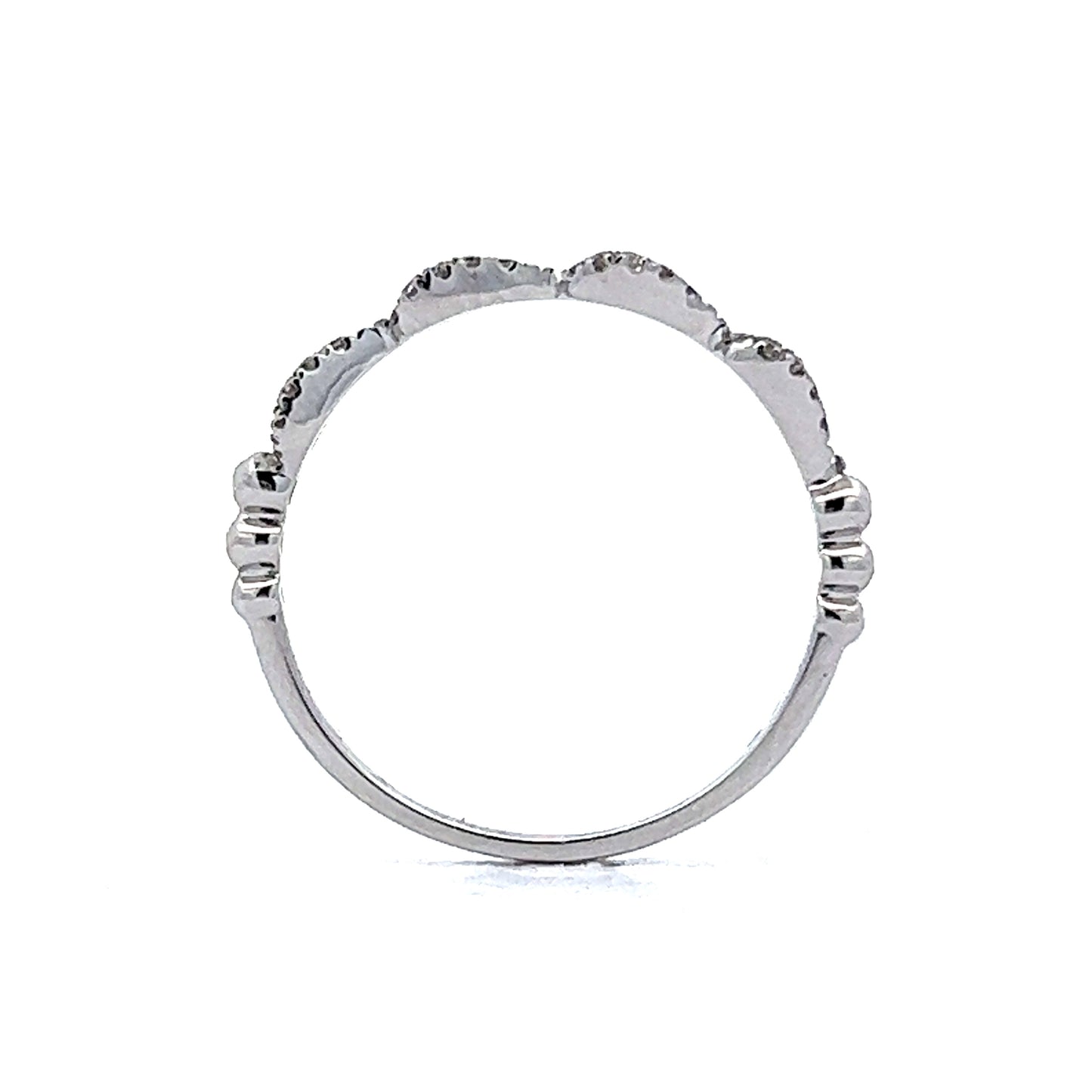 This stunning wedding band features .13 carats of pave set diamonds in 14 karat white gold. On the front half of the geometric band, four (4) .0075 carat diamonds are set at the end of the eyelet shapes. Thirty-two (32) accent diamonds decorate the front of the band in half-eternity style. Beautiful sphere engravings decorate the shoulders of the 14K white gold band.