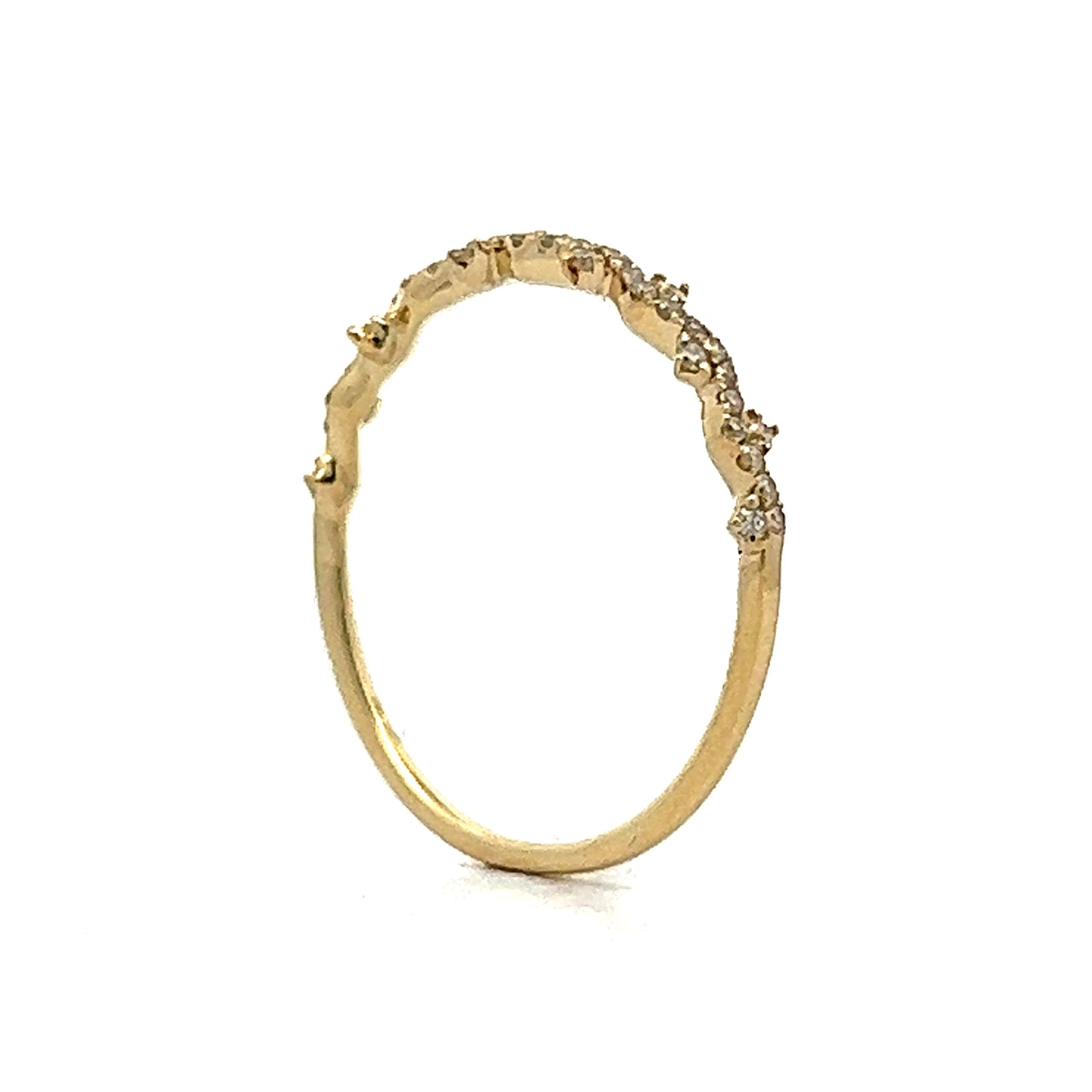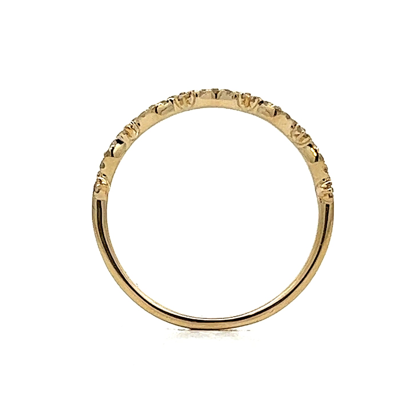 This dainty and stylish By Filigree wedding band features .13 carats of diamonds in 14 karat yellow gold. Thirty-two (32) .0031 carat diamonds, each near colorless and eye clean, are set in a beautiful zigzag pattern along the front half of the ring. The diamonds are collectively brilliant, bringing a bright and dazzling contrast to the warm 14K yellow gold setting. This custom wedding band will look stunning with most engagement rings. A half-eternity ring with a fashion sense, this petite and shimmering wedding band would also make a lovely everyday stacking ring!