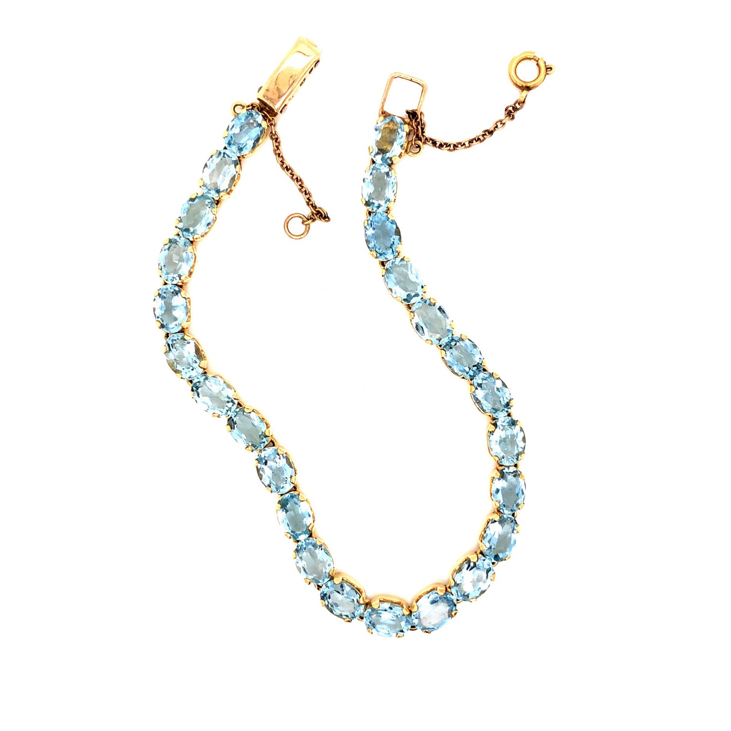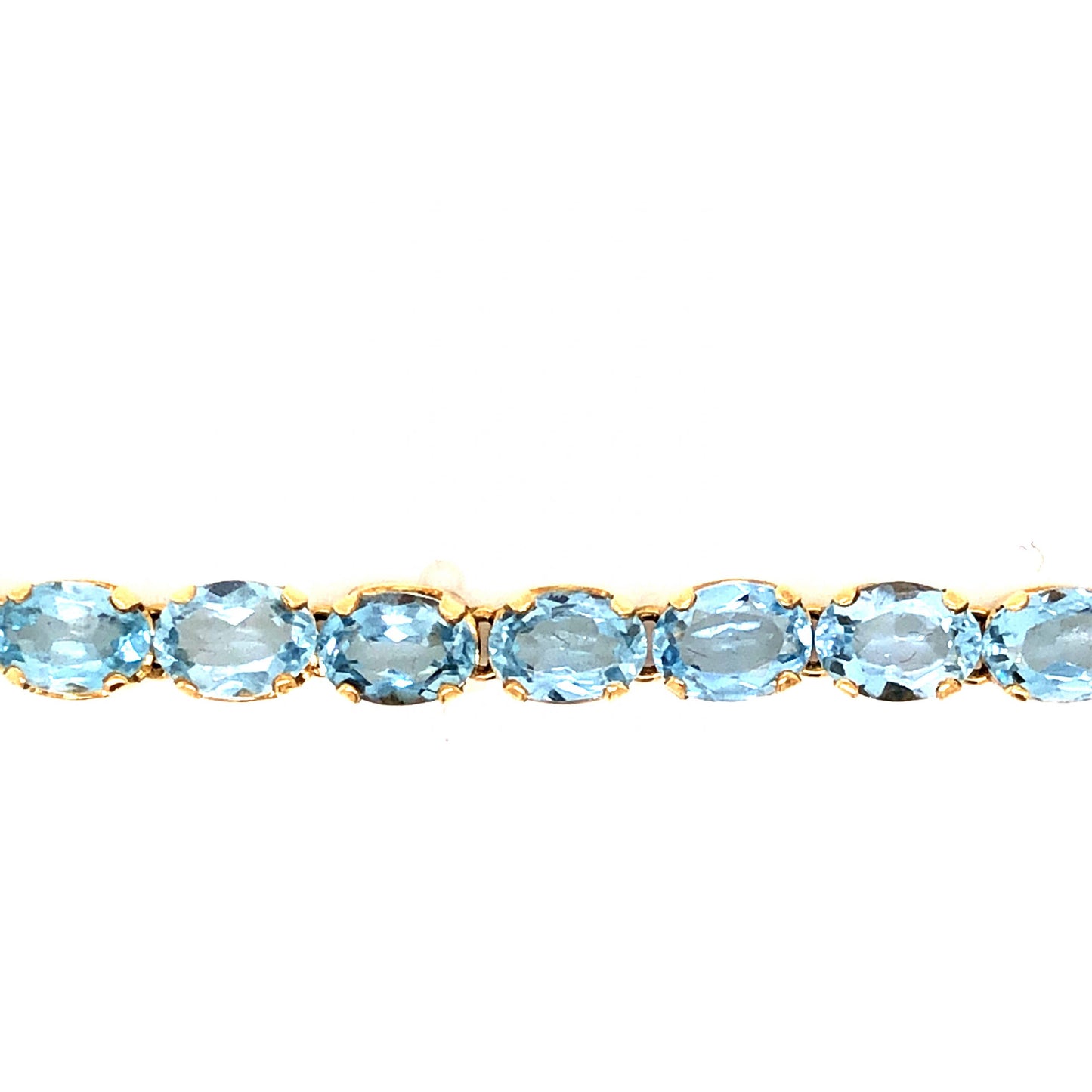 14.00 Oval Cut Aquamarine Bracelet in 18k Yellow Gold. This 7” modern bracelet features 14 carats of aquamarines finished in 14 karat yellow gold. Twenty-five (25) .56 carat icy-blue aquamarines are prong set in yellow gold. Finished with a box clasp and an additional spring ring for safety, this streamlined and effortlessly chic bracelet is a vision of beauty in blue!