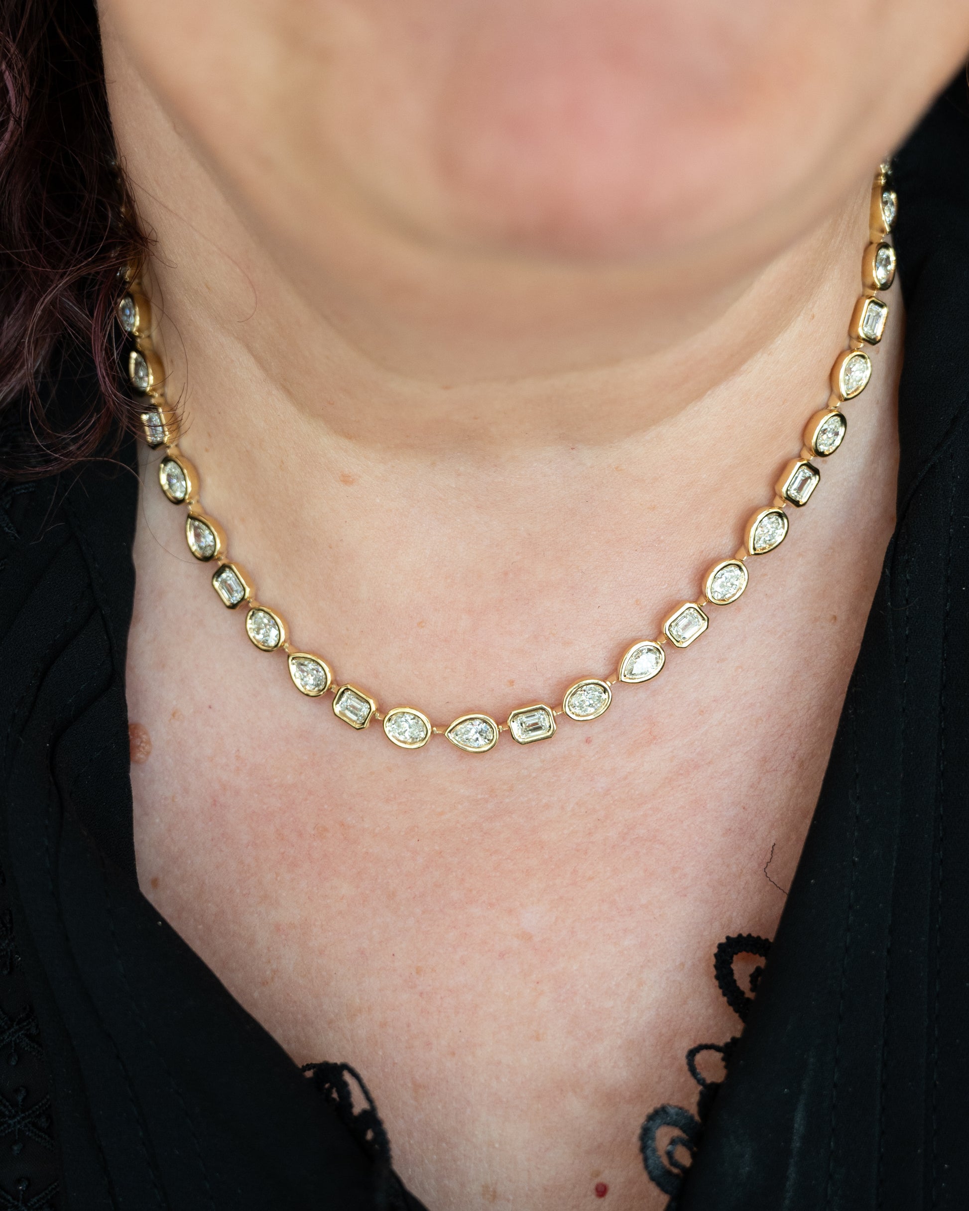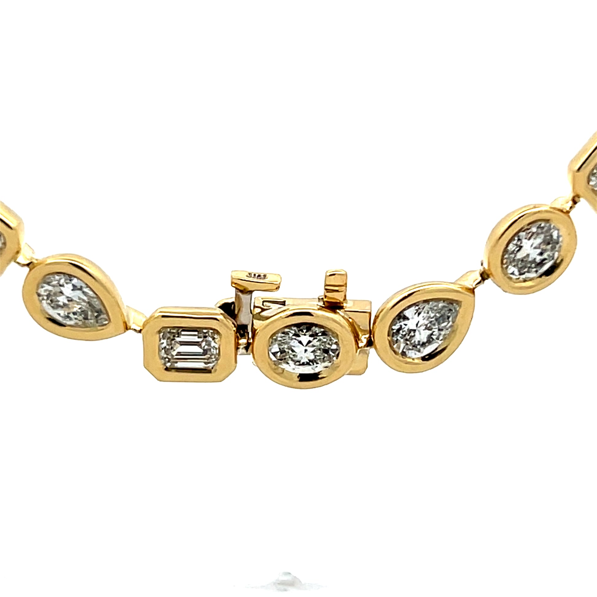 This 16-inch statement necklace features 48 natural diamonds totaling 14.44 carats, with pear, oval, and emerald cut stones bezel-set in 18 karat yellow gold with a high polish finish. The mixed diamond cuts create variety throughout the piece. Forty-eight GIA-certified stones line the necklace from end to end.
