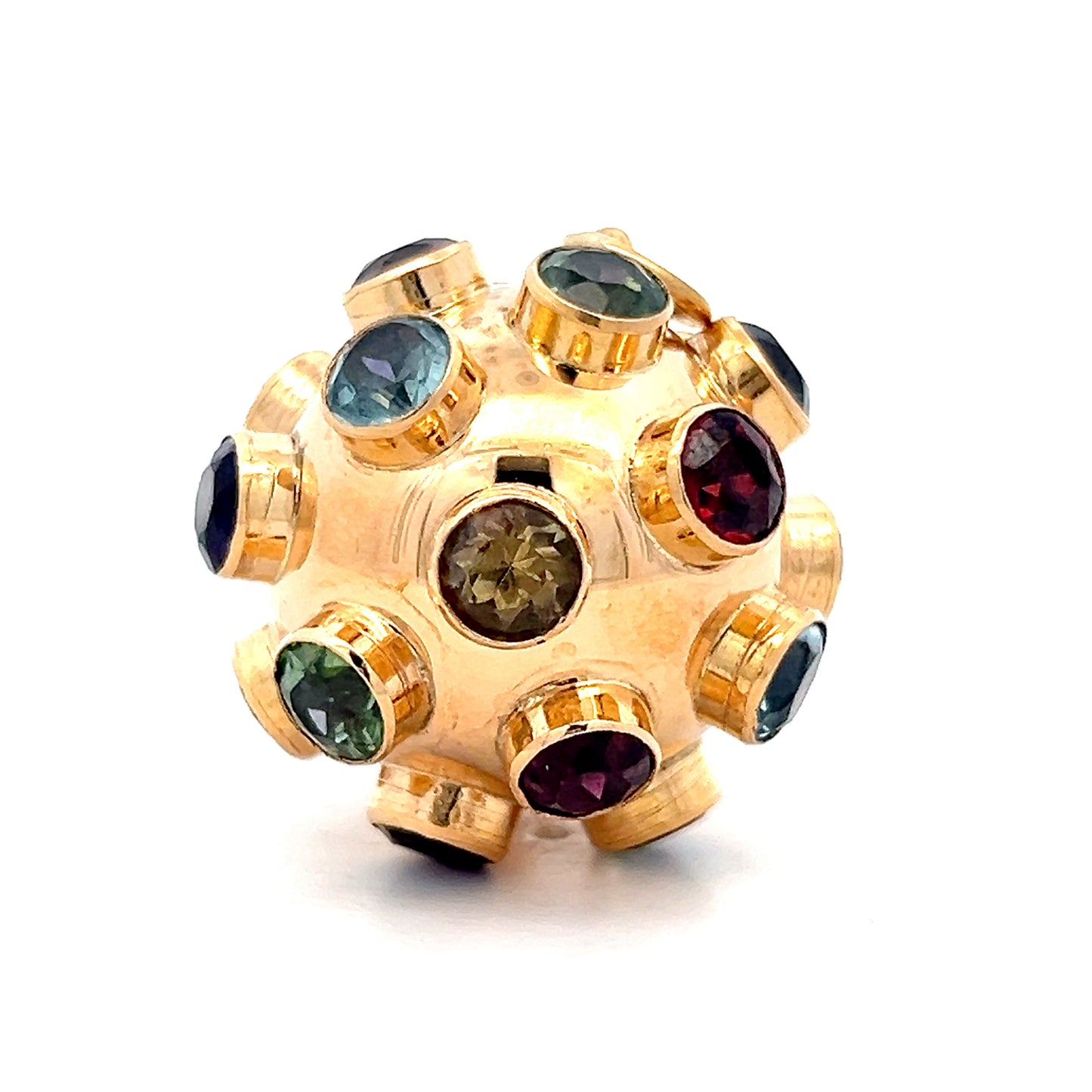 This Mid-Century pendant necklace is all about vibrant color. Crafted in 14 karat rose gold, the Sputnik-style pendant features 14.70 carats of garnet, peridot, aquamarine, amethyst, tourmaline, topaz, and citrine gemstones. Each stone measures 5.5mm and weighs .70 carats, creating a starburst pattern that radiates color and sparkle. The warm rose gold setting contrasts beautifully with the colorful stones, adding depth to the overall design.