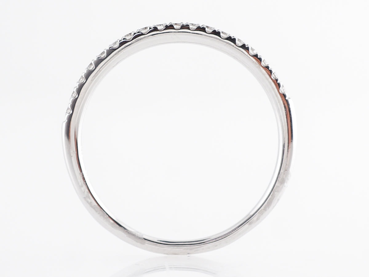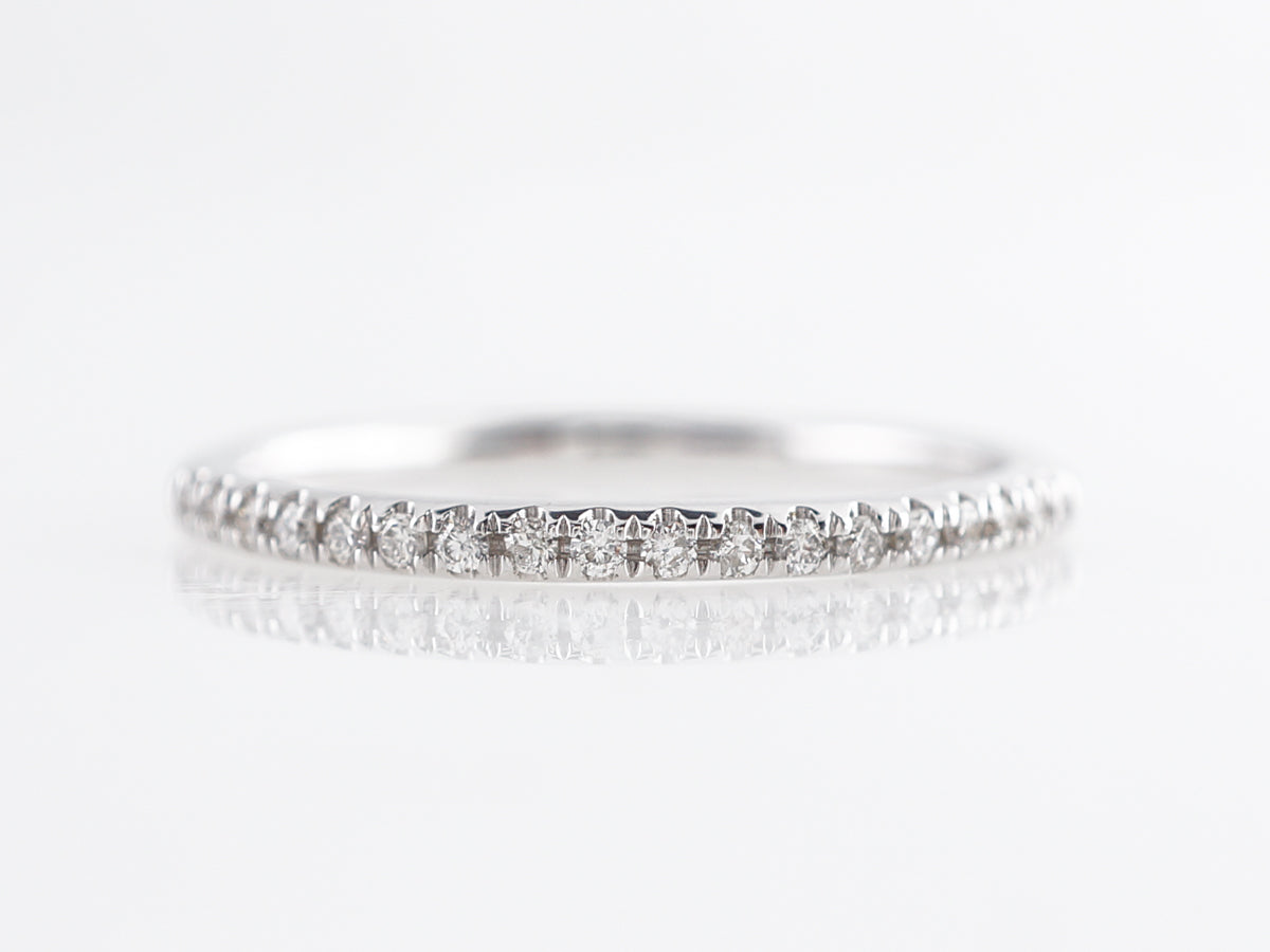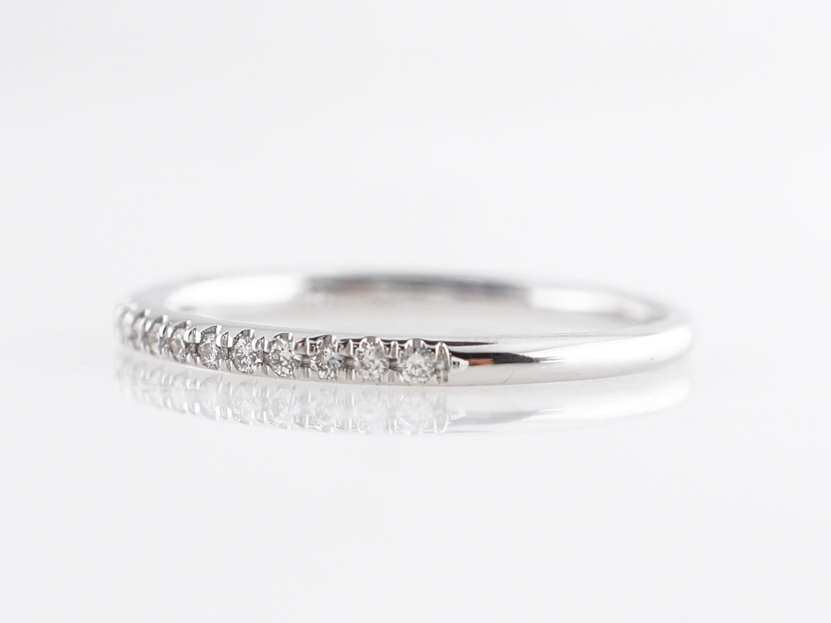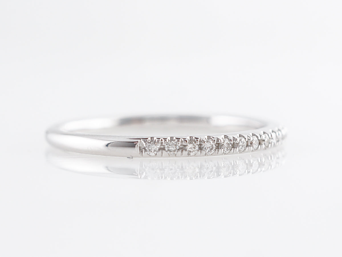 Dainty & stylish. This simple wedding band is finished in 14 karat white gold and contains .14 carats of round brilliant cut diamonds. An clean and elegant way to add sparkle to a solitaire engagement ring.