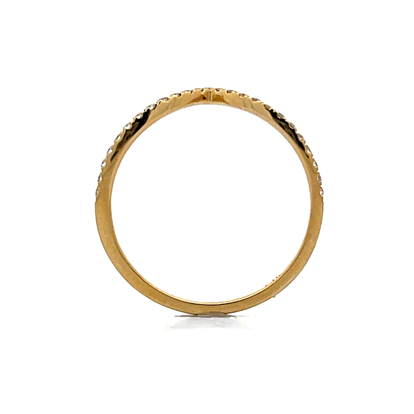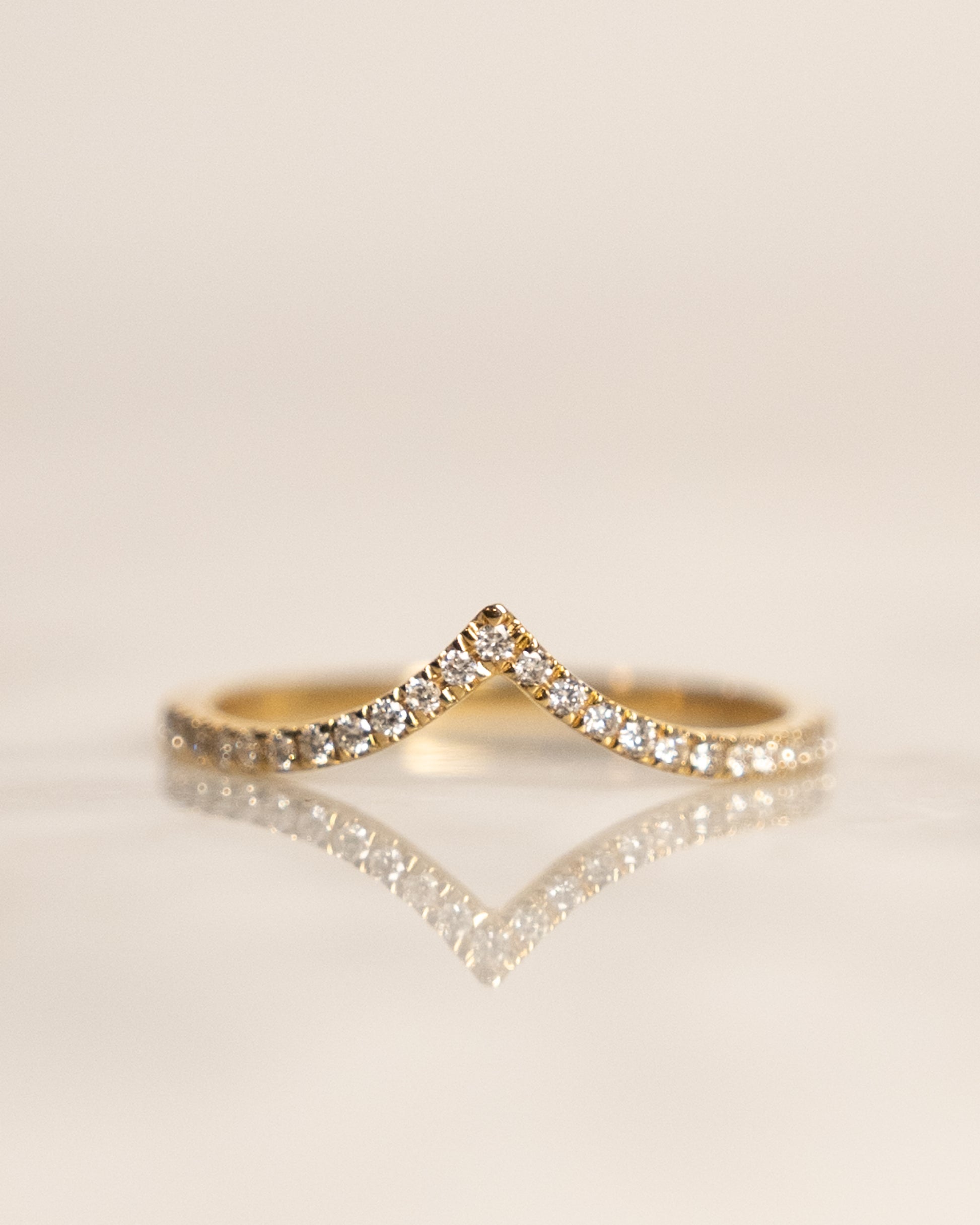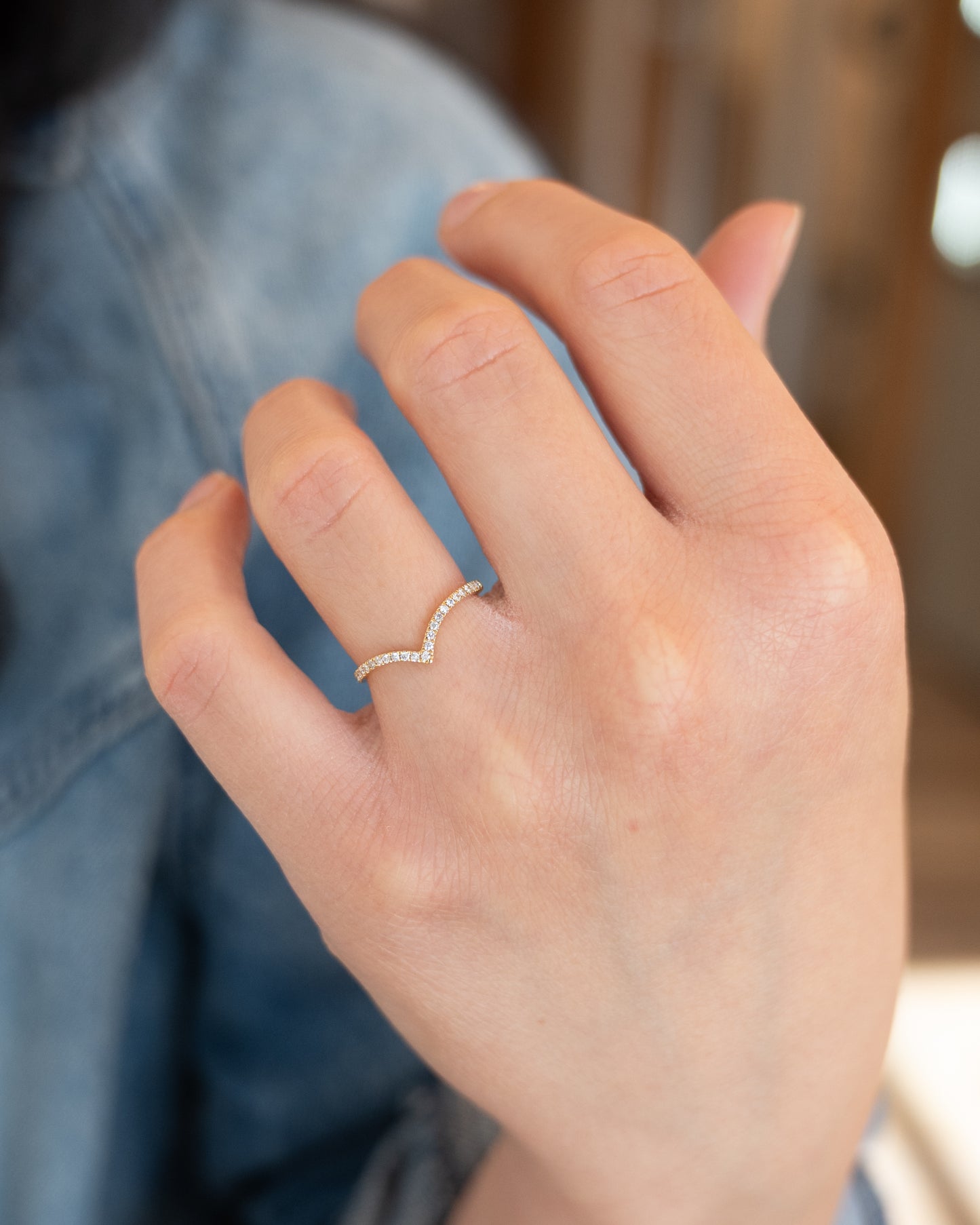 The v-shaped diamond pattern creates a dramatic look while maintaining a comfortable fit for everyday wear. This gold band with diamond accents works well as either a standalone ring or paired with engagement rings and other bands for a more layered look.