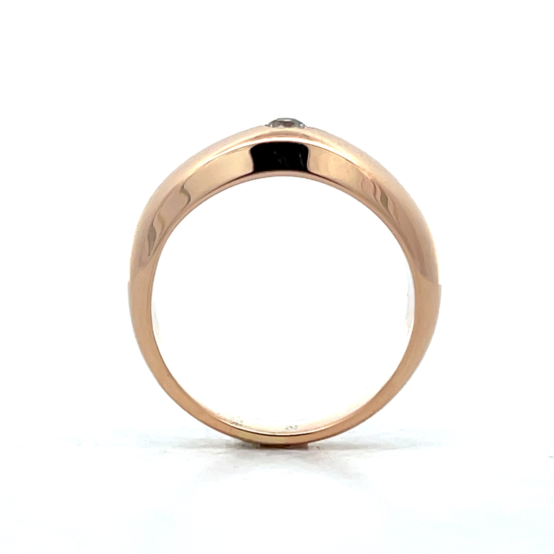 This Victorian era ring features an old mine cut diamond (.14 carats, SI1 clarity, I color) flush set into a 6.7 mm wide tapering band of 14 Karat Rose Gold. The rose gold's subtle pink undertone provides a flattering background for the slightly warm-tinted diamond, creating a cohesive color story that feels both rich and understated. The substantial band tapers gracefully, balancing visual weight with comfortable wearability in a way typical of thoughtful Victorian craftsmanship.
