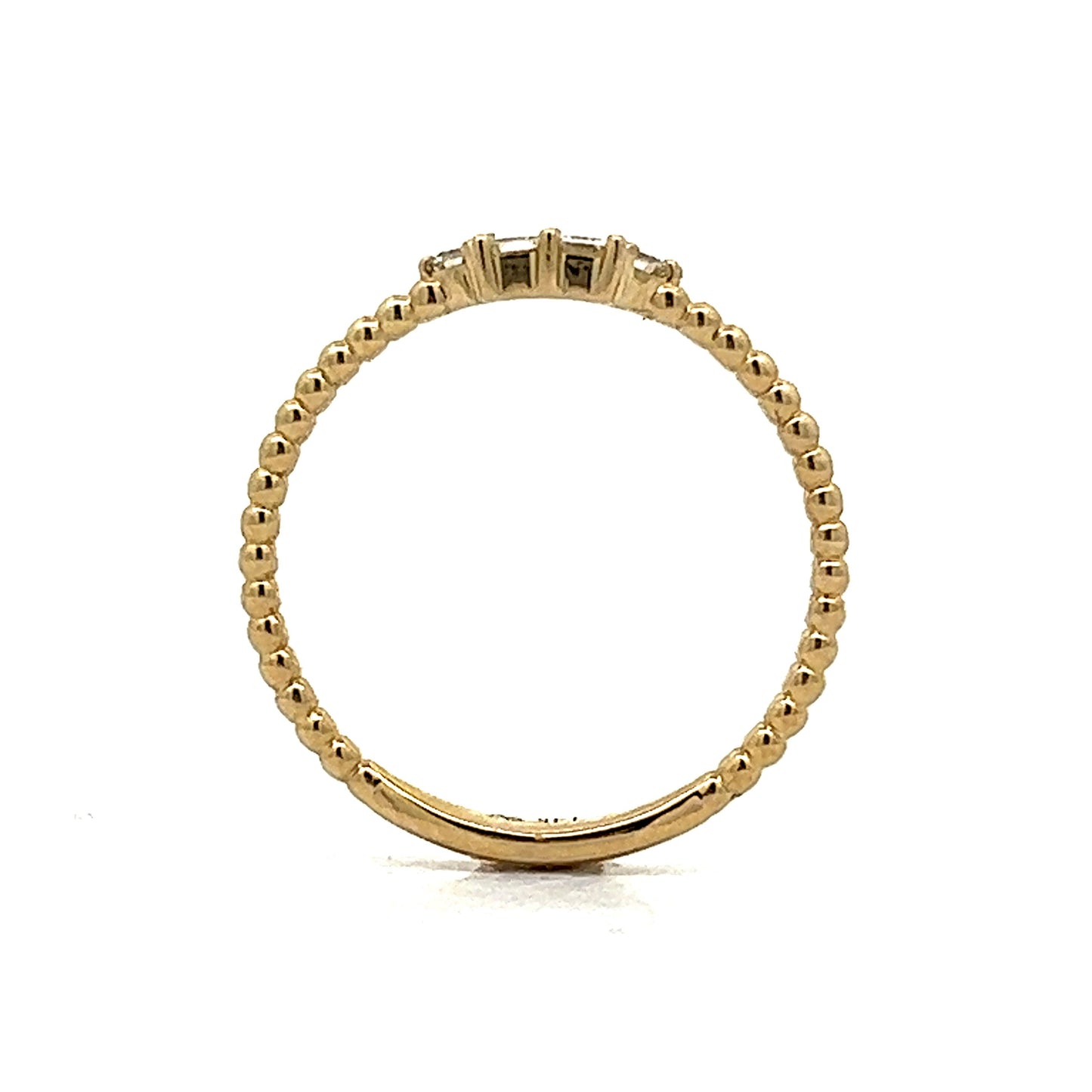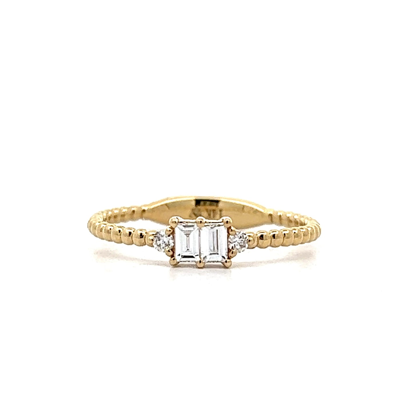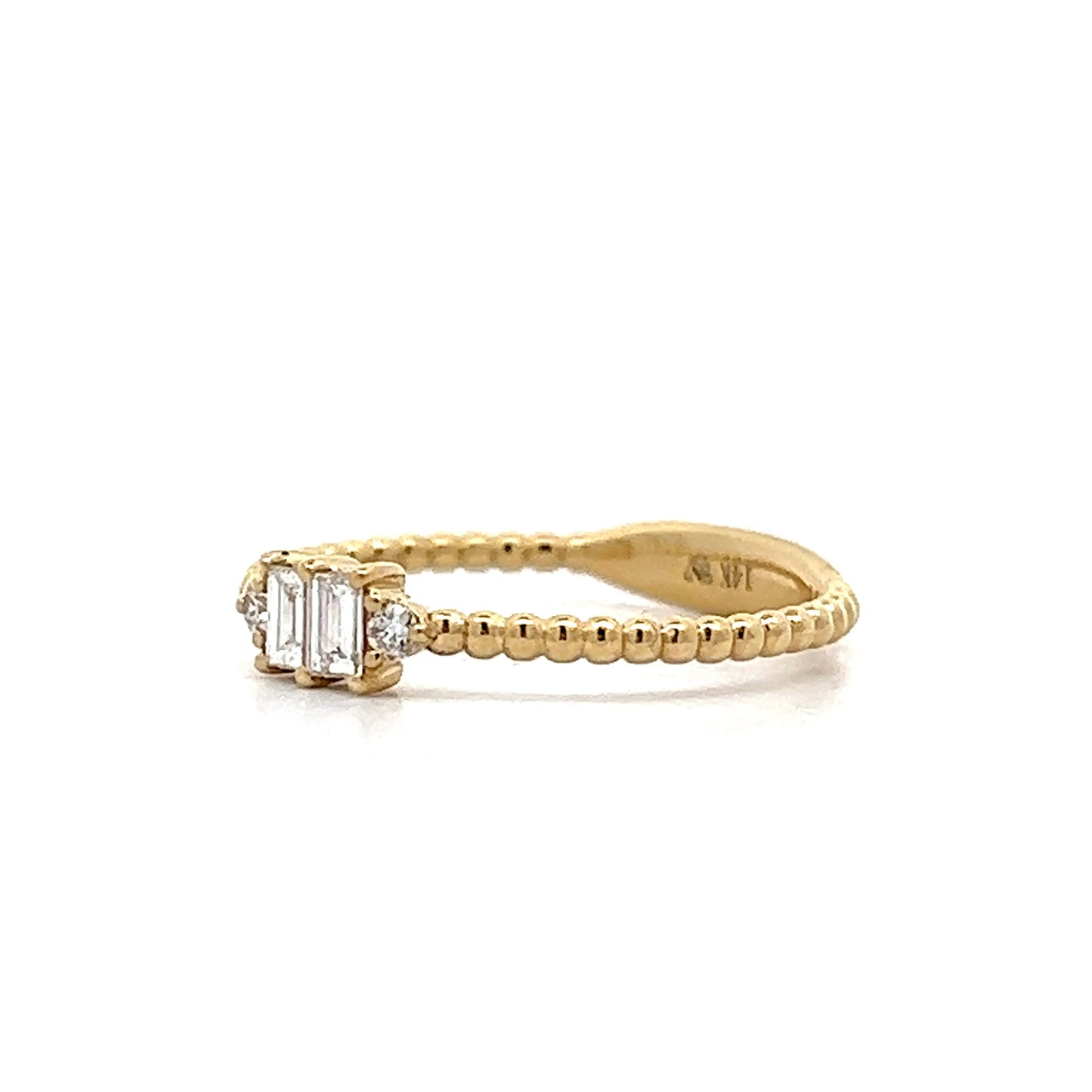 This modern stacking ring will add some sparkle to your look! Two baguette diamonds and two round brilliant diamonds make up the focal point of this sparkly piece. Crafted in 14 karat yellow gold, the two baguette diamonds have a clarity of SI1 and a color of H. Accenting the baguettes are two round diamonds weighing .04 carats each and measuring 1.75 mm. The band of the ring is adorned with a bead texture and finished in highly polished yellow gold.